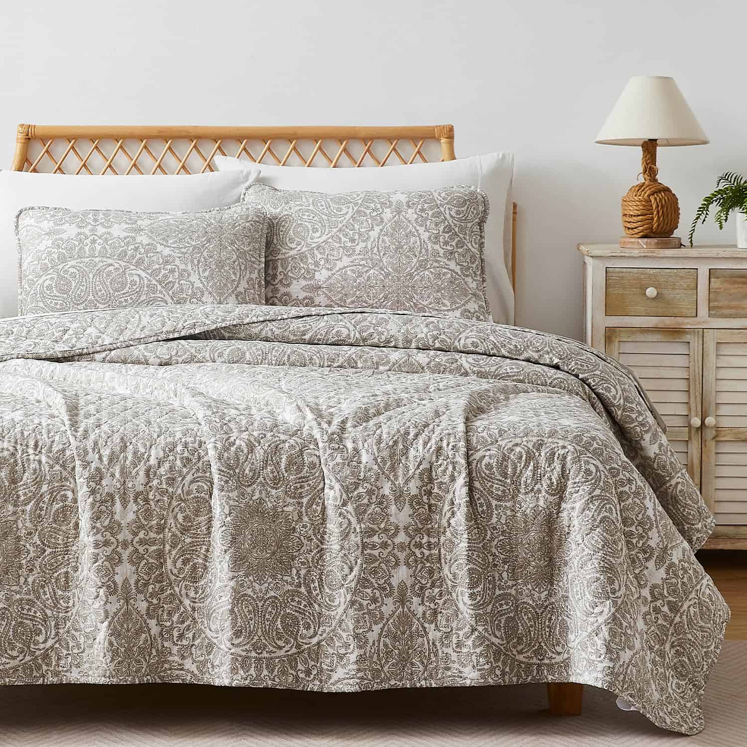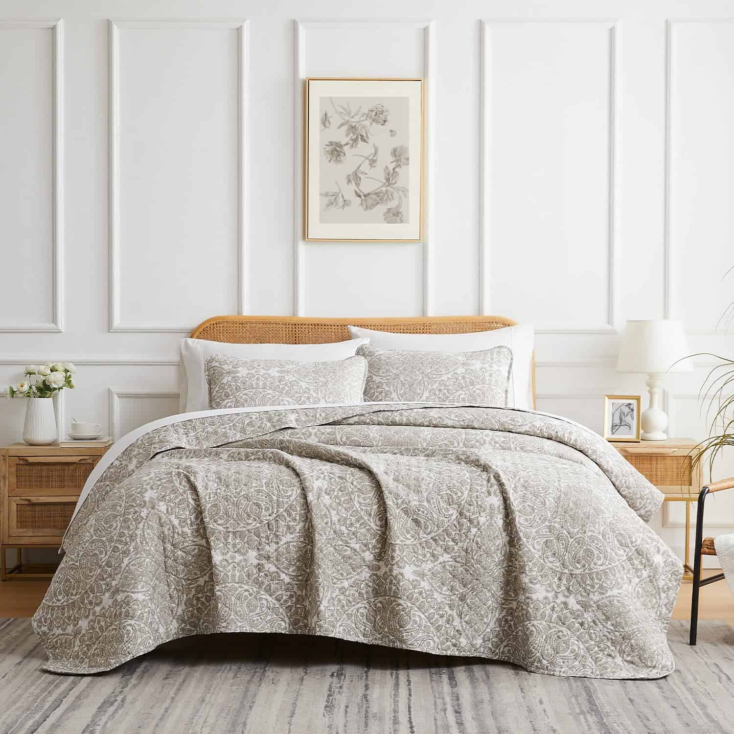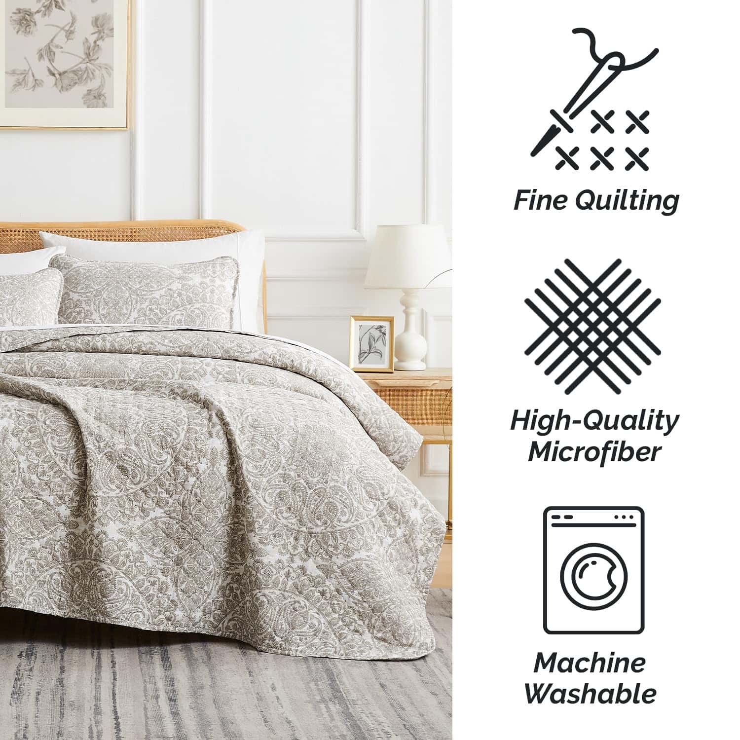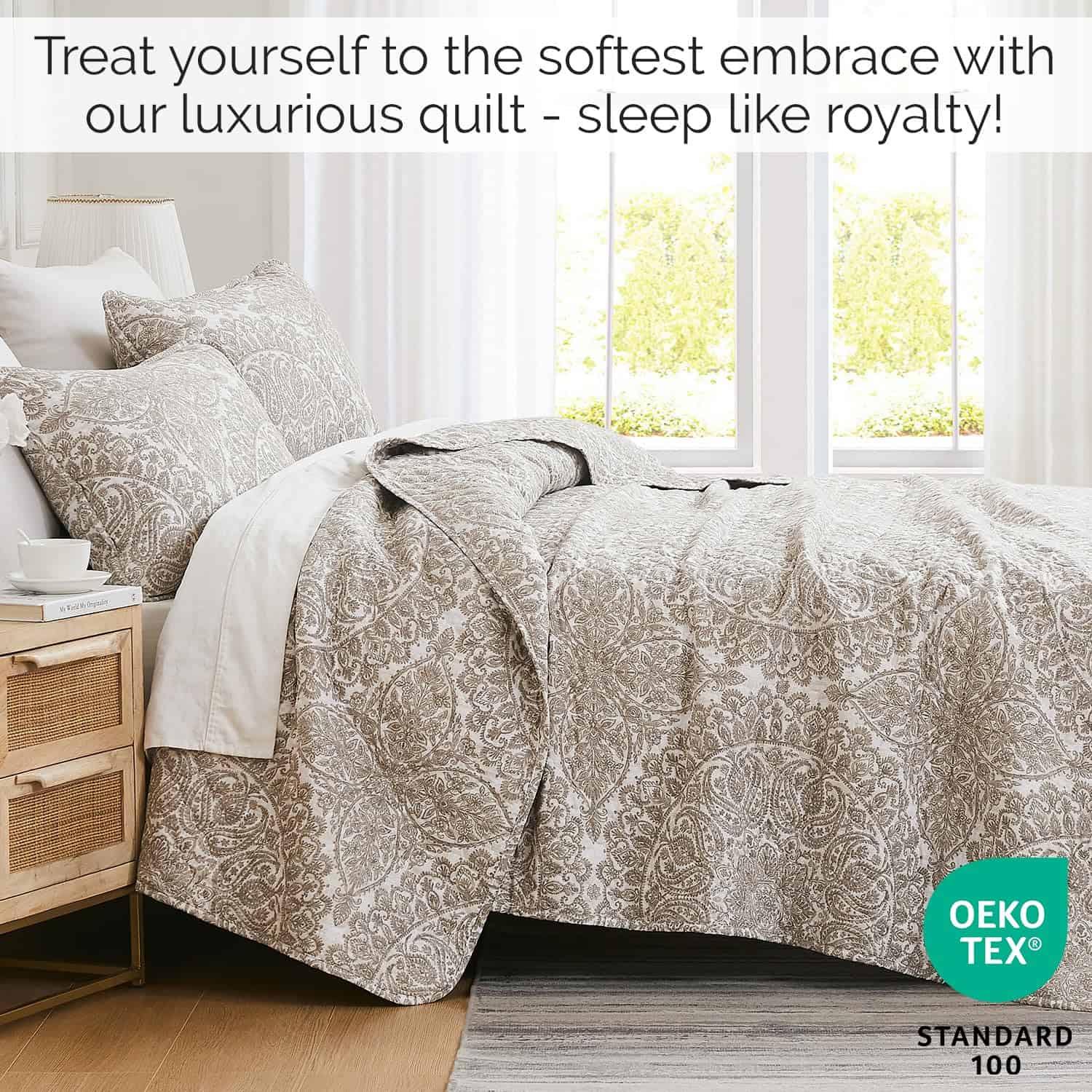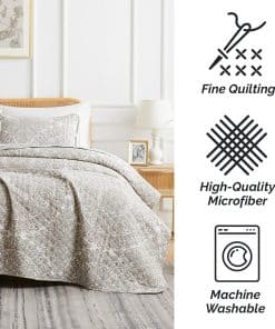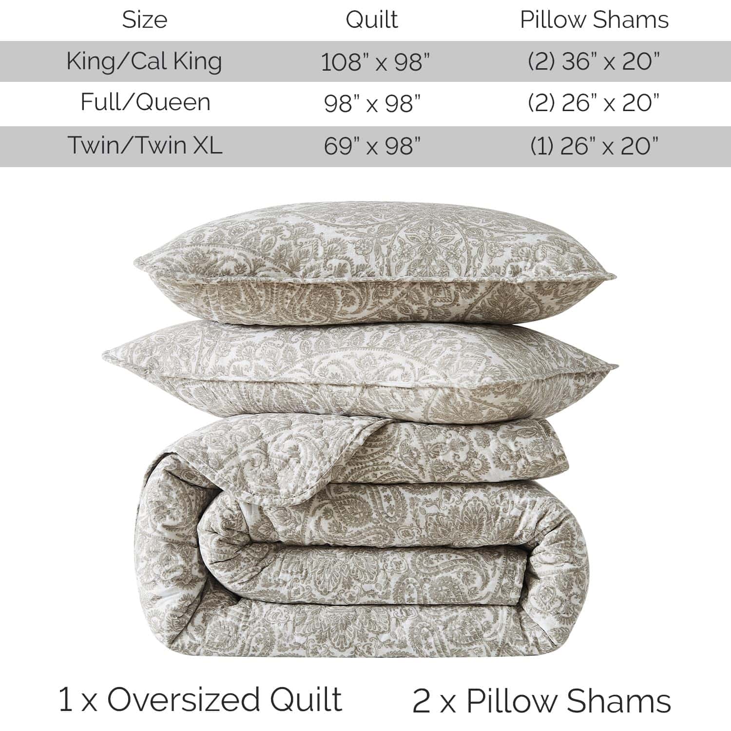 1. ¿Buscas actualizar tu dormitorio con un juego de colcha king de calidad sin gastar mucho dinero Nuestros sets de colcha oversized son la opción perfecta. Estos juegos de colchas king ligeros son de alta calidad, extra suaves, bellamente bordados y vienen con fundas a juego. Estos sets de colcha California king están hechos con nuestro suave tejido de microfibra de firma y son ropa de cama fácil de cuidar. Estas colchas king para la cama son oversized. 2. El set de colcha tamaño King y California King es un set de 3 piezas y contiene una colcha: 108 pulgadas de ancho x 98 pulgadas de largo y dos fundas acolchadas: 20 pulgadas de ancho x 36 pulgadas de largo. Tanto las colchas como las fundas están acolchadas en ambos lados. Las fundas tienen un cierre de sobre y ocultan completamente tus almohadas. Estos sets de colchas king oversized están hechos con tejido de microfibra suave que sigue suavizando estos cobertores de cama ligeros con cada lavado. 3. Artesanía de alta calidad: Tejido con hilos de microfibra suave de doble cepillado, este set de ropa de cama de colcha seguirá suavizando con cada lavado. Este set de colcha tiene un ajuste de puntadas bordadas. Hay tantas formas en que estos sets de colcha California king se pueden usar. Esta colcha oversized king es perfecta para cualquier tipo de decoración, ya sea ropa de cama de estilo farmhouse, boho o decoración moderna, transformará al instante tu dormitorio. 4. Estos sets de colchas ligeros y oversized se pueden usar solos o como capa con otras prendas de cama. Estos sets de colchas y cobertores king y California king se pueden utilizar en cualquier tipo de decoración. Se pueden usar fácilmente en un entorno de loft urbano chic, ropa de cama de estilo farmhouse, decoración country francesa, estilo de ropa de cama bohemia o en un entorno minimalista simple. El juego de edredón y el juego de funda de edredón tamaño king a juego también están disponibles por separado. 5. Estos sets de colchas oversized son resistentes a las arrugas, decoloración y formación de bolitas. Estos sets de cobertores California king son de alta calidad y están hechos con nuestro exclusivo tejido de microfibra de doble cepillado lujoso y suave, proporcionando una suavidad y suavidad sustancialmente mayores. Estos sets de cobertor king son lavables a máquina.
