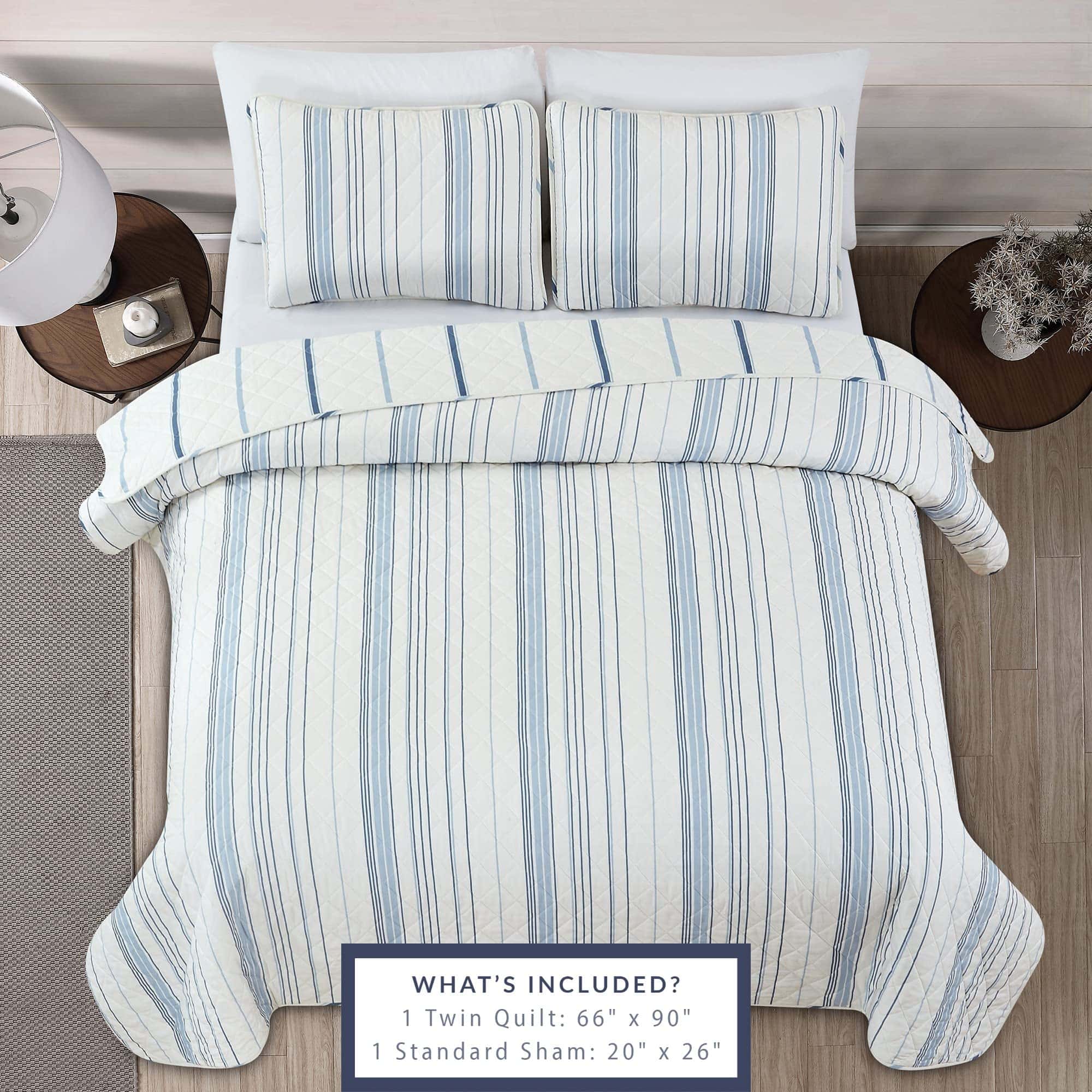 3. ¿QUÉ SE INCLUYE?: El set de tamaño Twin incluye una Colcha (90 x 66″) y una Funda de Almohada Estándar (20 x 26″).