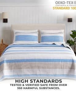 Este set de colcha incluye una colcha tamaño Full / Queen de 90″ x 90″ y 2 fundas estándar de 20″ x 26″. La colcha cuenta con una construcción gruesa pero ligera, perfecta para superponer. Fabricada con material microfibra de alta calidad que es suave y cómodo, ideal para uso durante todas las estaciones. Relleno de 120 GSM 100% Poliéster y cubierta de 90GSM 100% Microfibra. Lavable a máquina y fácil de cuidar. No tenga miedo de lavar estos sets de colcha, simplemente lávelos con agua tibia y séquelos a baja temperatura. Incluso se puede planchar a fuego lento si es necesario para lograr esa sensación de ropa de cama de hotel. Material duradero y de alta calidad, diseñado para un uso duradero y disfrute. La satisfacción del cliente es nuestra máxima prioridad. Confiamos en que le encantarán nuestros sets de colcha y otros productos de ropa de cama, pero si no está satisfecho, nuestro equipo de servicio al cliente trabajará con usted para solucionarlo. Encuentre su combinación perfecta de ropa de cama en una de nuestras colecciones.