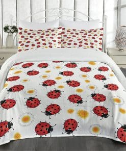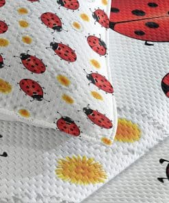 El set de colchas Lunarable Ladybugs tamaño Queen presenta un diseño encantador con un motivo de verano que incluye catarinas y flores de manzanilla en flor. Incluye 1 colcha queen de 88″ X 88″ y 2 fundas de almohada de 30″ X 20″. Esta colcha extragrande brinda una excelente cobertura a lo largo de los lados de la cama, y está fabricada con poliéster suave de alta densidad cepillado doble para ofrecer una suavidad óptima y una comodidad definitiva. Su peso pesado garantiza que no se caerá fácilmente de la cama y puede ser utilizada como una manta. La tecnología de tejido de alta calidad permite un fácil lavado a máquina en ciclo frío, es seguro para la secadora y se plancha fácilmente sin decoloración. Esta colcha y las fundas de almohada están impresas con tecnología digital de última generación solo en el lado frontal, lo que garantiza una impresión nítida y duradera.
