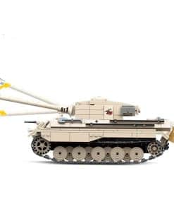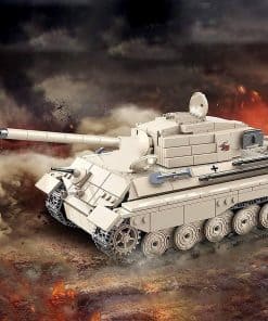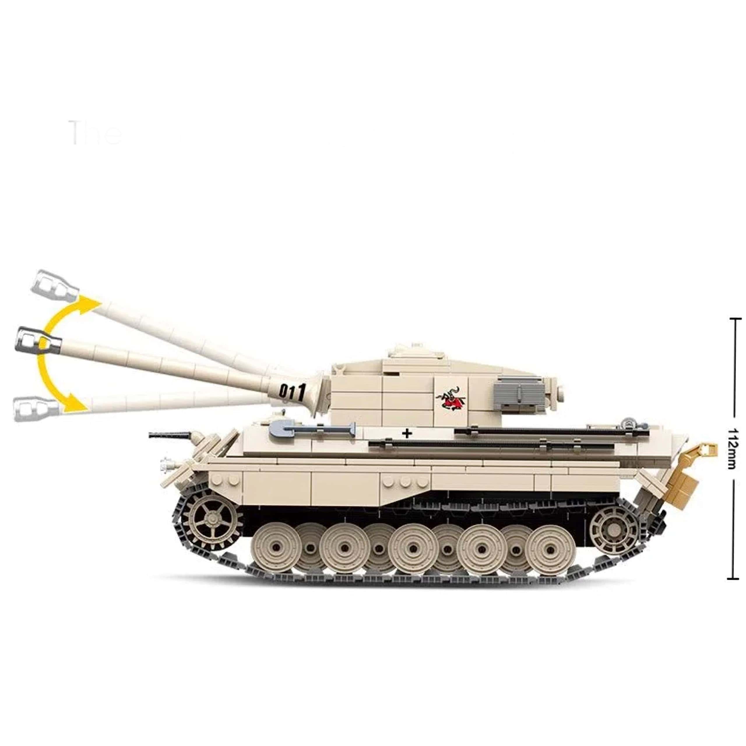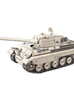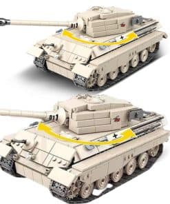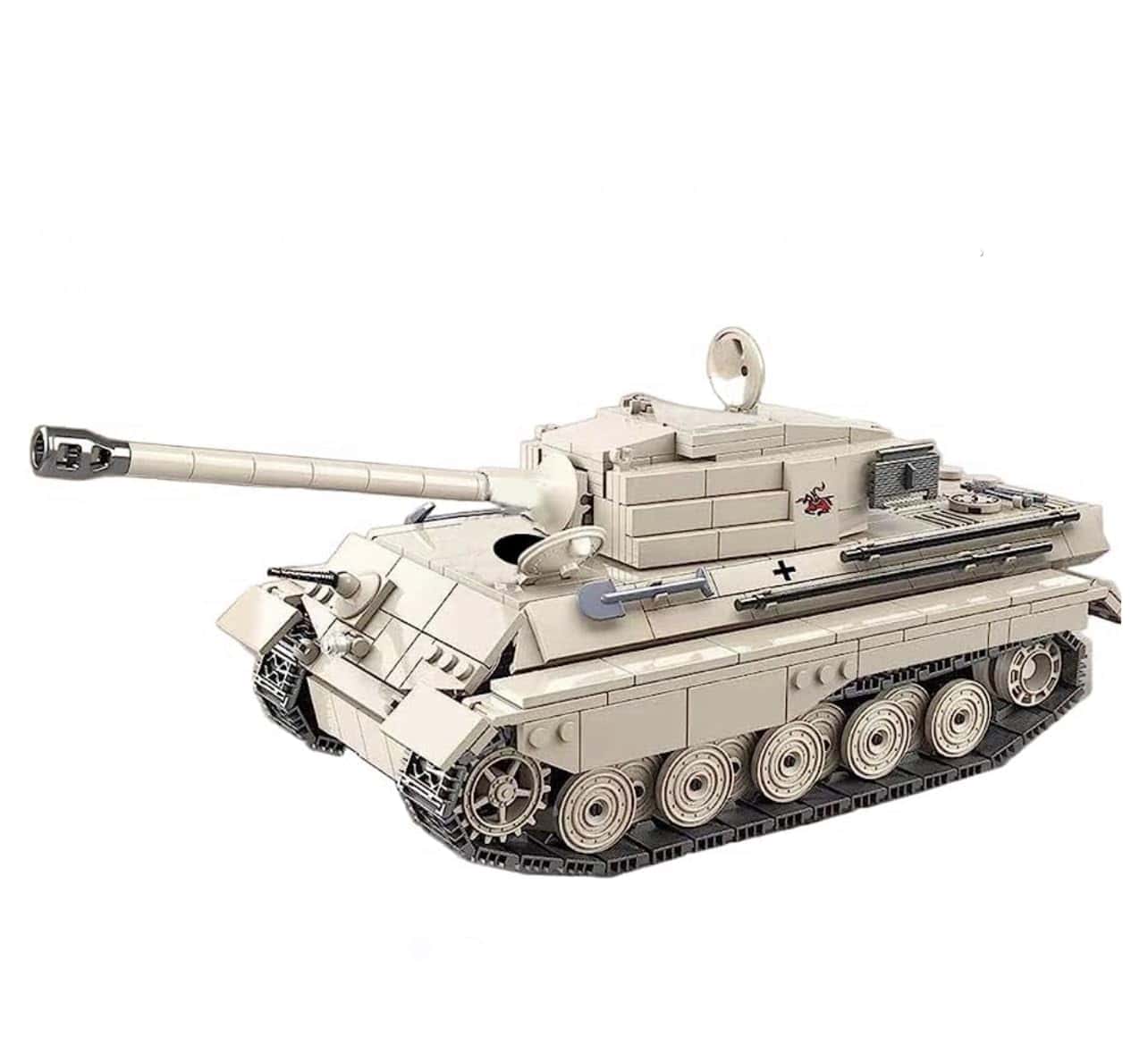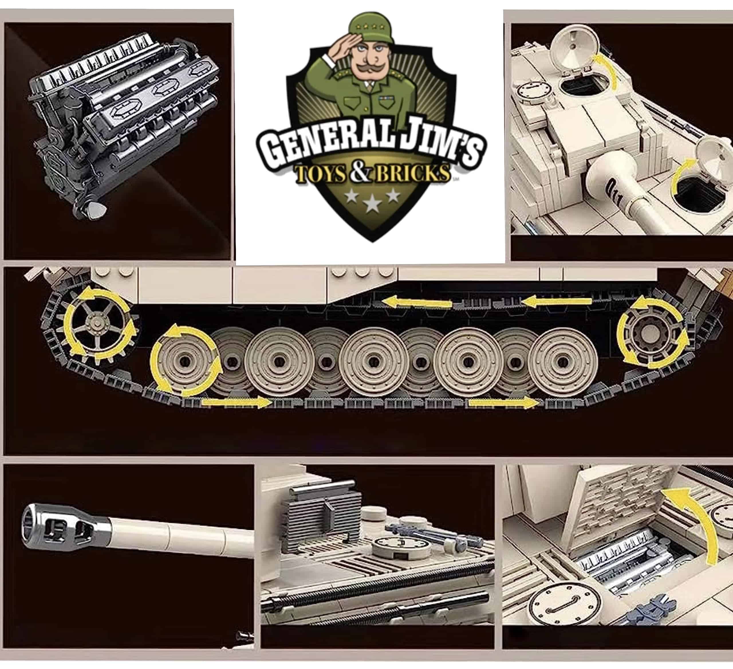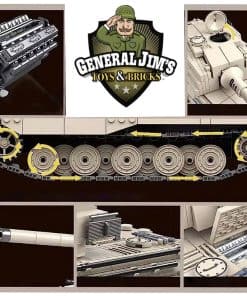 Bloque de Construcción de Juguete del Ejército – Tanque del Ejército Alemán de la Segunda Guerra Mundial llamado Tanque King Tiger Panzer VI. Contiene 978 piezas. Las orugas ruedan al empujarlas. La torreta gira. El cañón se mueve hacia arriba y hacia abajo. Viene con los accesorios mostrados. Compatible con todas las marcas principales de bloques de construcción. El producto viene desarmado con instrucciones detalladas impresas en papel. Los bloques de construcción de General Jim son compatibles con Lego, Cobi, Wange, Sembo y todas las marcas principales de bloques de construcción