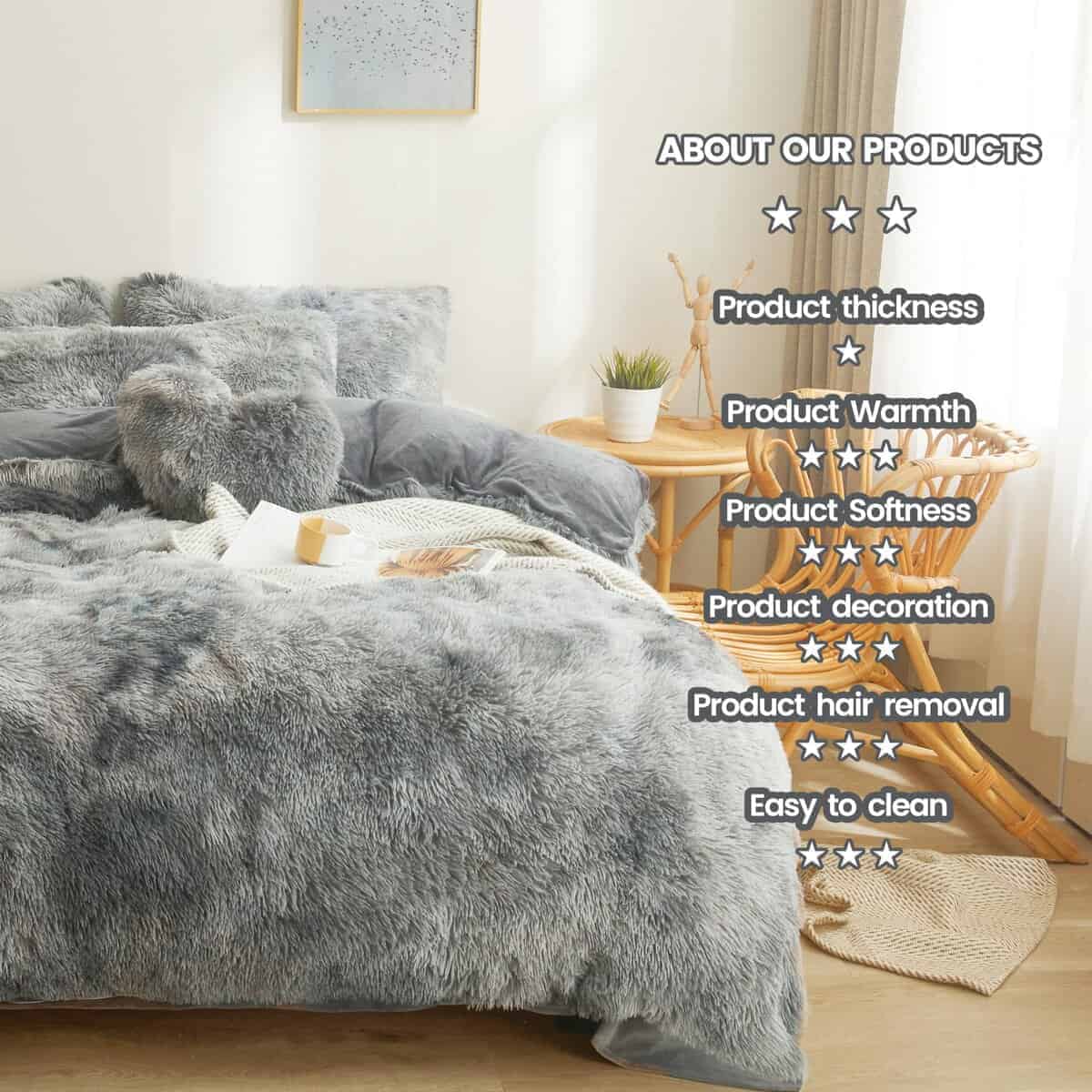 1. Felpa y Suave: el juego de cama gris oscuro king utiliza en el frente tela de felpa de faux fur extremadamente fluffy de 330 gsm y 280 gsm en la parte trasera es una tela de terciopelo exquisita. Este juego de funda nórdica de poliéster 100% te brinda instantáneamente una calidez acogedora y agrega una dosis de suavidad. Materiales de alta calidad para la experiencia de compra definitiva. 2. Juegos de Cama para Niñas king: Las mantas peludas de felpa gris oscuro tamaño twin tienen estilo con, se ven encantadoras en la cama, las más suaves y más divertidas gris juego de cama. cuenta con un lujoso faux fur felpudo para crear un espacio acogedor, revertido está forrado con un terciopelo cristal sólido, colores sólidos clásicos que combinan con muchos decorados. es muy suave y cómodo, te hace querer quedarte en la cama todo el día. 3. Paquete Incluido: 1 juego de funda de edredón gris oscuro king (90�� x 104��) y 2 fundas de almohada (20�� x 36��). El edredón o relleno no está incluido. ¡Ofrecemos muchos colores para elegir! Adecuado para decorar diversos estilos de habitaciones. Usando la funda nórdica de faux fur gris oscuro sin un edredón en el interior en verano y colocando un edredón en los meses más fríos. 4. Detalles Exquisitos: Adjuntamos 4 lazos en las esquinas del juego de cama gris oscuro para niñas para mantener la funda nórdica en su lugar y una cremallera oculta que es fácil para que inserte o retire su edredón. evita que se deslice en un montón, manteniéndote cómodo durante toda la noche. Lavable a máquina en agua fría y secar a baja temperatura. No usar lejía. 5. Regalo Ideal: Este juego de cama gris oscuro king para niñas es moderno y lujoso. también un gran regalo sorpresa de vacaciones y cumpleaños para tus familias, amigos, mujeres, hombres, niñas, niños, adolescentes y niños. El servicio al cliente receptivo estará listo para ayudarte a encontrar una solución, las 24 horas del día, los 7 días de la semana. No importa cuál sea tu pregunta, por favor envíanos un correo electrónico en cualquier momento.