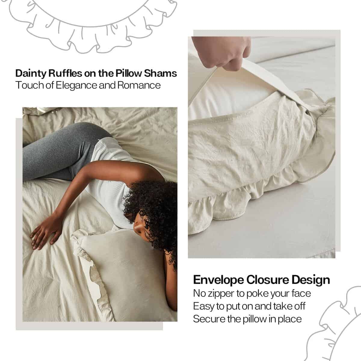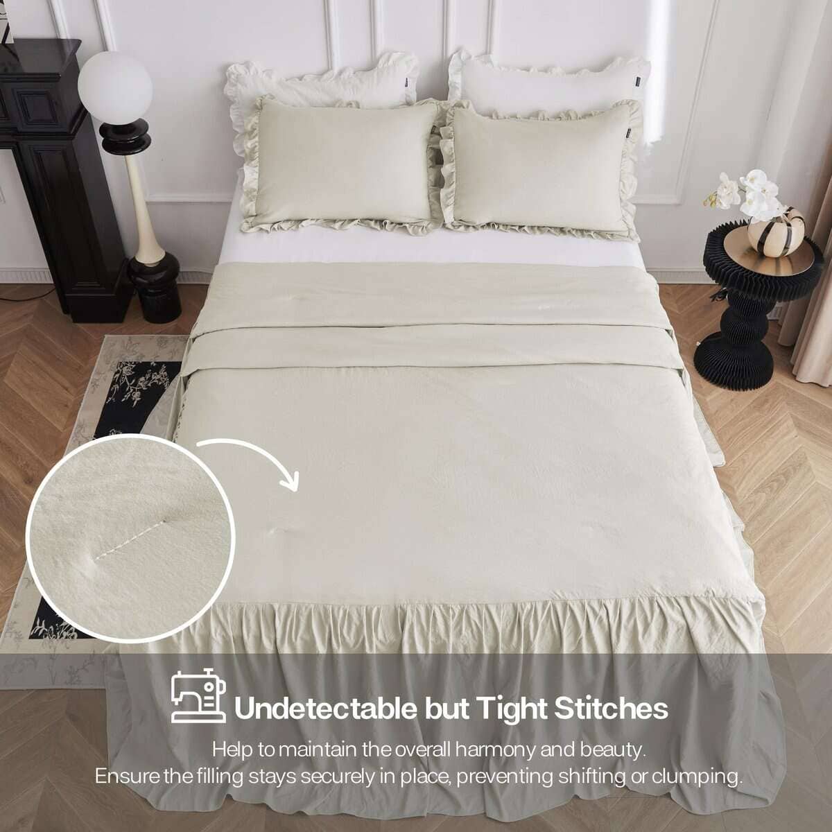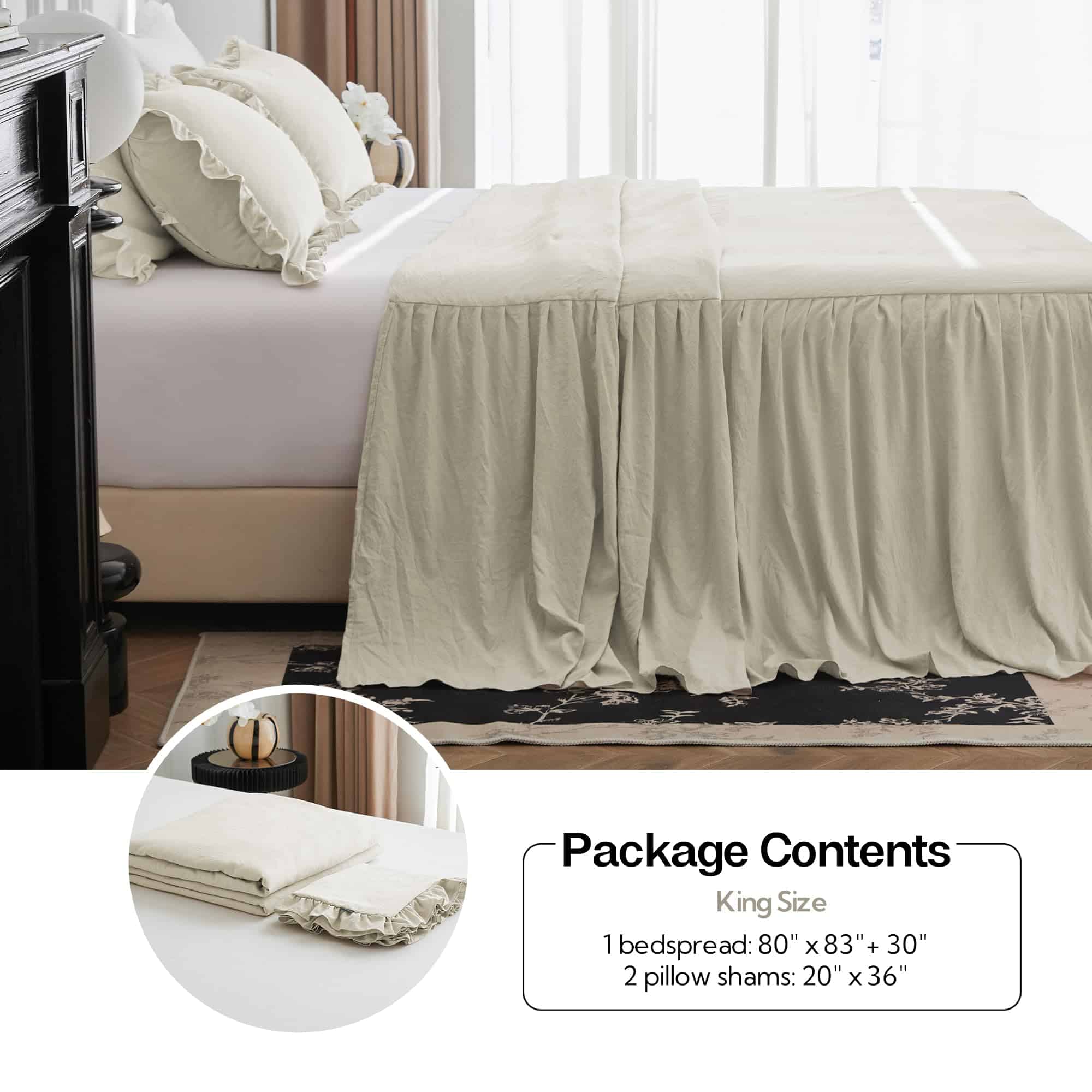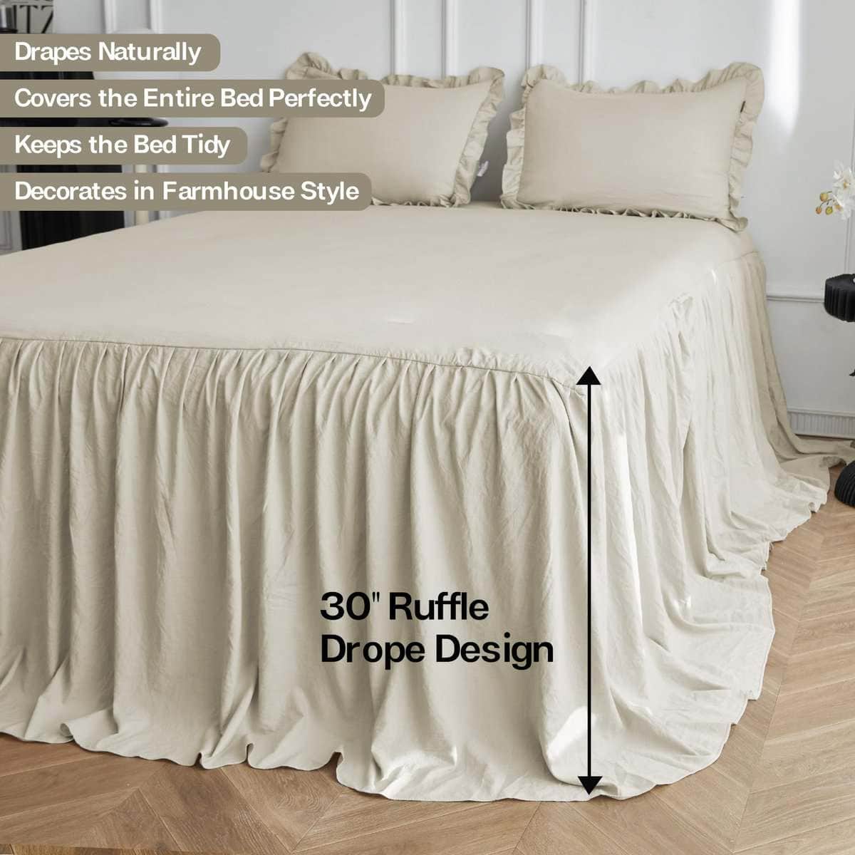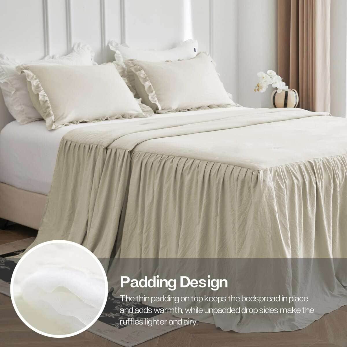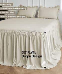 1. TEJIDO TEXTURIZADO ARRUGADO: Este set de cubrecama está elaborado con microfibra lavada a piedra, un tejido tratado especial que es mucho más suave que la microfibra normal y se caracteriza por sus arrugas naturales en la superficie, añadiendo una vibra relajante y sin esfuerzo que complementa perfectamente el estilo de granja, shabby chic, rústico y boho. 2. BORDES FRUNCIDOS NATURALES: A diferencia de los fruncidos sueltos, nuestro cubrecama tiene fruncidos más finos y pequeños para un drapeado natural y aireado. La caída de 30 pulgadas desciende elegantemente al suelo, manteniendo la cama ordenada y con estilo a la vez que le da un encanto romántico a tu dormitorio. 3. DISEÑO PRÁCTICO: La capa superior cuenta con acolchado acolchonado para mayor suavidad y una mejor estancia, mientras que la costura ajustada asegura que el relleno se mantenga firmemente en su lugar y evita que el acolchado se desplace, proporcionándote una experiencia de usuario cómoda. 4. SET DE CUBRECAMA DE 3 PIEZAS: Tamaño completo: 1 cubrecama 55″x80″+30″ y 2 fundas de almohada a juego 20″x26″; Tamaño queen: 1 cubrecama 60″x80″+30″ y 2 fundas de almohada a juego 20″x26″; Tamaño king: 1 cubrecama 80″x83″+30″ y 2 fundas de almohada a juego 20″x46″. 5. CUIDADO FÁCIL, COMPAÑÍA A LARGO PLAZO: Lavable a máquina para tu conveniencia. Simplemente sigue nuestras instrucciones de cuidado para mantener la tela suave y duradera. Si tienes alguna pregunta, no dudes en contactarnos para recibir soporte.