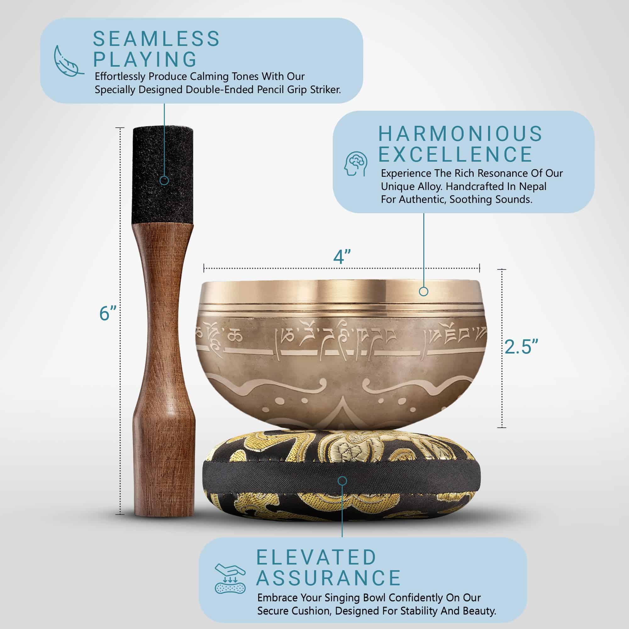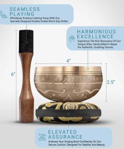 ¿Buscas un set de cuenco tibetano de excelente calidad a un precio inigualable Entonces nuestro Set de Cuenco Tibetano Om Mani Padme Hum es tu mejor opción. El cuenco está hecho en Nepal utilizando aleaciones de metal de alta calidad y viene con un duradero mazo de madera y un llamativo cojín de seda. Los cuencos tibetanos son una de las herramientas antiguas de meditación tibetana. Históricamente se fabricaban en toda Asia, especialmente en Nepal, China y Japón. En algunas prácticas budistas, los cuencos tibetanos se utilizan como una señal para comenzar y terminar períodos de meditación en silencio. Según las antiguas prácticas del Feng Shui, los ritmos creados por los cuencos asustan a todos los malos espíritus y fantasmas. La fascinante combinación de armónicos vibratorios producidos por los Cuencos Tibetanos se utilizan ampliamente para la meditación y la purificación de espacios. Este agradable y duradero sonido también ayuda a reducir el estrés, alterar la conciencia y crear un profundo sentido de paz, bienestar y mejor salud. Nuestros cuencos tibetanos son ampliamente utilizados por profesionales de todo el mundo, incluidos profesionales de la salud, psicoterapeutas, masajistas, maestros de escuela, músicos y maestros espirituales. Además, las personas lo utilizan como instrumento musical o les gusta mantenerlo como decoración para el hogar moderno. Puedes tocar fácilmente el cuenco ya sea frotando el mazo alrededor del borde o golpeando suavemente los lados del cuenco. Estos dos métodos producen sonidos bastante distintivos. Siempre nos preocupamos por la calidad y la durabilidad de nuestros sets de cuenco tibetano. Nuestro objetivo es tener clientes 100% satisfechos. Pero, si no estás satisfecho por cualquier motivo, simplemente devuelve el producto dentro de los 30 días para obtener un reembolso completo. ¡Así que solo haz clic en el botón «AÑADIR AL CARRITO» en la parte superior de esta página para pedir tu Set de Cuenco Tibetano hoy!