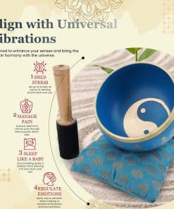 Características: Diseño Exquisito: El impresionante diseño inspirado en Tai Chi – Azul y el color cautivador añaden belleza y serenidad a tu espacio de meditación. Tamaño Perfecto: Con un tamaño compacto de 4 pulgadas de diámetro y 2.25 pulgadas de profundidad, es fácil de sostener y portátil para usar en cualquier lugar. Set Completo: Incluye un palo golpeador para crear sonidos parecidos a campanas y un hermoso cojín de brocado para un soporte cómodo. Creación de Tono Pulsante: Golpea el cuenco y circula el borde en un movimiento hacia la derecha para evocar vibraciones resonantes y un sonido relajante. Alivio del Estrés y Relajación Profunda: Alivia el estrés, la tensión e induce una relajación profunda para tu mente, cuerpo y alma.