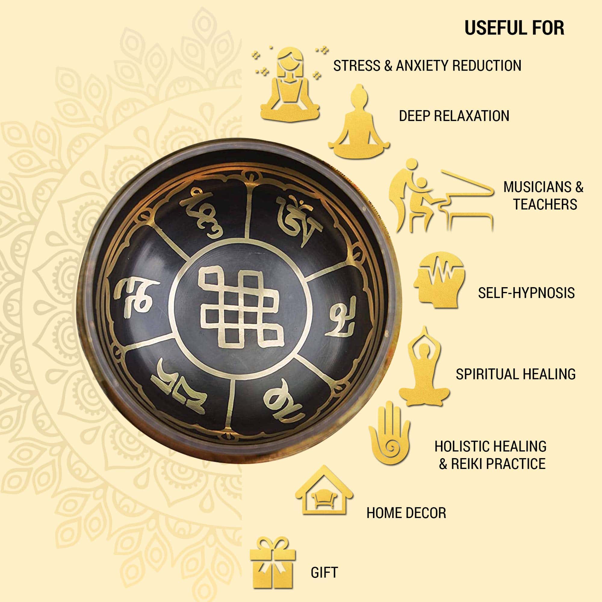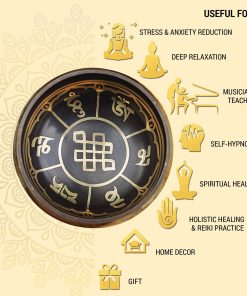 FÁCIL DE TOCAR ÚTIL PARA Reducción de Estrés y Ansiedad Relajación Profunda Músicos y Maestros Sanación Holística y Práctica de Reiki Sanación Espiritual Autohipnosis Decoración del Hogar Regalo Los Cuencos de Canto Tradicionales están hechos de 7 metales y también se conocen como Cuenco del Himalaya , campanas , Cuenco de campana , cuenco del Tíbet , cuenco de canto y otros. Hecho a mano en Nepal por artesanos locales de comunidades desfavorecidas. El cuenco de canto auténtico se puede utilizar para diversos fines. Estos cuencos son excelentes regalos de yoga para hombres y mujeres, regalos de meditación, regalos espirituales y se pueden utilizar para la decoración del hogar y de la habitación también. Son perfectos para cualquier ocasión y son regalos considerados. Es un maravilloso regalo de cumpleaños, día de la madre, día del padre y regalo de Navidad y también un regalo de atención plena. Estos Cuencos de Canto Tibetanos son populares entre practicantes de Zen y sanadores para la meditación y la oración, y frecuentemente utilizan el cuenco de canto para la limpieza. Puedes realizar el Reiki con el cuenco de canto. Los sanadores se enfocan en los chakras e incorporan el Pranayama y diversos métodos de yoga nidra para ayudar a aliviar la ansiedad y los ataques de pánico. Vienen en diferentes tamaños y el cuenco de sonido de color negro, el pequeño cuenco de canto y el cuenco de canto de 4 pulgadas son los más populares en todo el mundo. Cada cuenco de música también tiene un tono o nota de sonido único. Nota C Chakra Raíz ( Muladhara) Nota D Chakra Naval ( Swadistana ) Nota E Plexo Solar Nota F Chakra del Corazón Nota G Chakra de la Garganta Nota A Chakra del Tercer Ojo Nota B Chakra de la Corona Haz clic en el botón Añadir al carrito para obtener hoy un auténtico Set de Cuenco Tibetano de Bronce.