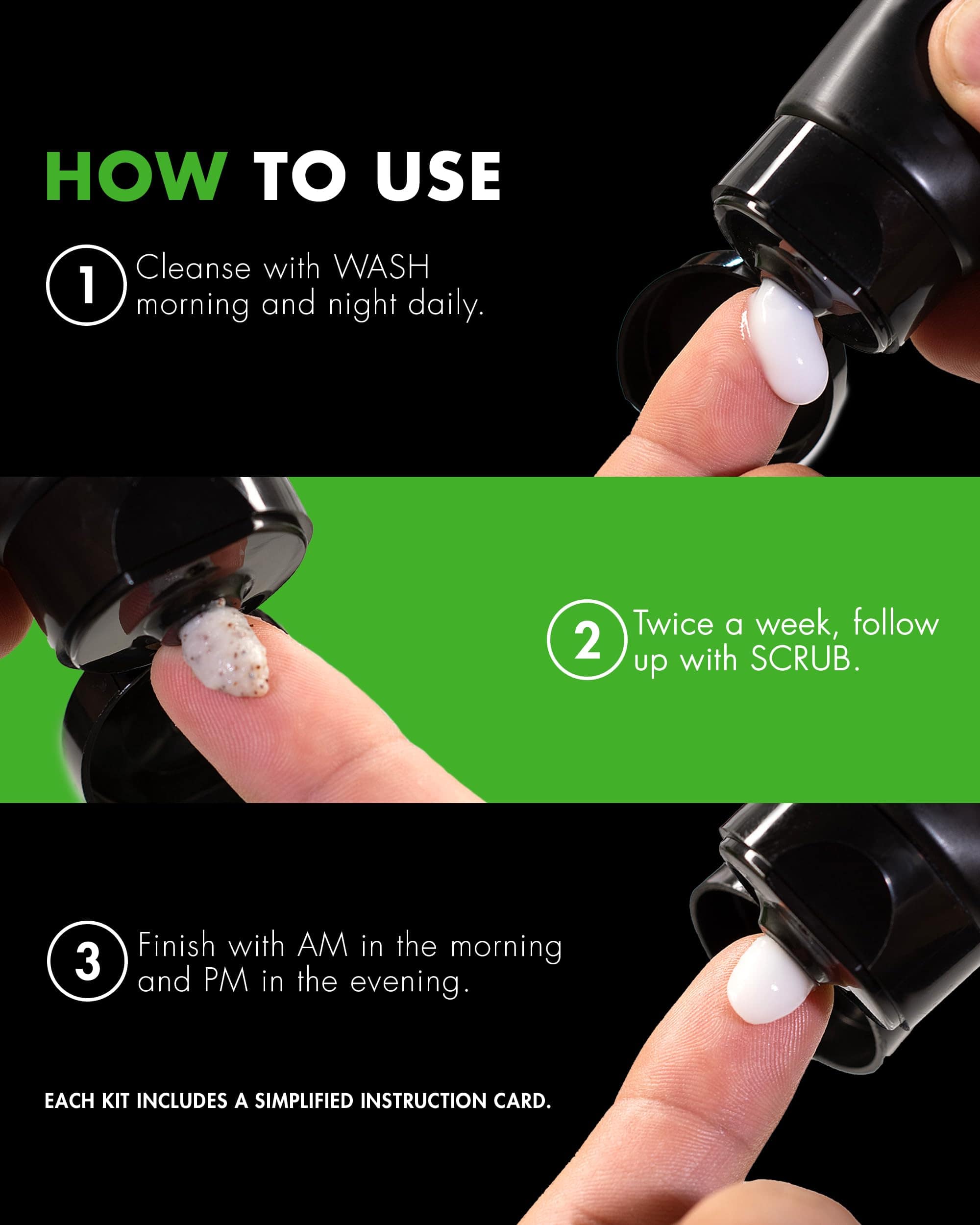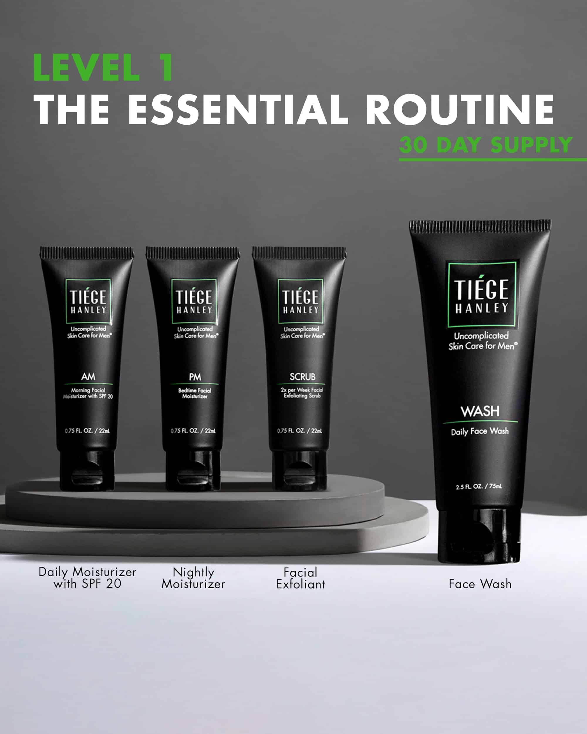 El limpiador facial WASH es un limpiador facial de alta calidad para hombres destinado a ser utilizado dos veces al día, por la mañana y por la noche. Enjuaga el aceite y la suciedad para exponer una piel limpia, saludable y guapa. Es seguro para la piel sensible y ayuda a controlar la producción de aceite. El exfoliante facial SCRUB no solo ayuda a mantener la superficie de tu piel limpia, sino que también promueve el crecimiento de nuevas células de la piel y ayuda a emparejar el tono de la piel. Dos veces por semana, trabaja el SCRUB en la piel húmeda durante unos 10 segundos, enjuaga y seca con palmaditas. Las crema hidratantes facial para la mañana y la noche AM hidrata la piel, regula la producción de aceite y proporciona la protección solar necesaria. PM es una crema hidratante facial nocturna que hidrata la piel y ayuda a aumentar la producción de colágeno para mejorar la elasticidad de la piel y disminuir las arrugas mientras duermes. Después de lavarte, trabaja la crema hidratante en tu rostro durante unos 10 segundos. Nuestra filosofía en Tiege Hanley es desarrollar rutinas que incluyan el menor número de productos y que tomen el menor tiempo posible. Simple. Rápido. Exitoso. No debes tener dudas sobre lo que estás usando y qué está haciendo.
