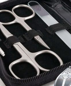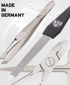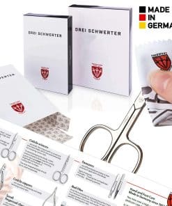 Nuestro set de cuidado de uñas de 3 Swords Germany incluye tijeras para uñas, tijeras para cutículas, pinzas, cortaúñas, instrumento doble (empujador / limpiador), lima de uñas de zafiro (recubrimiento fino y grueso), lima de uñas de vidrio, cortaunas. Todos los instrumentos de acero son hechos a mano, niquelados brillantes y con acabado mate arenado (protección contra la corrosión), pulidos y endurecidos. Los sets vienen en una atractiva caja de regalo. Los instrumentos están hechos en Solingen, Alemania (excepto los cortaúñas). El estuche es de piel sintética negra, tamaño aprox. 14,5 x 10,0 x 3,0 cm. Nuestros organizadores están hechos de materiales de moda o clásicos de alta calidad. Equipamiento adicional: paño de limpieza de microfibra para limpiar los artículos de acero, hoja informativa general de cuidado de dedos y uñas. ¡GARANTÍA DE SATISFACCIÓN: Por favor, CONTÁCTENOS DIRECTAMENTE, ¡SIEMPRE encontramos una solución! ¡Un set de belleza de 3 Swords es un regalo perfecto para mujeres, niñas y hombres, ideal para Navidad, cumpleaños, Día de la Madre / Padre, bodas, Acción de Gracias y Día de San Valentín!