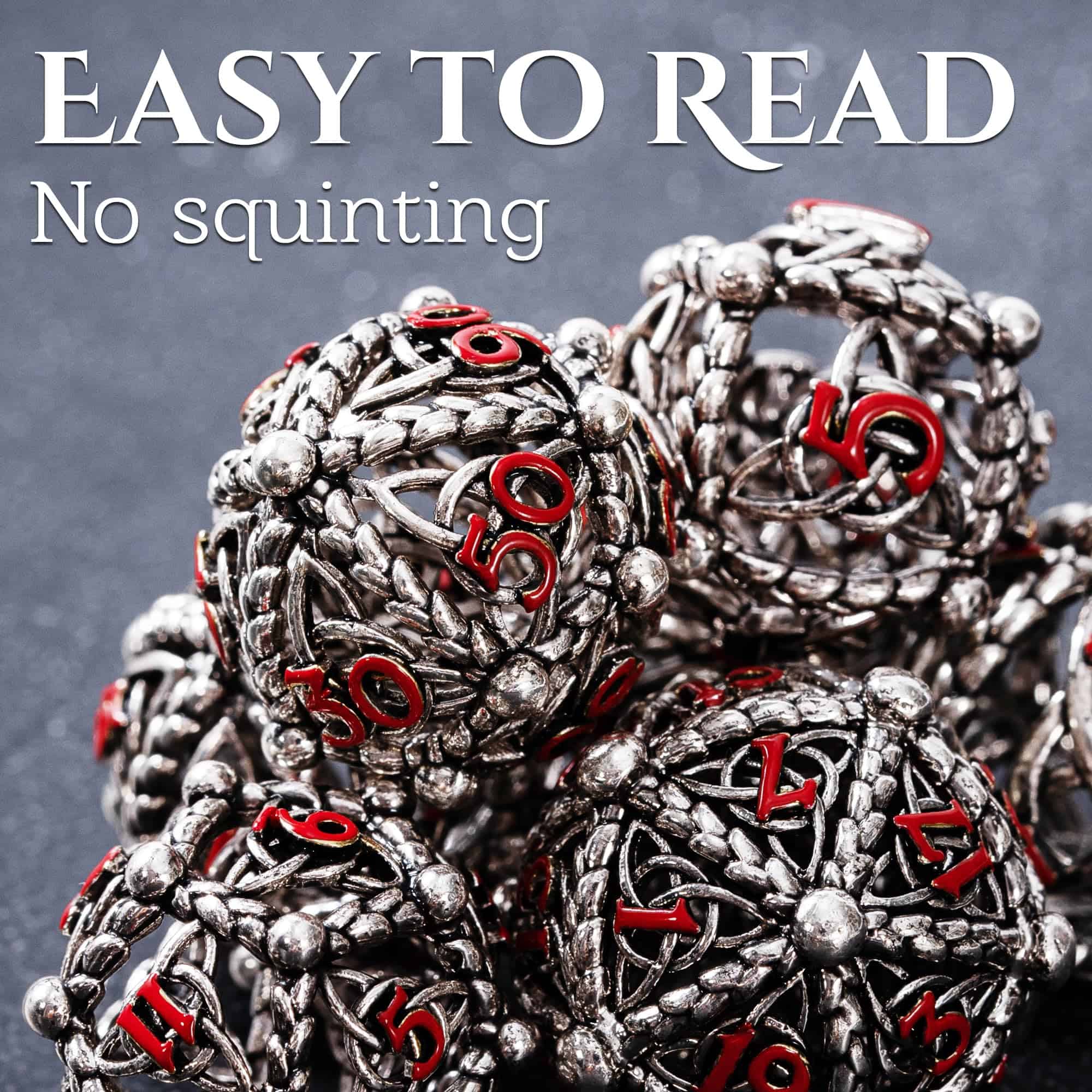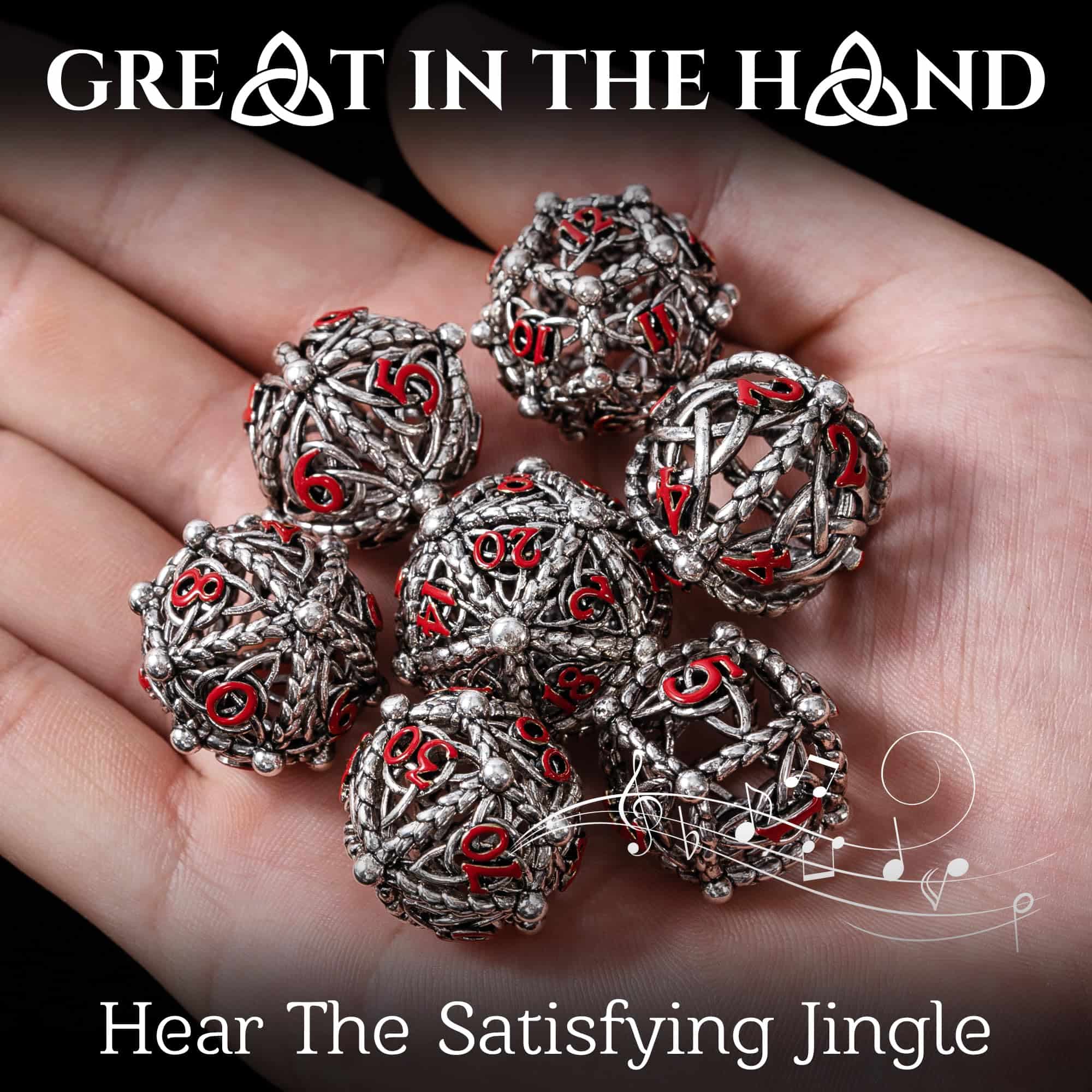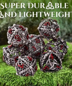 Set de dados de DND de metal – Diseño único de orbe hueco redondo para una mejor tirada – Hermoso set de dados de metal Nudo Celta para juegos de rol (RPG) – Impresionante set de dados de Dungeons and Dragons D&D (Rojo Hierro). Nuestros únicos Orbes Huecos se sienten INCREÍBLES al rodar con una tirada suave, equilibrada y aleatoria. Se ‘ajustan’ en su lugar al igual que los dados poliédricos de bordes afilados, pero tienen un mejor rendimiento que los dados de metal DND regulares que caen y se detienen sin una tirada significativa. Sin bordes afilados, nuestros dados son amigables con la familia, los muebles y el DM. (Diseño patentado. Patente de utilidad en espera para dados redondos). Elegante, único y detallado de manera intrincada. El diseño de dados Nudo Celta estilísticamente estilo no solo se ve hermoso, sino que también tiene un encanto natural que encantará al resto de la mesa cuando los saques en un juego. Los números claros y llamativos también son muy fáciles de leer. Los orbes de dados de metal huecos no solo son altamente duraderos, sino que también son más ligeros de lo que creerías, con el peso y tamaño justos para sentirse geniales en la mano. El satisfactorio sonido tintineante que hacen al chocar juntos es casi musical. La bolsa con un aspecto genial protege y almacena de forma conveniente tus orbes para que no se pierdan después de un juego o se arañen durante el transporte. También mejora el atractivo general del set haciéndolos regalos increíbles para los jugadores de DnD. Estos dados de rol son perfectos para los adictos a los dados, DM’s y entusiastas de los rpg. Crea recuerdos duraderos con amigos y familia sabiendo que somos inquebrantables en nuestro compromiso de fabricar dados de calidad para d&d y brindar un excelente servicio al cliente. Nuestro set de dados de DND de metal es ideal para cualquier amante de los juegos de rol y añadirá un toque único a tus sesiones de juego. ¡Hazte con uno hoy mismo!