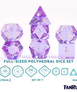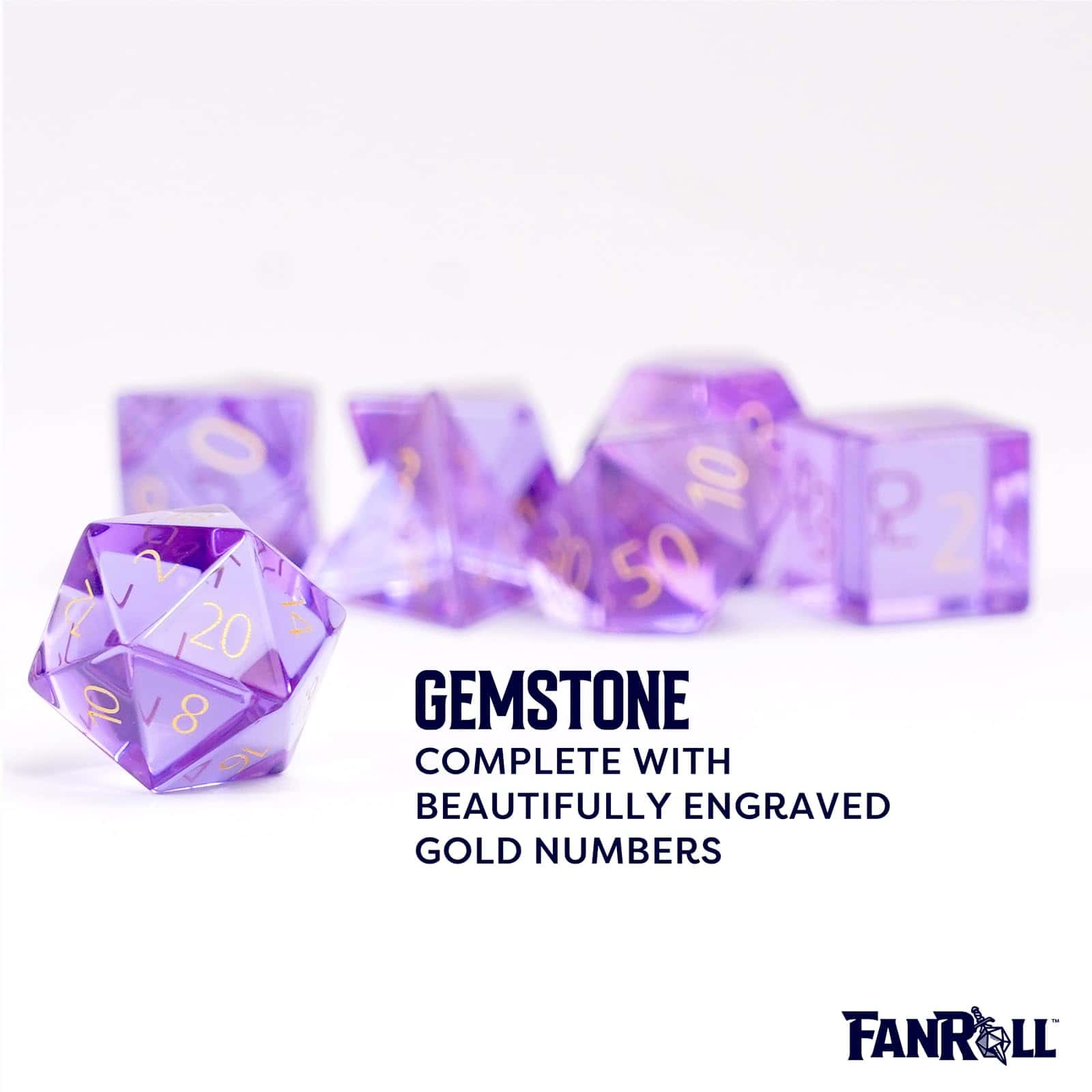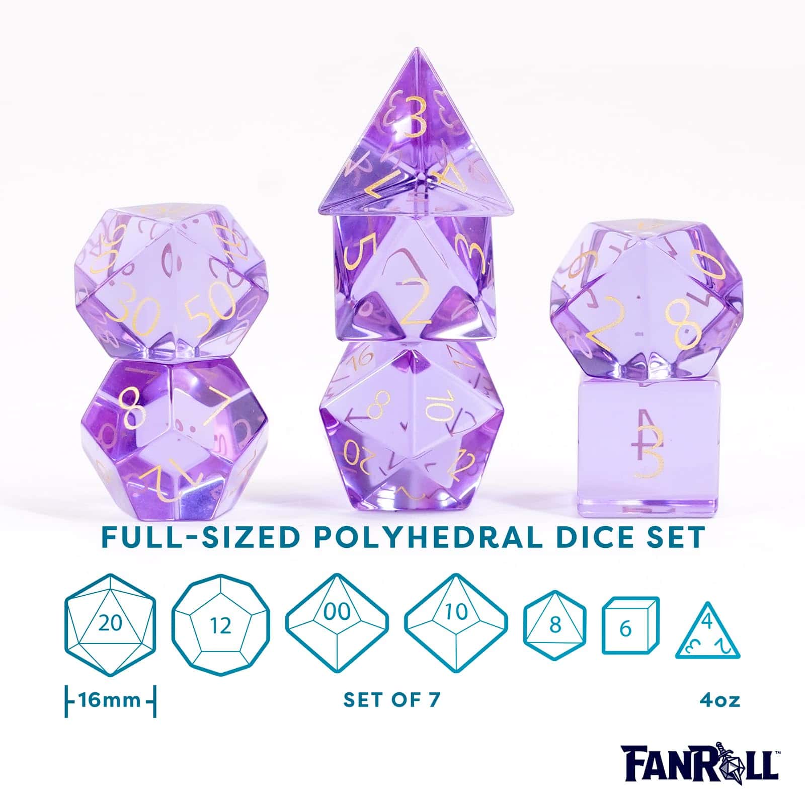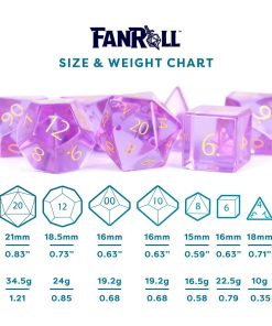 Este es un set completo de dados poliédricos de 16mm que incluye 7 dados (d4, d6, d8, d10, d10 (00-90), d12 y d20). Cada set de gemas viene en un estuche de plástico que separa cada dado para protección.