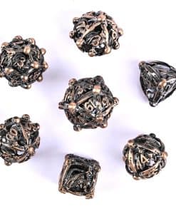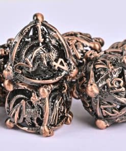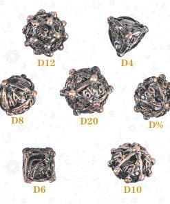 Set de Dados de Metal DND: un set de 7 dados, incluyendo D20, D12, D% (00-90), D10 (0-9), D8, D6 y D4.