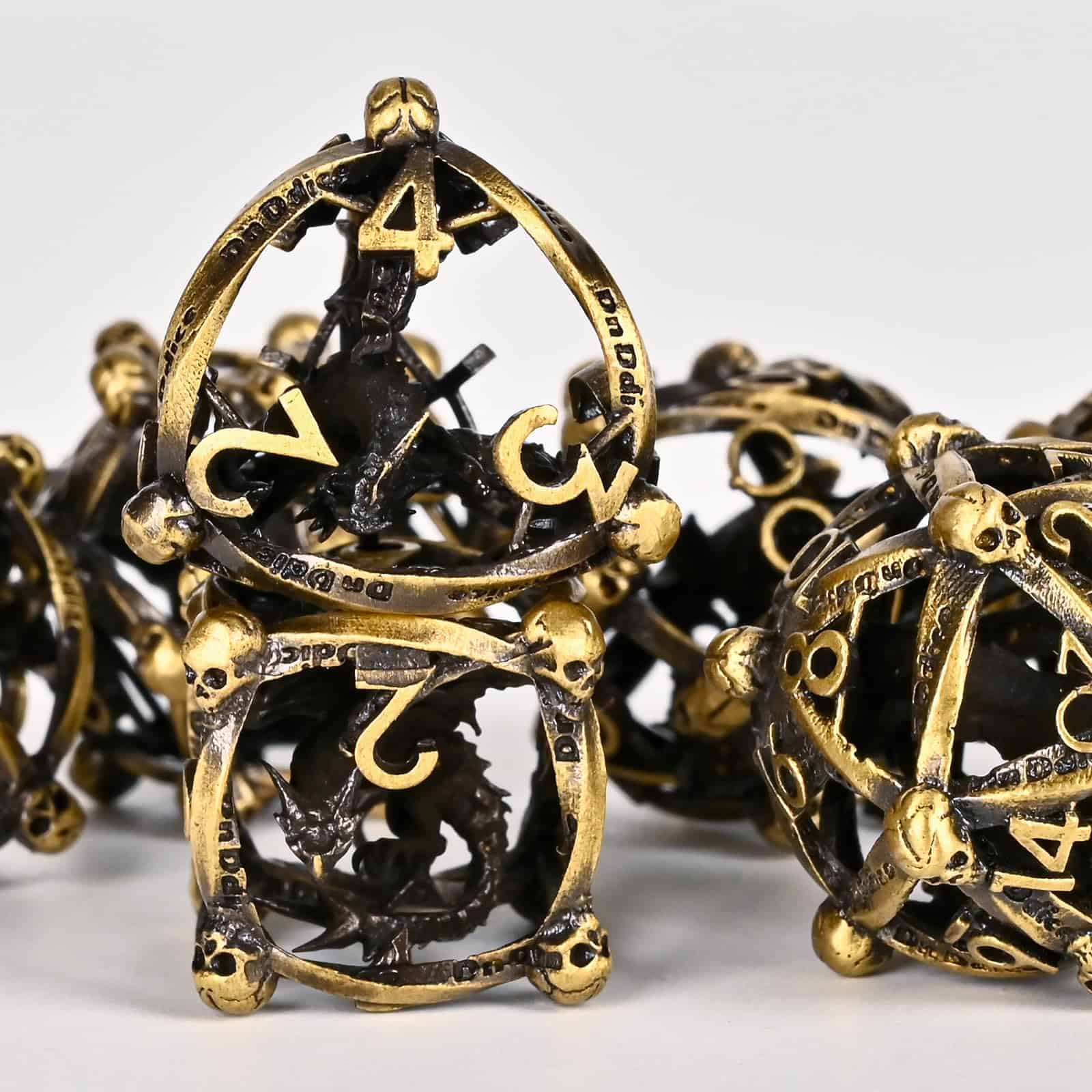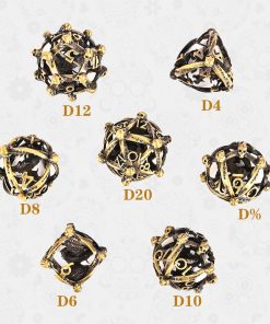 Metal DND Dice set: un conjunto de 7 dados, incluyendo D20, D12, D% (00-90), D10 (0-9), D8, D6 y D4.