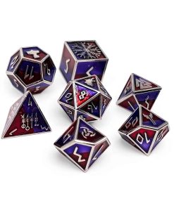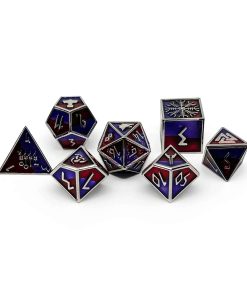 Comienza una odisea en el reino de los doppelgängers con nuestro exclusivo set de dados «Runas de Poder». Elaborados con aleación de zinc sólido, estos dados bañados en plata con un encantador relleno de esmalte morado reflejan la esencia de las misteriosas criaturas cambiantes que los inspiraron.