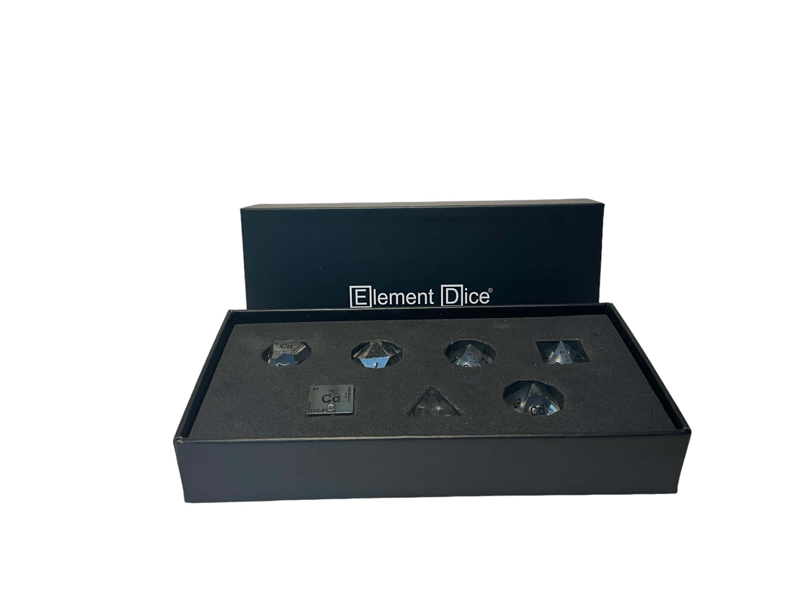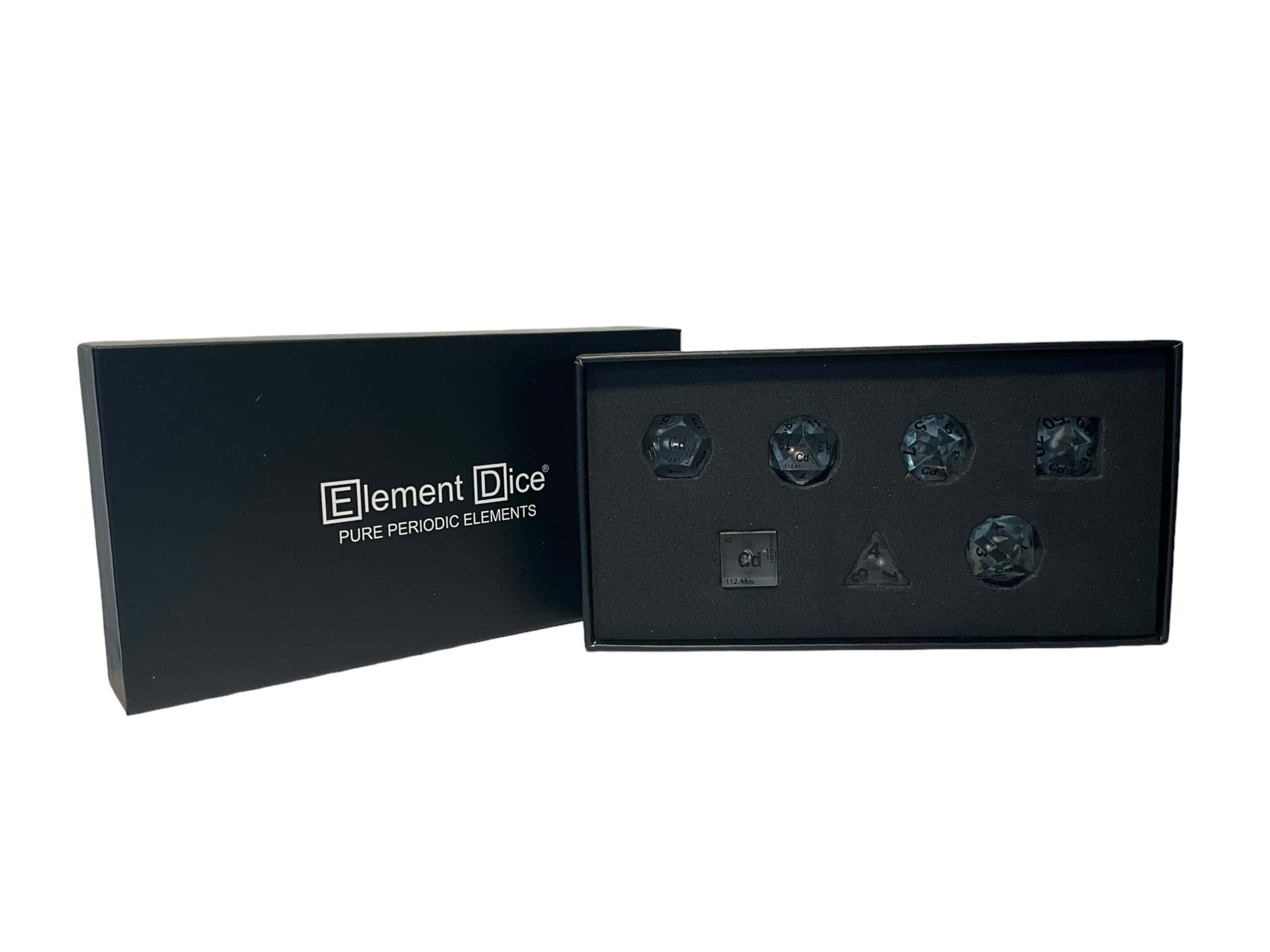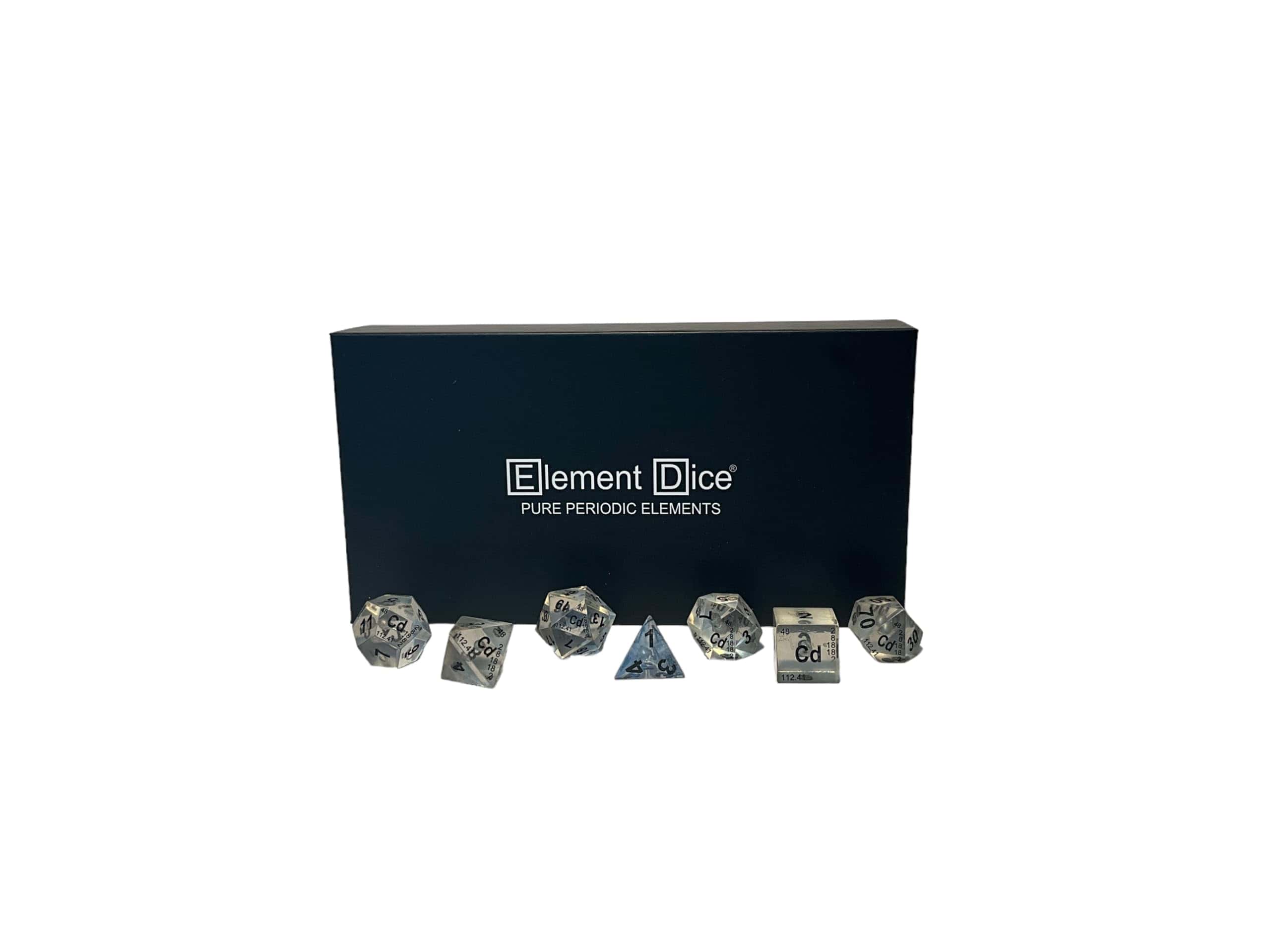 Dados de metal puro inspirados en la tabla periódica de elementos. Dados de metal pesado que se sienten como ningún otro dado que hayas sostenido. Este set de dados poliédricos de resina contiene Cadmio puro en su núcleo. Tu set incluye los siguientes dados de elementos: D4, D6, D8, D10, D10 (porcentual), D12, D20. Disfruta del aspecto y sensación de estos dados premium y tira tus mejores lanzamientos con Element Dice.