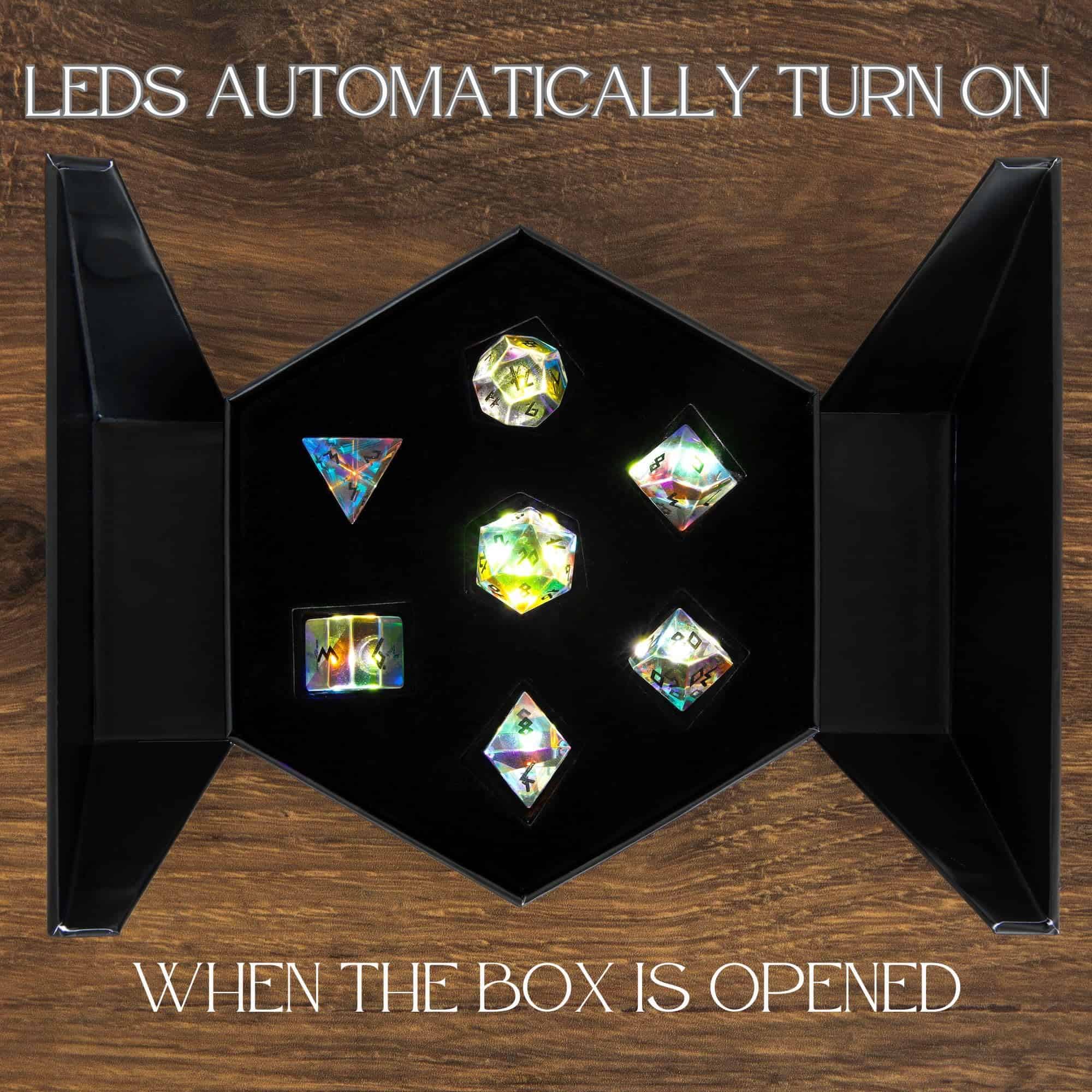 3. Presentación Iluminada: Revela tus dados de rol con estilo con nuestra caja de dados de exhibición LED única en su clase. Estos LEDs, posicionados debajo de cada dado, crean un sutil resplandor cuando se abre la caja, realzando el aspecto y la sensación premium. El arte celestial de estilo nórdico de la caja incrustado con papel de oro la convierte en el regalo perfecto para las fiestas.