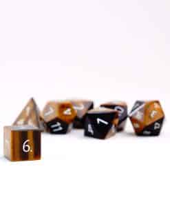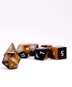 Este es un set completo de dados poliédricos de 16mm que incluye 7 dados (d4, d6, d8, d10, d10 (00-90), d12 y d20). Cada set de piedras preciosas viene en un estuche de plástico que separa cada dado para protección.