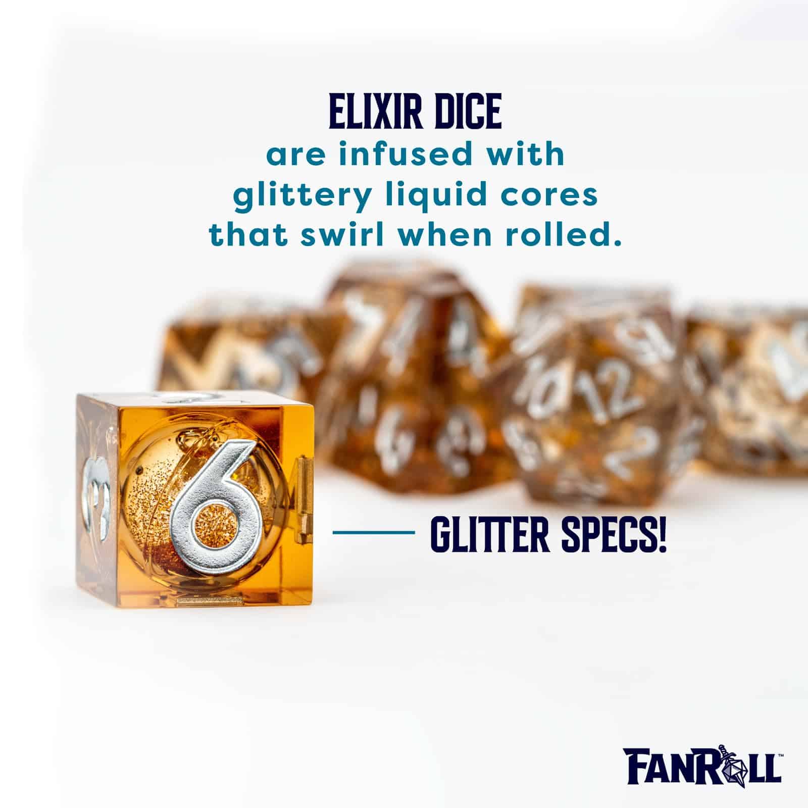 Dados de Elixir de núcleo líquido de Metallic Dice Games hechos a mano, de bordes afilados para Dungeons and Dragons. MDG fue fundado en 2013 en EE. UU. por un entusiasta de los dados de 22 años en Indiana que estaba cansado de no tener acceso a dados metálicos de calidad. MDG se enorgullece de fabricar productos de la más alta calidad con un toque personal y garantía de satisfacción del 100%. ¡Un buen set de dados puede durar toda la vida, no conformes con nada menos, elige calidad y personalidad!