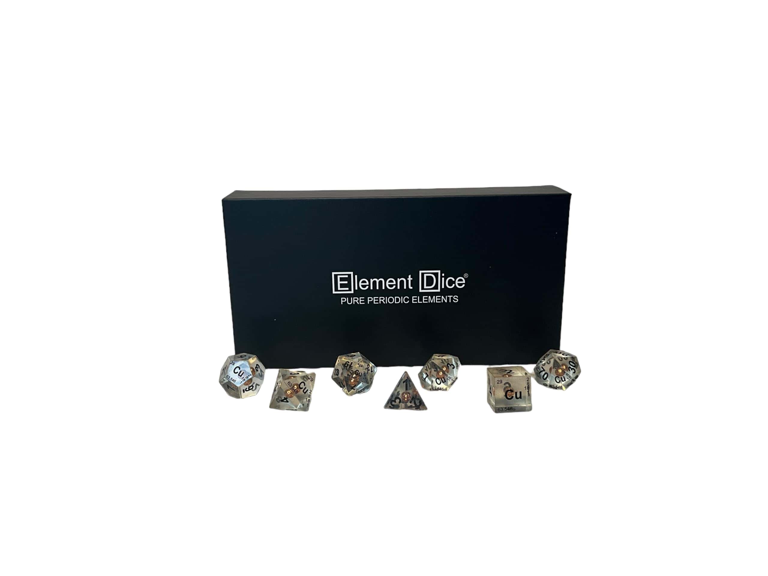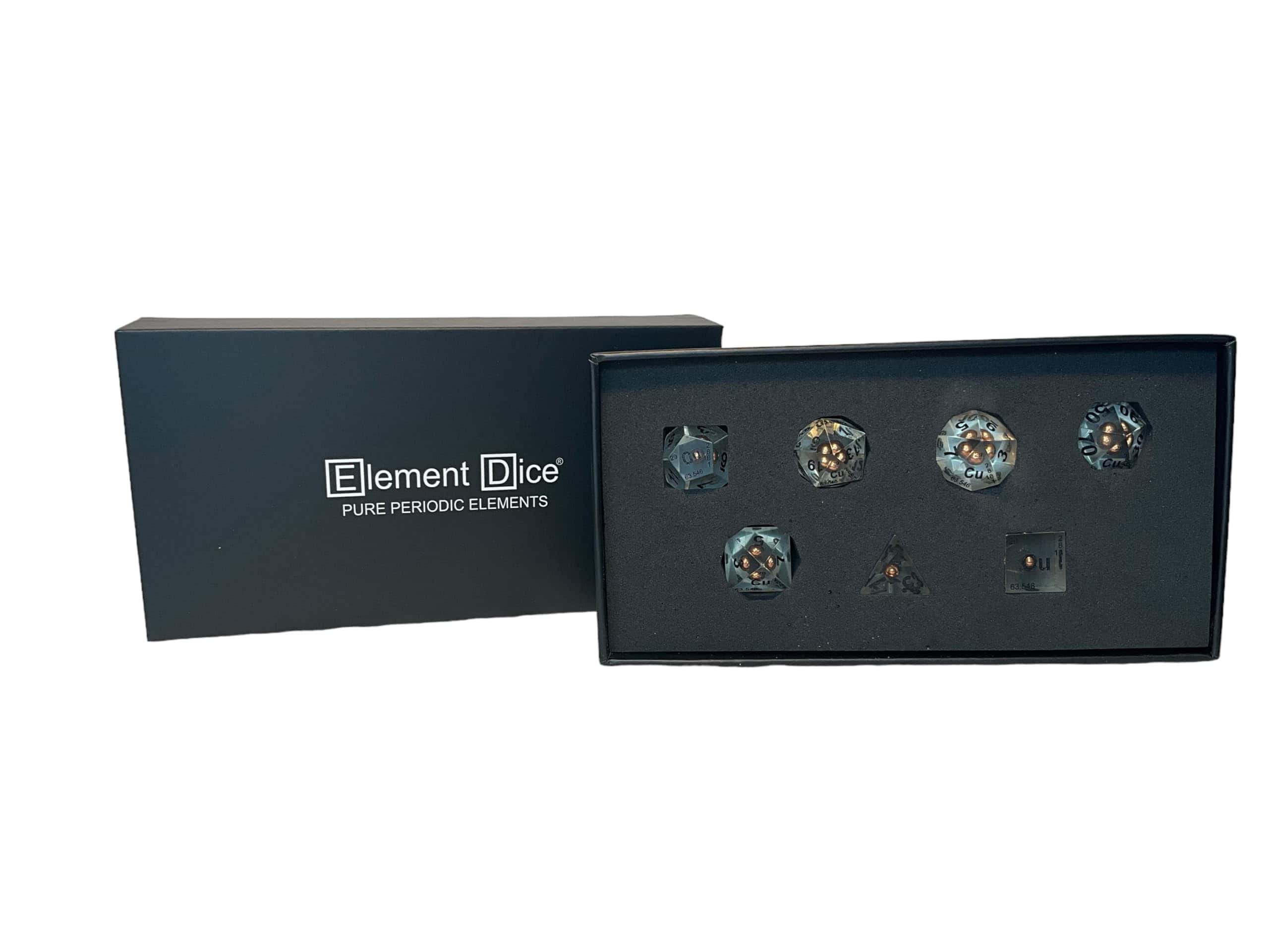 Dados de metal puro inspirados en la tabla periódica de elementos. Pesados dados de metal que se sienten como ningún otro dado que hayas sostenido. Este set de resina poliédrica viene con un núcleo de cobre puro en cada uno de sus dados. Tu set incluye los siguientes Element Dice: D4 – Dado de cuatro caras, o tetraedro. D6 – Dado de seis caras, o cubo. D8 – Dado de ocho caras, u octaedro. D10 – Dado de diez caras estándar, numerado del 1 al 10 o del 0 al 9. D10 (Porcentaje) – Un dado de diez caras que cuenta de diez en diez, marcado 00, 10, 20, hasta 90, utilizado para tiradas de porcentaje junto al dado estándar D10. D12 – Dado de doce caras, o dodecaedro. D20 – Dado de veinte caras, o icosaedro. Disfruta del aspecto y la sensación de estos dados premium y tira tus mejores tiradas con Element Dice.