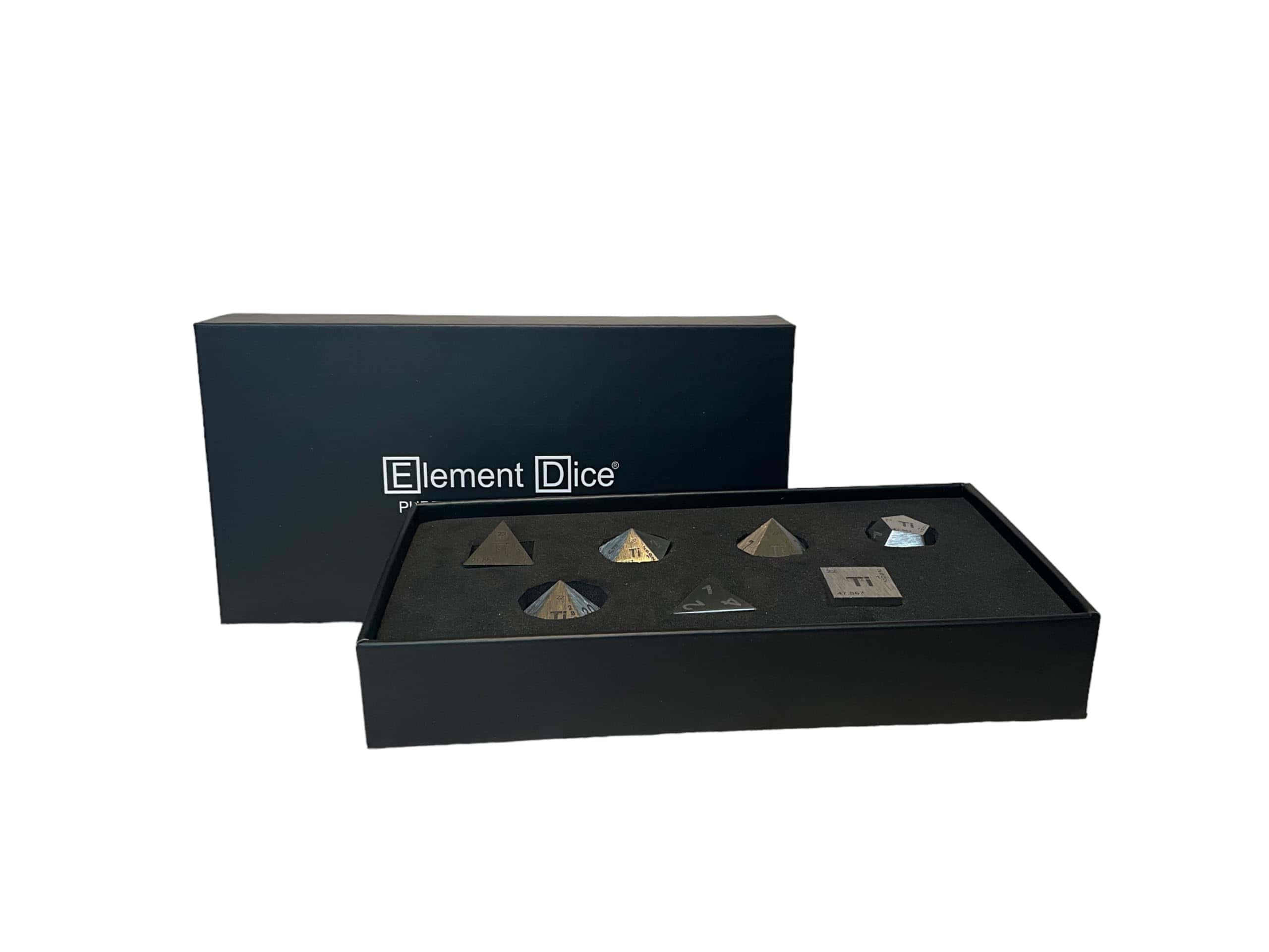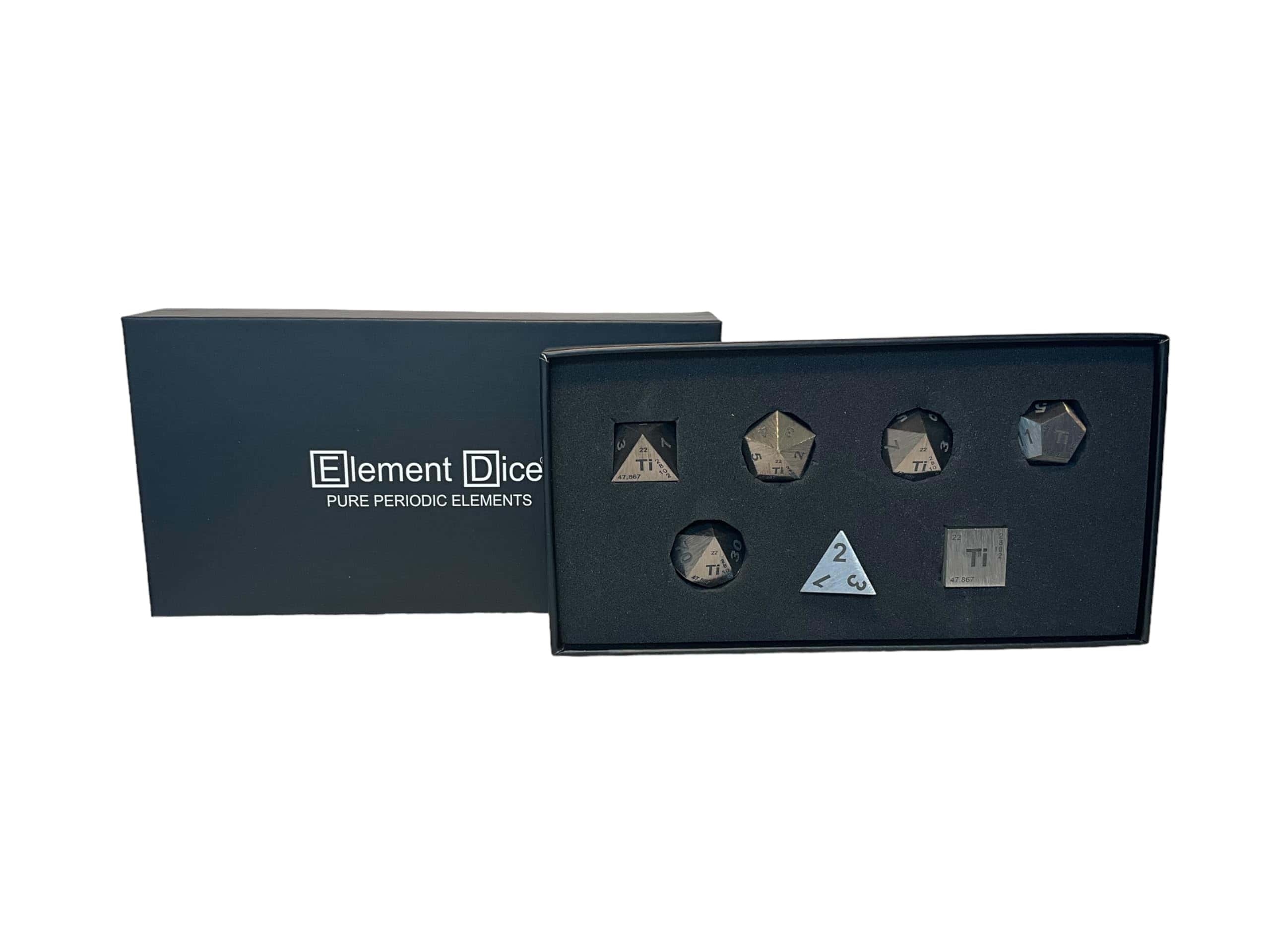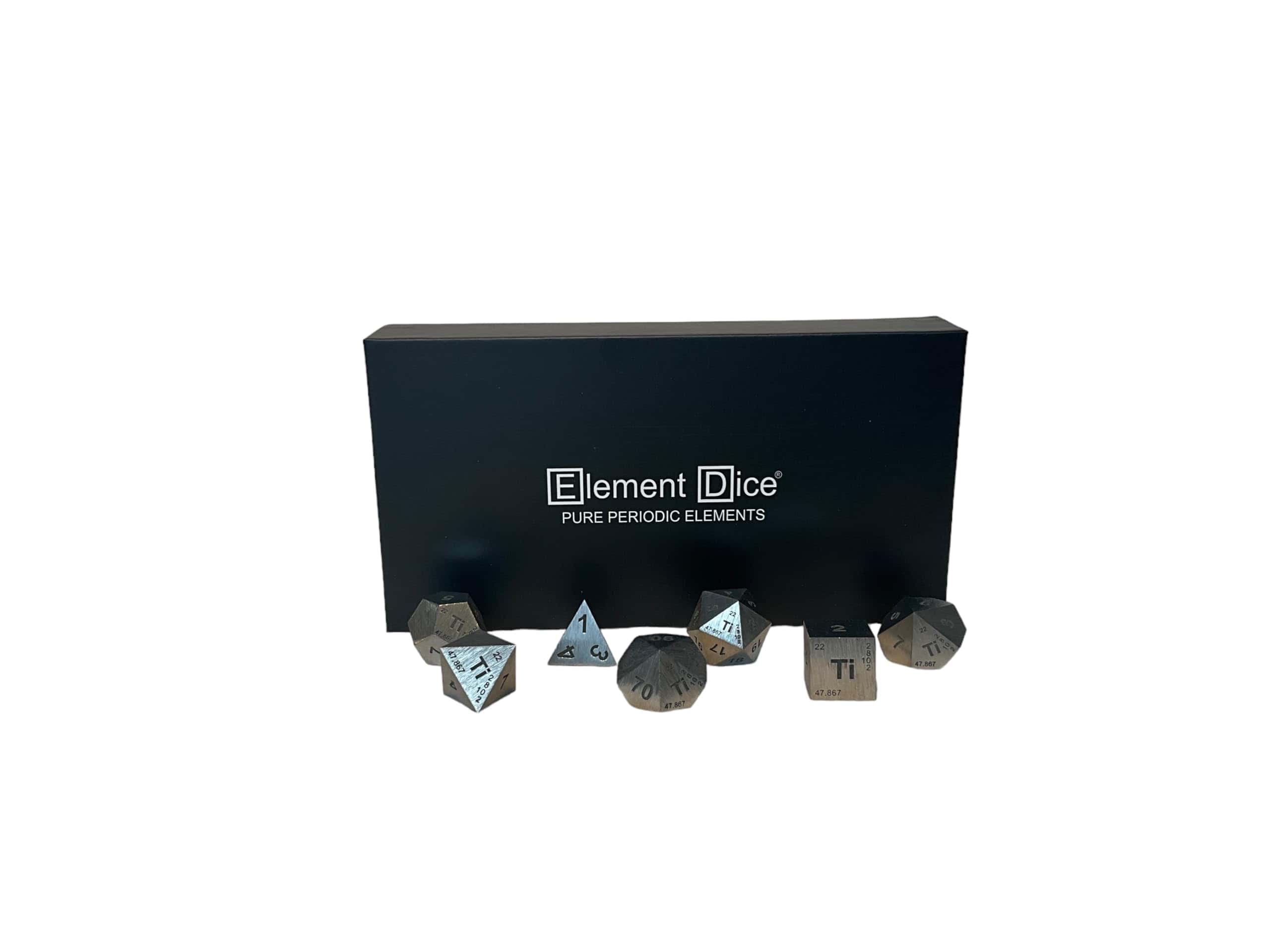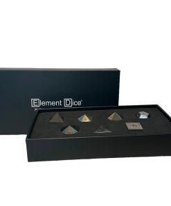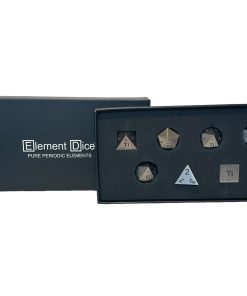 Este set de dados poliédricos de resina está hecho de Titanio puro. Tu set incluye los siguientes dados Element: D4 – Dado de cuatro caras. D6 – Dado de seis caras. D8 – Dado de ocho caras. D10 – Dado estándar de diez caras, numerado de 1 a 10 o de 0 a 9. D10 (Porcentaje) – Dado de diez caras que cuenta en decenas, marcado en series de 00, 10, 20, hasta 90, utilizado para lanzamientos de porcentaje junto al D10 estándar. D12 – Dado de doce caras. D20 – Dado de veinte caras. Disfruta del aspecto y la sensación de estos dados premium y tira lo mejor de ti mismo con Element Dice!