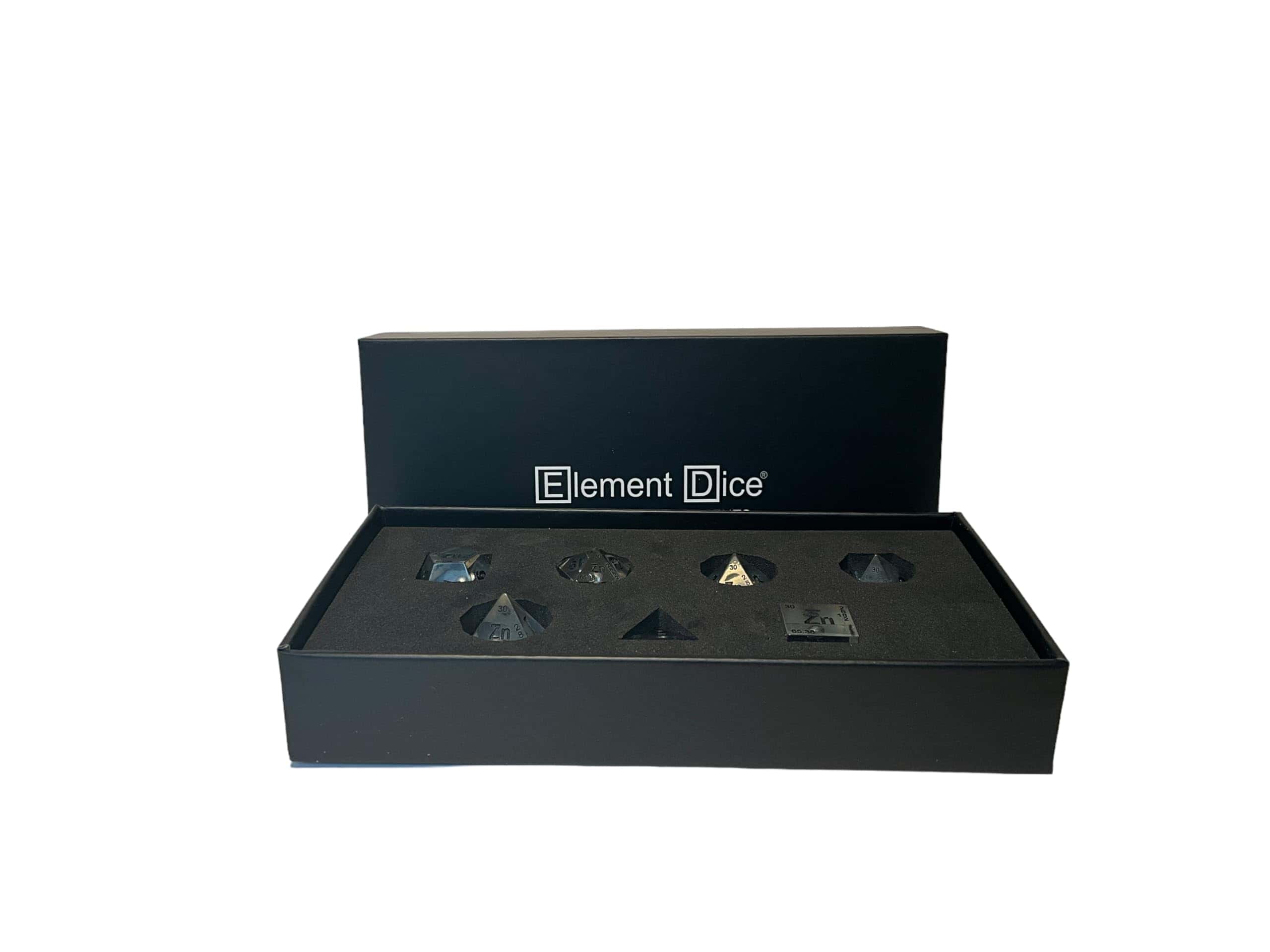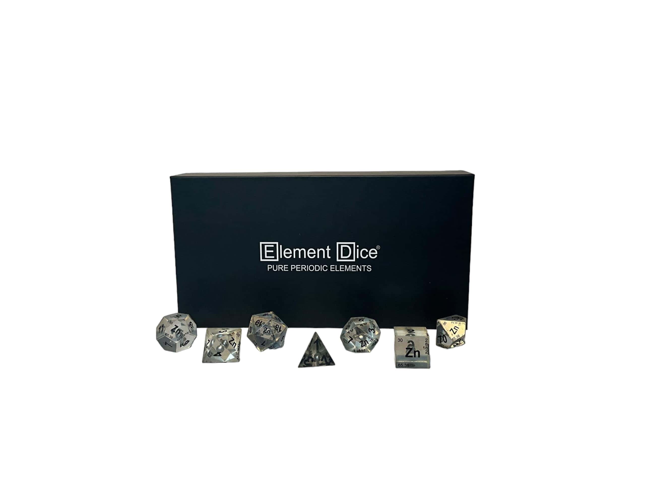 Conjunto de dados de metal puro inspirados en la tabla periódica de elementos. Este set de dados Poliédricos de resina contiene Zinc puro en su núcleo, lo que le confiere un peso y una sensación únicos. Los dados incluidos en el set son el D4 (tetraedro), D6 (cubo), D8 (octaedro), D10 (numerado del 1 al 10 o del 0 al 9), D10 (Para realizar porcentajes), D12 (dodecaedro) y D20 (icosaedro). Los Element Dice ofrecen una apariencia elegante y una experiencia de lanzamiento excepcional. ¡Atrévete a rodar tus mejores jugadas con Element Dice!