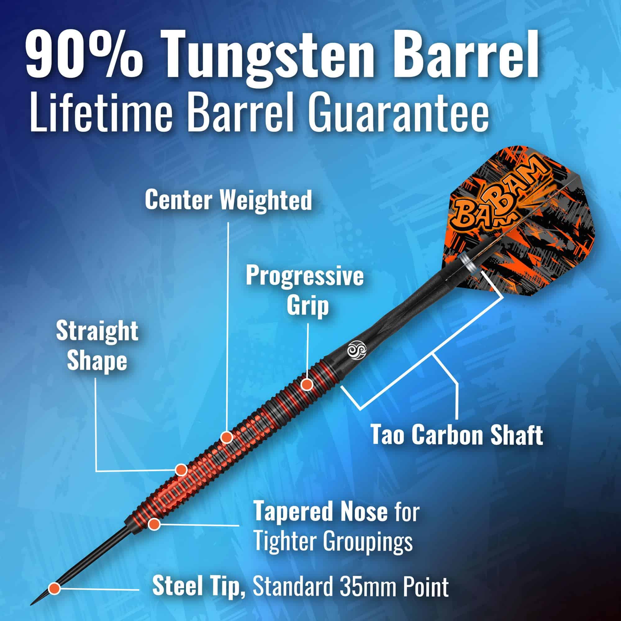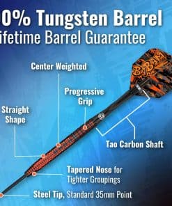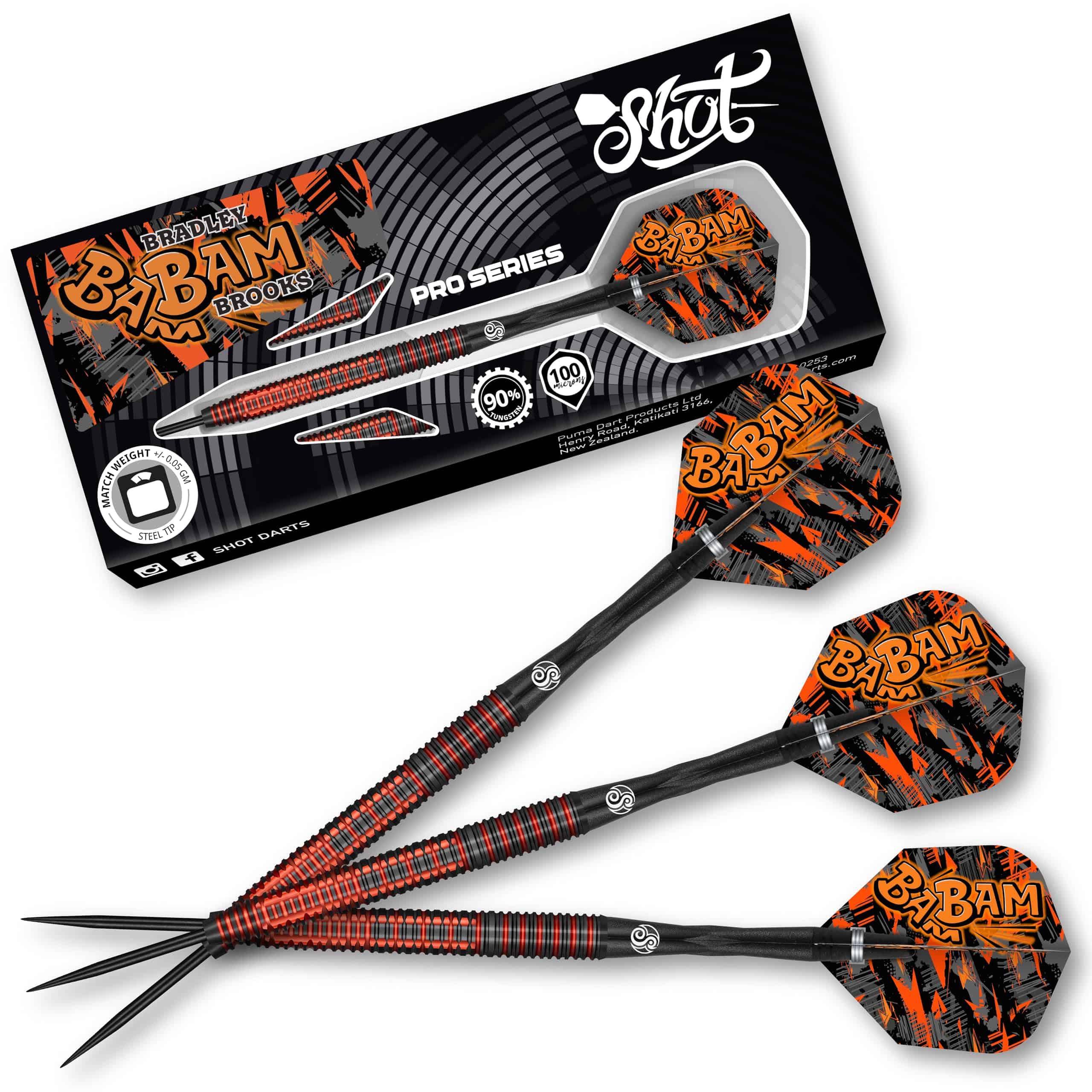 Juego de dardos Bradley Brooks de Shot! Darts de punta de acero de alta calidad que refinan cada lanzamiento para convertirte en el maestro de tu juego. Los conceptos de barril mecanizado con precisión y el atractivo visual mejorado hacen de este juego de dardos una verdadera potencia de rendimiento y estilo. Disfruta de estos dardos en torneos de dardos, en juegos en el bar, en casa, en la oficina y en salas de juegos. Diseñado con un agarre seguro para principiantes y la durabilidad para jugadores profesionales, este set de dardos se adapta a todos los niveles de habilidad. Los dardos tienen zonas de agarre claramente definidas, para apoyar el potencial de puntuación alta y suministrar puntos de referencia fijos a lo largo del barril que agregan consistencia a tu lanzamiento. Mejora tu juego de dardos con este set diseñado para máxima aerodinámica y agrupación estrecha. Hechos en Nueva Zelanda, la dedicación de Shot Darts es traerte los mejores dardos profesionales y de calidad en el mercado. Todos los barriles de dardos de Tungsteno de Shot tienen garantía de por vida. Cada dardo se empareja a mano con tolerancia para obtener mejores resultados. Disfruta de diseños innovadores y dardos que reflejan individualidad, con vuelos de dardos diseñados individualmente que se adaptan al tema de la gama. Dardos hacen un regalo perfecto para cualquier ocasión.