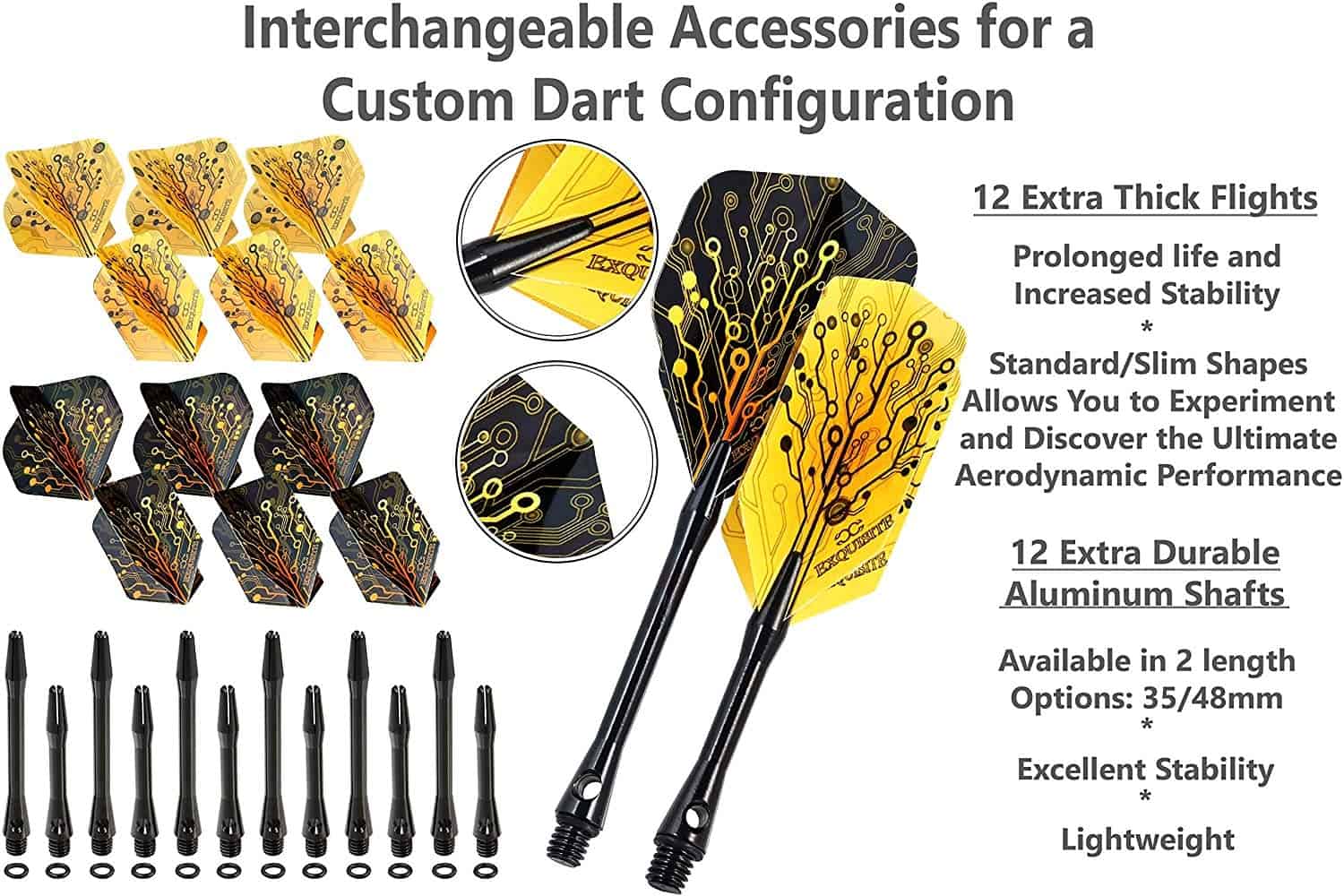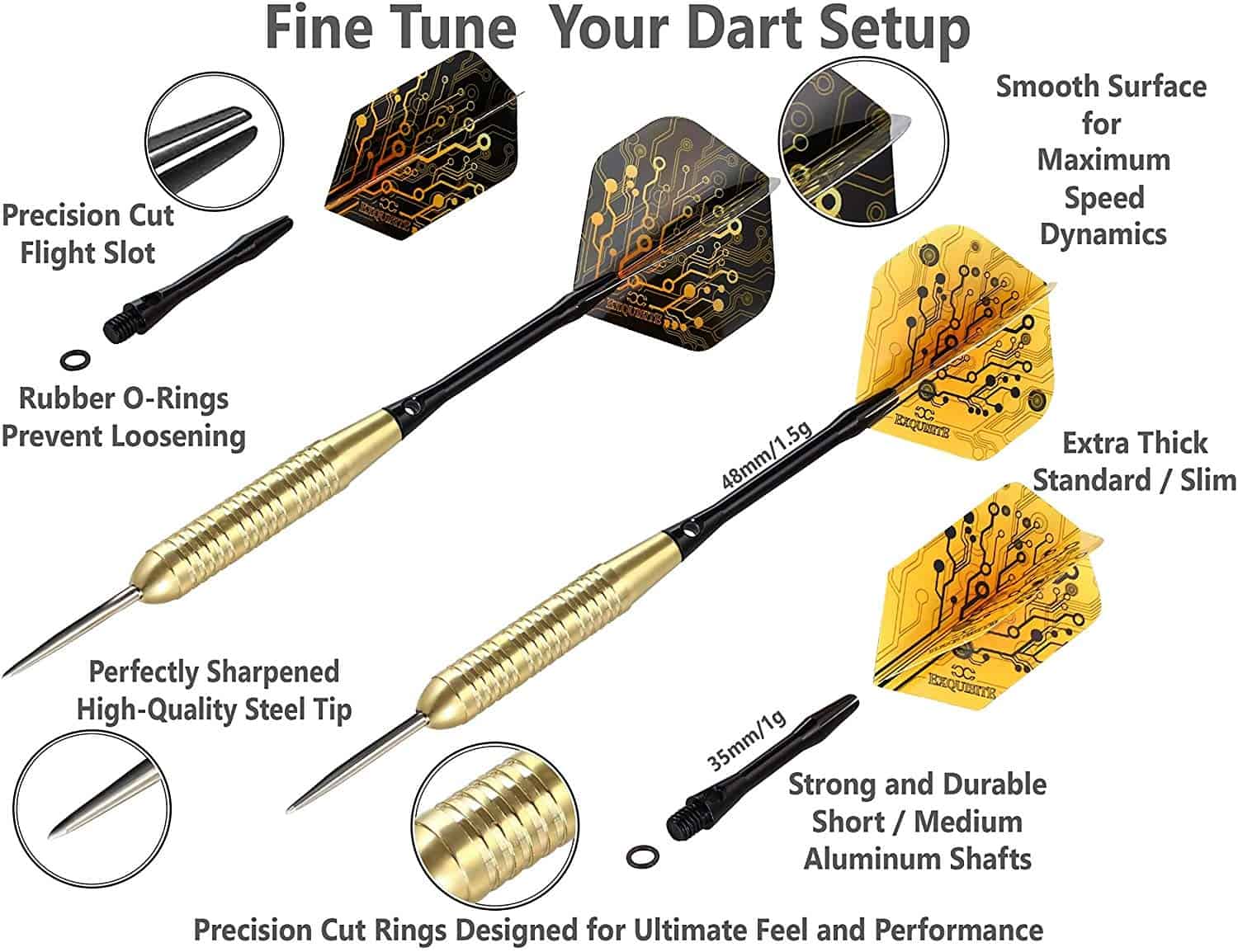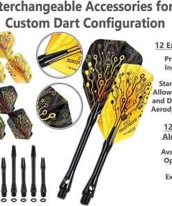 1. ¡La combinación perfecta de barril, varilla y vuelo puede llevar mucho tiempo descubrirlo! El set de dardos CC-EXQUISITE te brinda la posibilidad de elegir y experimentar; puedes probar diferentes combinaciones de barriles, vuelos y longitudes de varillas para DESCUBRIR LA CONFIGURACIÓN CORRECTA como un profesional. 2. ¡El set de dardos de punta de acero SUPERIOR incluye: 6 x 20g High Quality UNBREAKABLE BRASS BARRELS + 12 varillas de aluminio EXTRA DURADERAS en dos longitudes (6 x 35 mm/6 x 48 mm) + 12 O-RINGS para evitar aflojamientos + 12 vuelos en dos formas y diseños diferentes (6 Estándar/6 Delgados) + Herramienta multiusos para dardos + Afilador de dardos y ESTUCHE DELGADO. 3. MÚLTIPLES OPCIONES DE CONFIGURACIÓN. La experimentación te ayudará a descubrir la configuración perfecta de dardos para tu estilo. Creando tu Configuración Personalizada de Accesorios, podrás encontrar la mejor combinación posible para adaptarse a tu estilo y habilidad. 4. ¡ESSENCIAL PARA DESARROLLAR Y MEJORAR TUS HABILIDADES! La configuración correcta es algo muy personal que encontrarás después de experimentar con tus dardos. Prueba diferentes combinaciones de accesorios para tu set de dardos para ver cuál funciona mejor para ti, encuentra una configuración con la que te sientas cómodo y ¡tus amigos presumirán de tus habilidades de lanzamiento! 5. NUESTROS DARDOS PROFESIONALES ESTÁN HECHOS PARA DURAR. Diseñados para ser la elección de futuros campeones, ¡nuestro paquete te brinda lo que muchos jugadores profesionales ya han descubierto: la configuración de dardos personalizada!