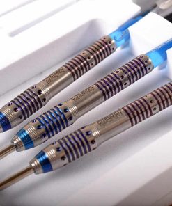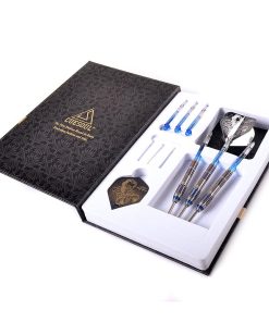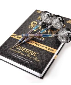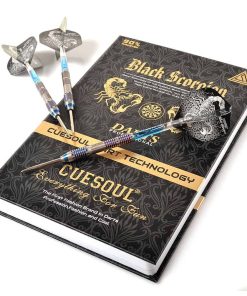 Set de dardos de punta de acero CUESOUL Black Scorpion de 24g de tungsteno, diseñado con un barril de 3 piezas de 90% de tungsteno para un equilibrio óptimo, excelente agarre y recubierto con un atractivo acabado en titanio azul. El peso del barril es de 24g, con un diámetro de 7.2mm (máx.) y una longitud de 50mm, con un punto de 27mm. Incluye 6 ejes azules de cristal de 41mm de longitud (tornillo no incluido) y 6 vuelos metálicos con patrones de escorpión dorado y plateado. Todo ello presentado en una caja con forma de libro creativo para un almacenamiento fácil y elegante.