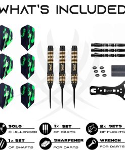 2. PRECISIÓN EN SU MÁXIMA EXPRESIÓN Dardos de acero profesionales con barriles de latón moleteados para una precisión exacta, ejes de aluminio para mayor durabilidad y anillos de goma para un bloqueo seguro. Incluye un afilador y llave de reparación.