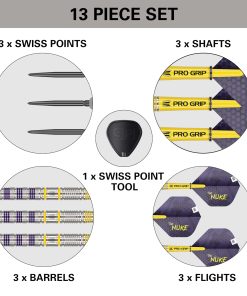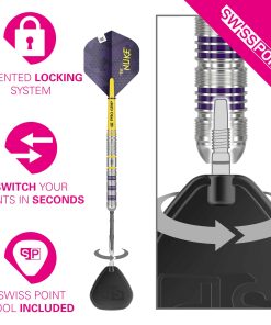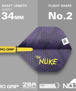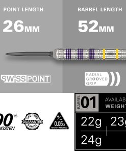 Dardos Luke Littler Loadout, respaldados por The Nuke, el campeón mundial de dardos más joven de la historia, ganando el Campeonato Mundial de Dardos de la PDC 2025 a tan solo 17 años de edad. Luke ha causado sensación en el mundo de los dardos, con la mayor cantidad de 180 registrados en un año calendario y una creciente lista de títulos Senior de la PDC, continúa reescribiendo los libros de récords y redefiniendo el juego. El set de dardos cuenta con un barril recto de tungsteno del 90%, diseñado con una combinación de estrías radiales y nano para un agarre excepcional y control durante el juego. El acabado pulido en plata del barril se contrasta con anillos de colores púrpura y amarillo vibrantes, creando una estética audaz y dinámica. Equipados con Puntas Suizas de 26mm en negro, estos dardos utilizan un sistema de bloqueo patentado para reemplazar rápidamente y fácilmente la punta utilizando la herramienta de punta suiza incluida. La avanzada tecnología de conicidad y rosca garantiza un ajuste seguro, mejorando la estabilidad y la precisión durante el juego. El set incluye un Eje Pro Grip Tag corto para un inicio sin problemas y un agarre firme de la pluma, minimizando las caídas. Completado con las Plumas Pro Ultra No.2 de edición del jugador Nuke, fabricadas con un material duradero de 100 micrones, estas plumas cuentan con una impresión única de punto UV que mejora el agarre del eje y protege el diseño del desgaste. El set de dardos incluye 3 barriles Loadout de tungsteno del 90%, 3 Puntas Suizas negras (26mm), 3 Ejes Pro Grip amarillos (cortos, 34mm), 3 Plumas Luke Littler Pro Ultra No.2, y 1 Herramienta de Puntas Suizas.