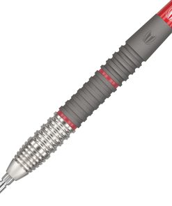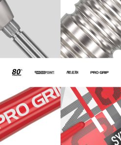 Target Darts Step Beyond – Sync Dart Range – Hecho pensando en jugadores de dardos, creando un set de dardos de punta de acero de 80% de tungsteno profesional – Versión de punta de acero Sync 03 23 gramos Swiss Point. Barril de Fresado de Precisión – (Longitud del barril de 52 mm, Diámetro del barril de 6.9 mm) Los barriles están diseñados con cortes dobles, la parte delantera cuenta con maquinado ranurado cromado radial y en la parte trasera hay un corte ranurado más tradicional en todo el barril. El barril luego se ve mejorado con un vibrante color rojo en las ranuras y granallado en la parte trasera para ofrecer una sensación de agarre variable. Tecnología Swiss Point – Contiene 26 mm Silver Smooth – Cambia tu longitud, estilo y color de punta en segundos usando el sistema de bloqueo patentado que garantiza que tus puntas permanezcan bloqueadas durante el juego. Diseño Vibrante y Elegante – Los dardos se completan con un eje Pro Grip Rojo y diseños de vuelo de dardos Sync en rojo, blanco y negro exclusivos. El paquete contiene – 3 x Barriles de Dardo, 3 x Ejes Cortos Pro Grip Rojo, 3 x Vuelos de Dardos Diseñados Sync No. 6, 3 x Puntas Silver Smooth de 26 mm, 1 x Estuche de Dardos.