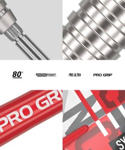 Target Darts Step Beyond – Sync Dart Range – Creado pensando en jugadores de dardos, este set profesional de dardos con punta de acero de 80% de tungsteno Sync 02 de 24 gramos de la marca Target. Barril de precisión moldeado – (Longitud del barril de 53mm, Diámetro del barril de 7mm) Los barriles están diseñados con cortes duales, la parte delantera cuenta con mecanizado radial estriado cromado y en la parte trasera hay un corte estriado más tradicional en todo el barril. El barril se ve realzado aún más por el vibrante color rojo en los surcos y el granallado en la parte trasera para ofrecer una sensación de agarre variable. Tecnología Swiss Point – Contiene Punto Suizo Plateado liso de 26mm. Cambia la longitud, estilo y color de tu punta en segundos utilizando el sistema de bloqueo patentado que garantiza que tus puntos permanezcan bloqueados durante el juego. Diseño vibrante y elegante – Los dardos se completan con un eje Pro Grip rojo y diseños exclusivos de vuelos Sync en rojo, blanco y negro. El paquete incluye: 3 barriles de dardos, 3 ejes Pro Grip cortos en rojo, 3 vuelos Sync No. 6 diseñados, 3 puntos de Punto Suizo Plateado liso de 26mm, 1 estuche de dardos.