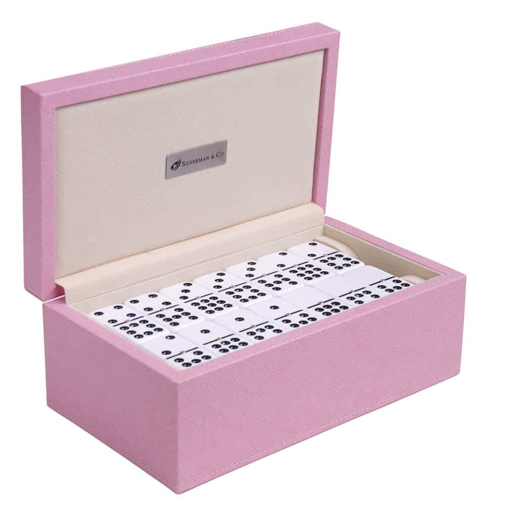 Este set de domino Doble 9 viene en un estuche de piel rosa y contiene 55 fichas de domino blancas con giradores.
