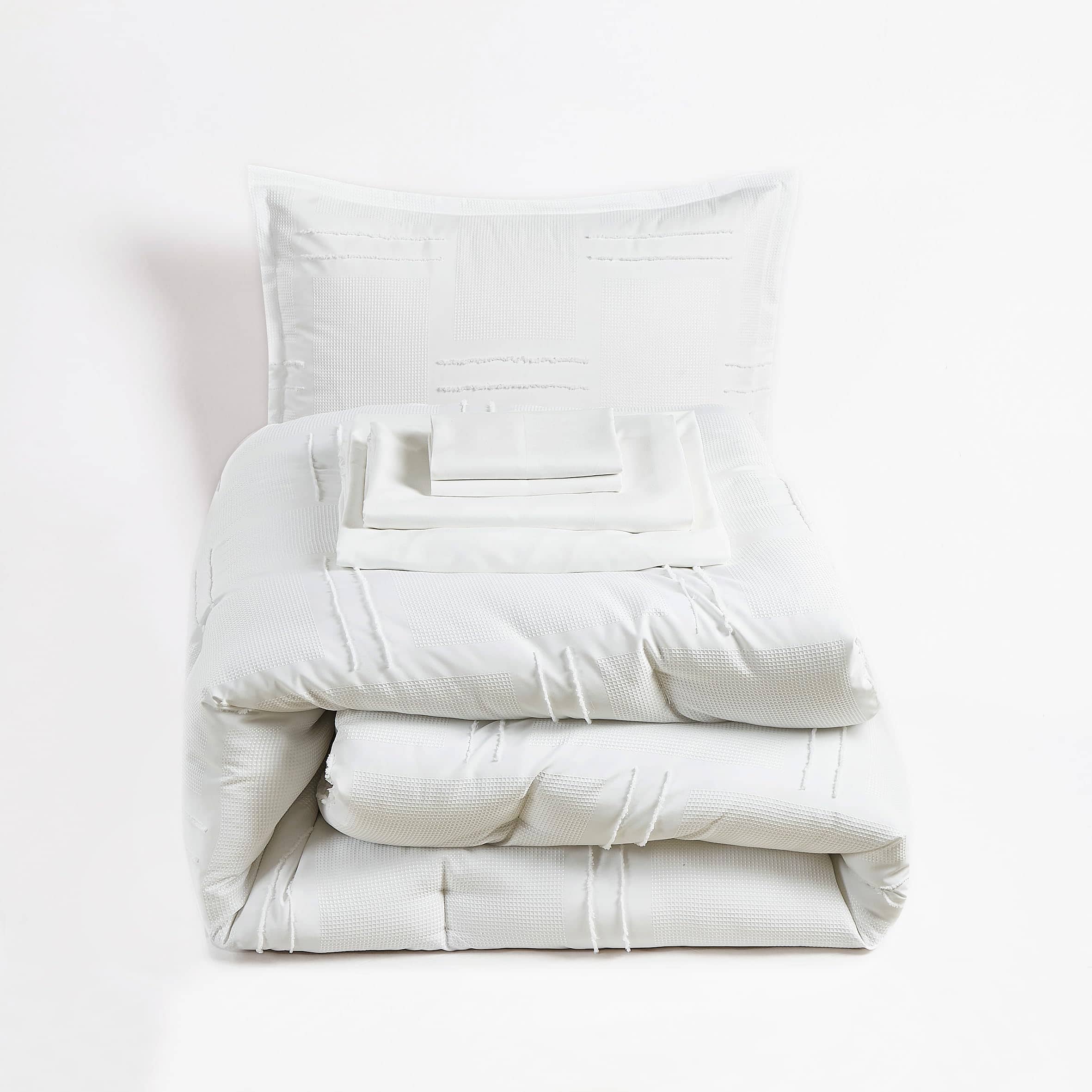 Experimenta la elegancia de este sofisticado set, que presenta un patrón a rayas clip jacquard con un diseño geométrico contemporáneo. La tela única con textura en panal agrega profundidad y dimensión, creando un impacto visual impresionante que elevará cualquier decoración de dormitorio. El cuidado con el que está hecho este set de 7 piezas incluye todo lo que necesitas para transformar tu dormitorio en un refugio acogedor. El set incluye un edredón, dos fundas de almohada a juego, una sábana plana, una sábana ajustable y dos fundas para almohadas. Hecho de poliéster de alta calidad, el set de edredón está diseñado para durabilidad y confort duradero. La tela suave y transpirable garantiza un sueño reparador, mientras que la sensación ligera proporciona calidez sin peso. El juego de sábanas incluido es blanco y es un microfibra cepillada para un toque más suave. Mientras que las sábanas ajustables se ajustan a colchones de hasta 15 pulgadas de bolsillo profundo. Actualiza la decoración de tu dormitorio con el Set de Edredón Chezmoi Collection Clip Jacquard Geométrico de 7 Piezas para Cama y disfruta de la experiencia de dormir definitiva todas las noches. Agrega un toque de lujo a tu hogar con este exquisito conjunto de ropa de cama hoy mismo!