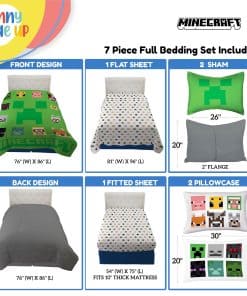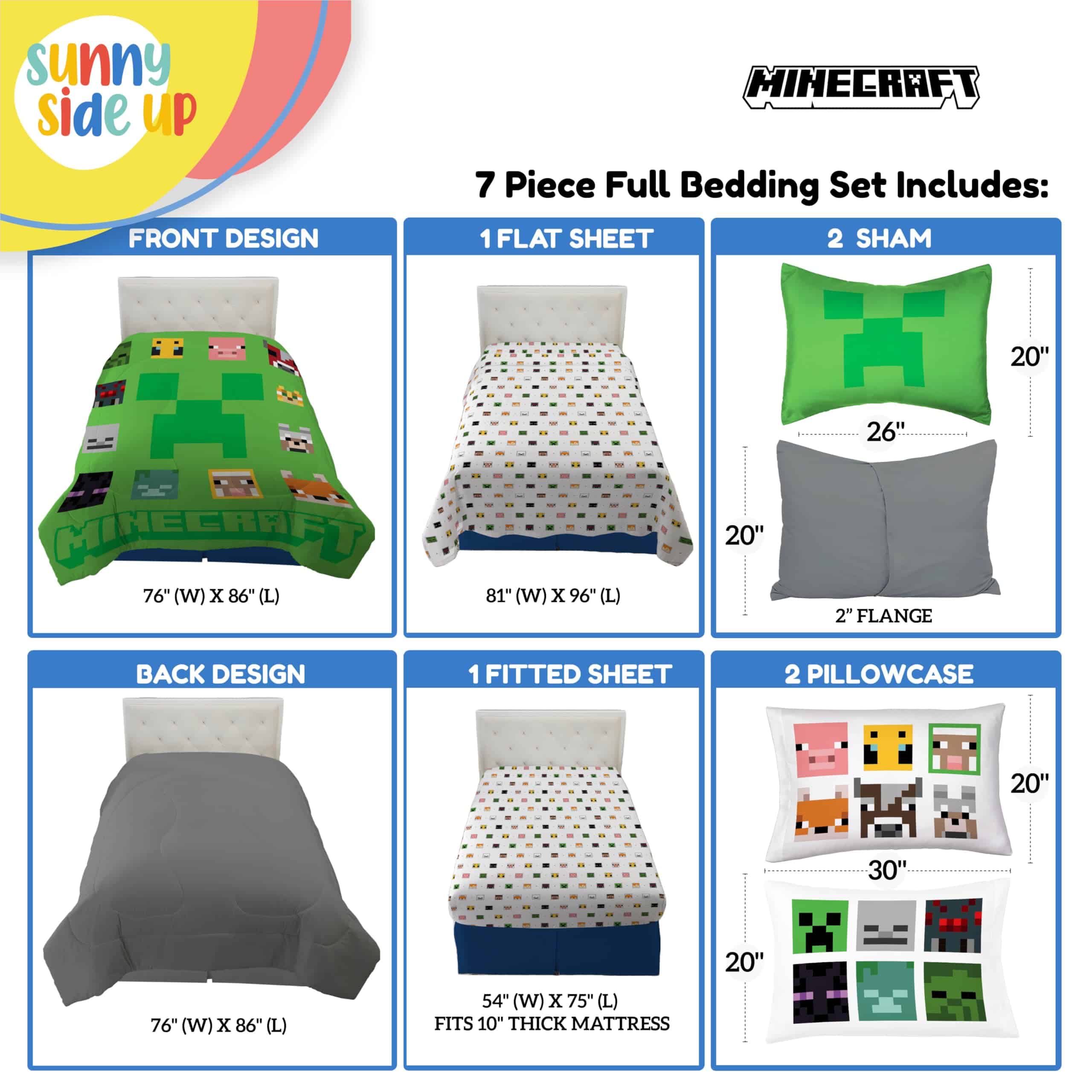1. DISEÑO DULCE Y JUGUETÓN El juego de cama completo incluye (1) edredón de 76 x 86 pulgadas, (1) sábana ajustable de 54 x 75 pulgadas, (1) sábana plana de 81 x 96 pulgadas, (1) funda de almohada estándar de 20 x 30 pulgadas y (2) fundas de almohada de 20 x 26 pulgadas. Nuestro material de microfibra suave permitirá que su hijo se duerma y que comiencen los sueños alegres!. 2. CUIDADO SIMPLE Y FÁCIL Nuestro tejido transpirable es súper suave y genial durante todo el año. Para limpiar, lavar a máquina en frío. Secar a baja temperatura. 3. DECORACIÓN AUDAZ Y SIN ESFUERZO – Haz que la hora de dormir sea la mejor parte del día con nuestro juego de cama caprichoso, que presenta a los personajes favoritos de Minecraft de su hijo Creeper, Enderman, Fantasma, Cerdo, Oveja y Abeja, en colores vibrantes. 4. COMPRA LA COLECCIÓN DE MINECRAFT Proporcione a su hijo los sueños más dulces con nuestros otros productos de Minecraft – Ropa de cama y accesorios coordinados disponibles (se venden por separado). 5. ACERCA DE LA MARCA – Descubre un mundo de ropa de cama, diseñado cuidadosamente para niños pequeños, preescolares y jóvenes de corazón. En Sunny Side Up, creemos que cada sueño debe ser una aventura encantadora, por lo que hemos creado el destino perfecto para todas sus necesidades de ropa de cama. ¡Nuestros juegos de cama son una celebración de luminosidad y felicidad, elaborados con amor para llevar calidez y comodidad a cada habitación. Acepta el lado más soleado del sueño y deja que comiencen los sueños en la comodidad de la ropa de cama de Sunny Side Up!