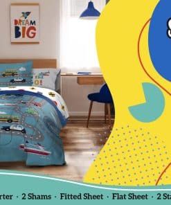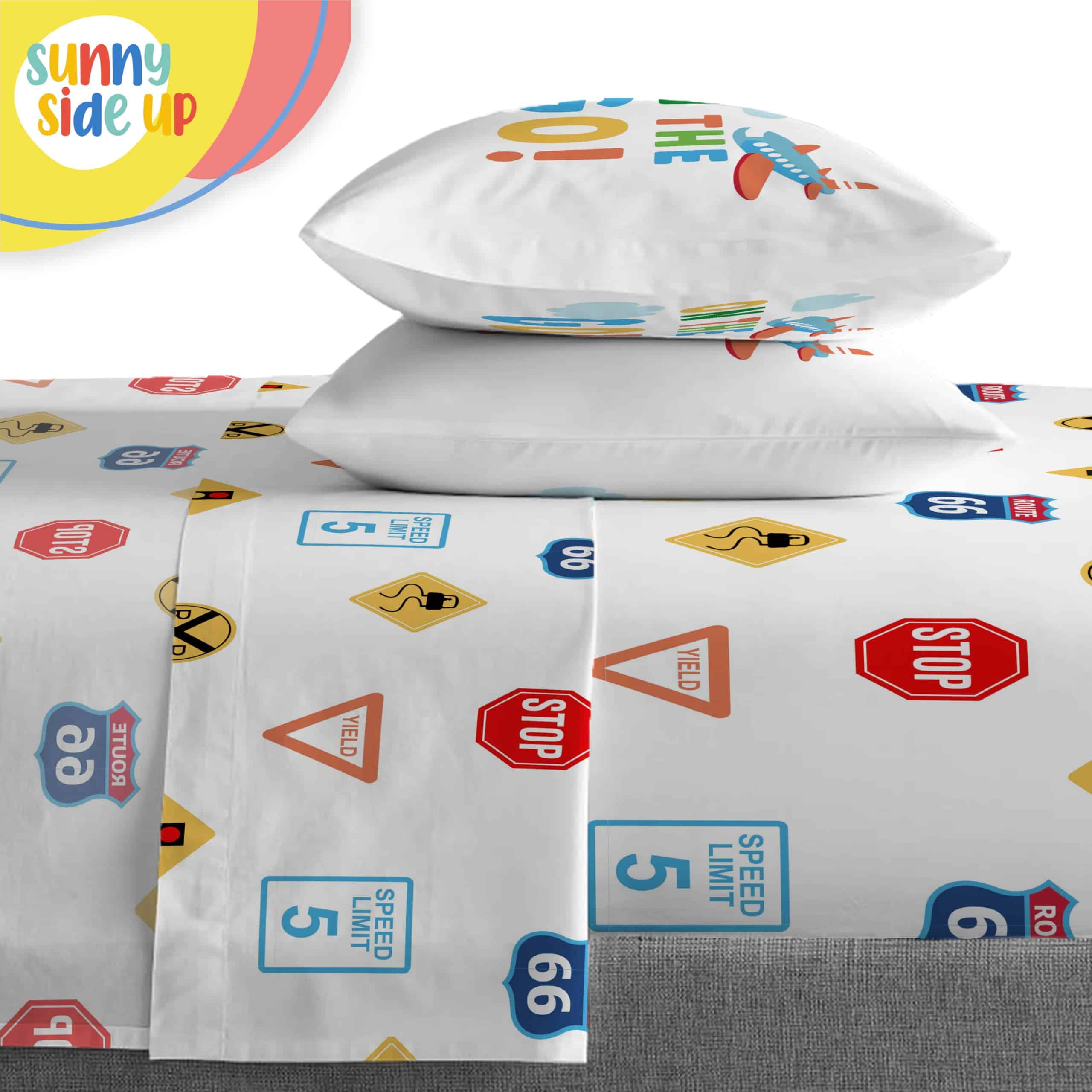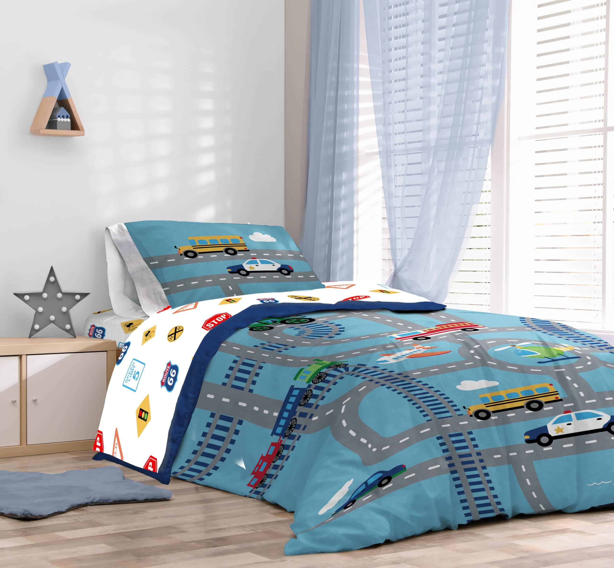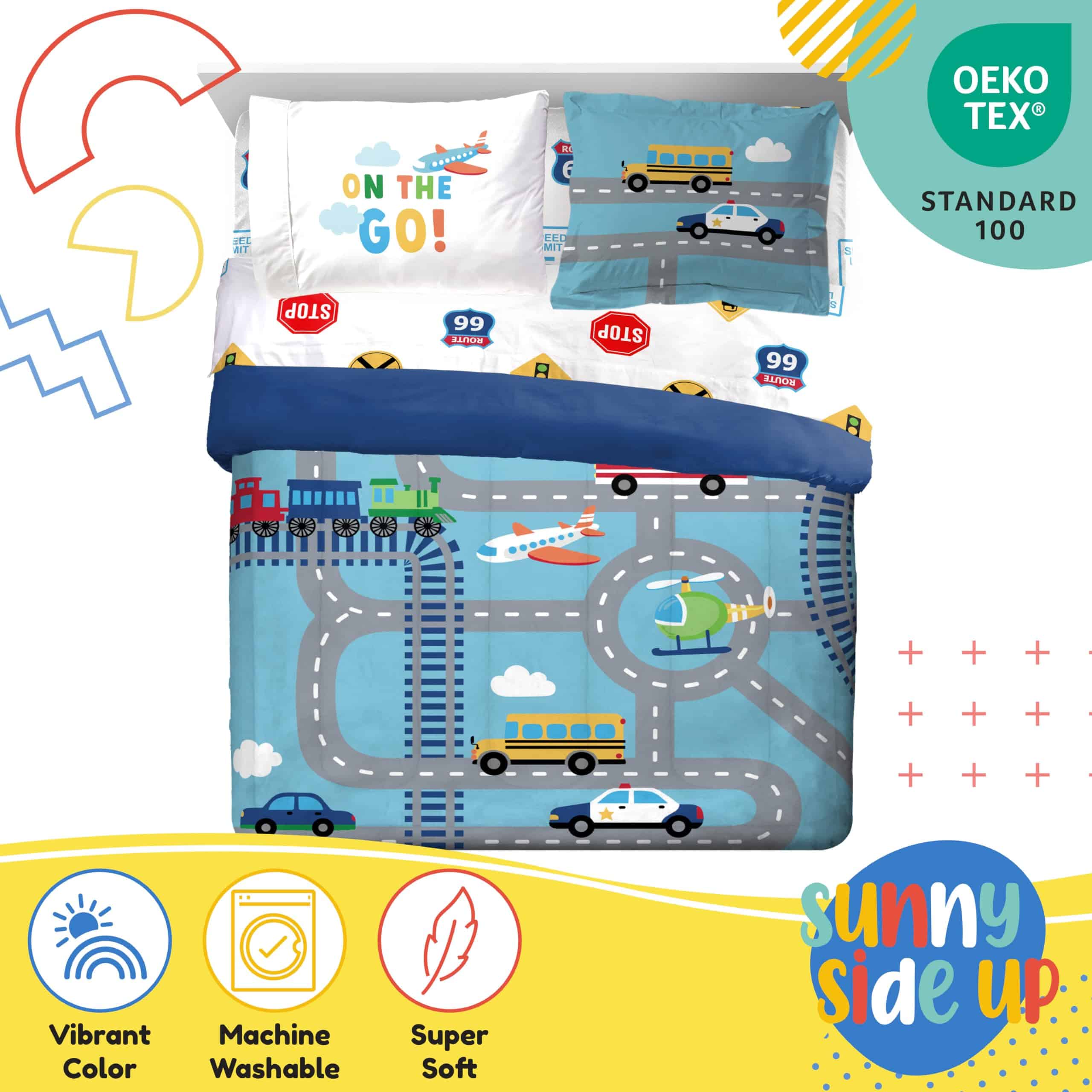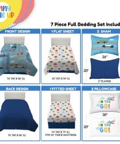 1. DISEÑO DULCE Y JUGUETÓN: El Set de Cama Full incluye (1) edredón completo de 76 x 86 pulgadas, (1) sábana ajustable de 54 x 75 pulgadas, (1) sábana plana de 81 x 96 pulgadas, (2) fundas de almohada de 20 x 26 pulgadas y (2) almohadas estándar de 20 x 30 pulgadas. Nuestro material de microfibra suave permitirá a tu hijo quedarse dormido y ¡que comiencen los sueños! 2. CUIDADO SIMPLE Y FÁCIL: ¡Nuestra tela transpirable es súper suave y perfecta durante todo el año! Para limpiar, lavar a máquina en frío. Secar a baja temperatura. 3. DECORACIÓN AUDAZ Y BRILLANTE: Haz que la hora de dormir sea la mejor parte del día con nuestro conjunto de cama caprichoso, con autos y aviones, en colores vibrantes. 4. EXPLORA NUESTRAS OTRAS COLECCIONES: Proporciona a tu hijo los sueños más dulces con nuestras otras colecciones de ropa de cama. – Ropa de cama y accesorios a juego disponibles (se venden por separado). 5. SOBRE LA MARCA: Descubre un mundo de ropa de cama, diseñada cuidadosamente para niños pequeños, preescolares y jóvenes de corazón. En Sunny Side Up, creemos que cada sueño debería ser una aventura encantadora, por lo que hemos creado el destino perfecto para todas tus necesidades de ropa de cama. ¡Nuestros juegos de cama son una celebración de la luminosidad y la felicidad, creados con amor para llevar calidez y confort a cada habitación. Acepta el lado más soleado del sueño y deja que comiencen los sueños en la comodidad de la Ropa de Cama Sunny Side Up!