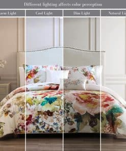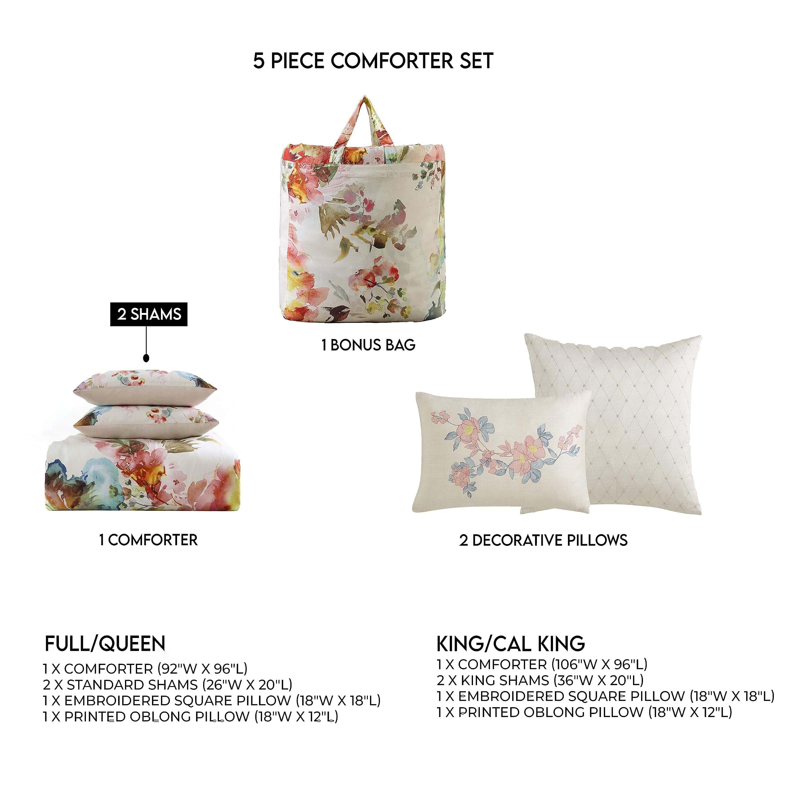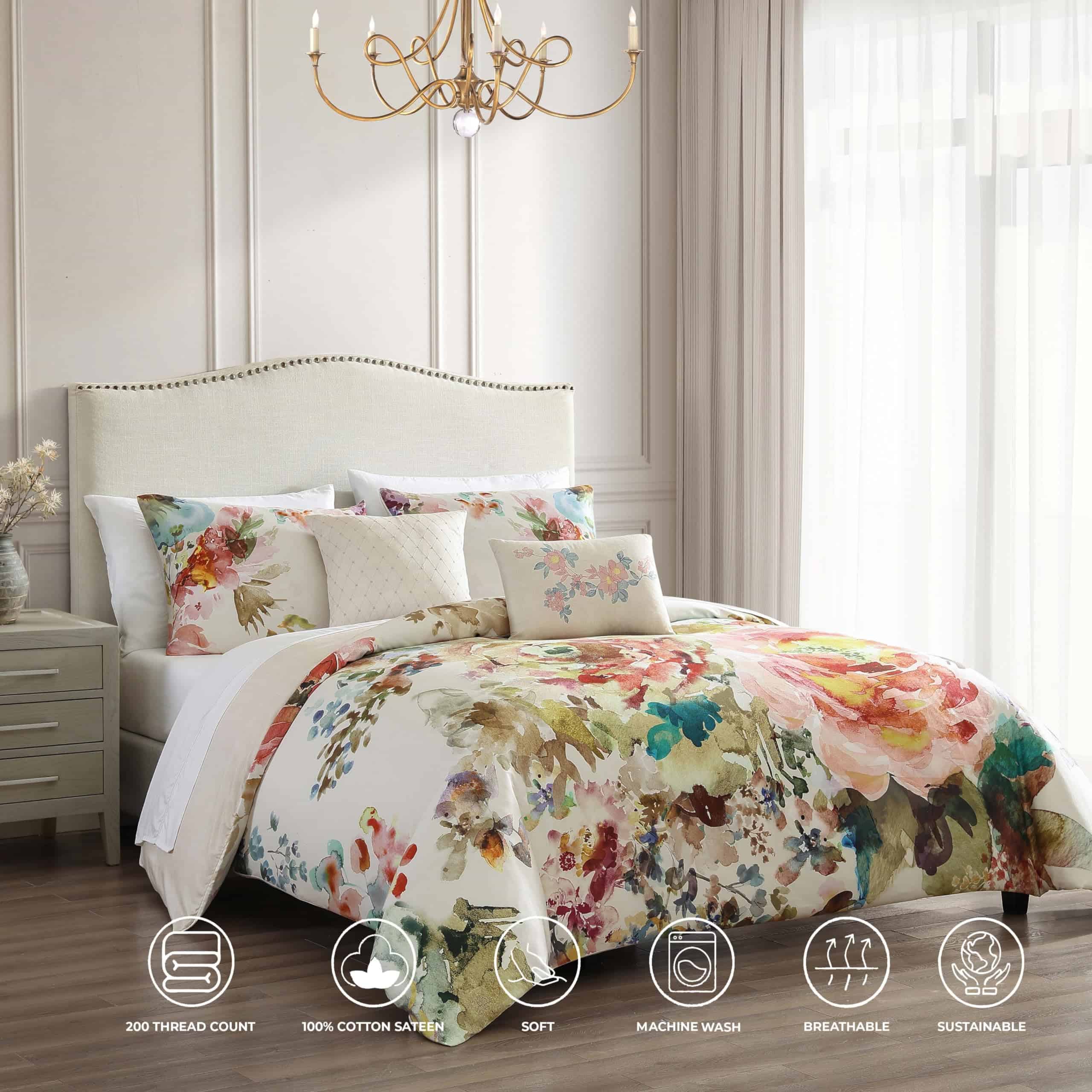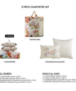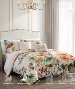 5. INCLUYE- 1 edredón (106″ W x 96″ L), 2 fundas de almohada King (36″ W x 20″ L), 1 cojín cuadrado bordado (18″ W x 18″ L) y 1 cojín oblongo estampado (18″ W x 12″ L).