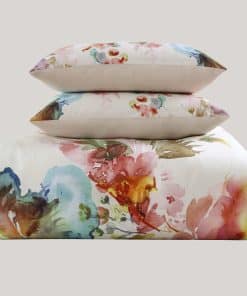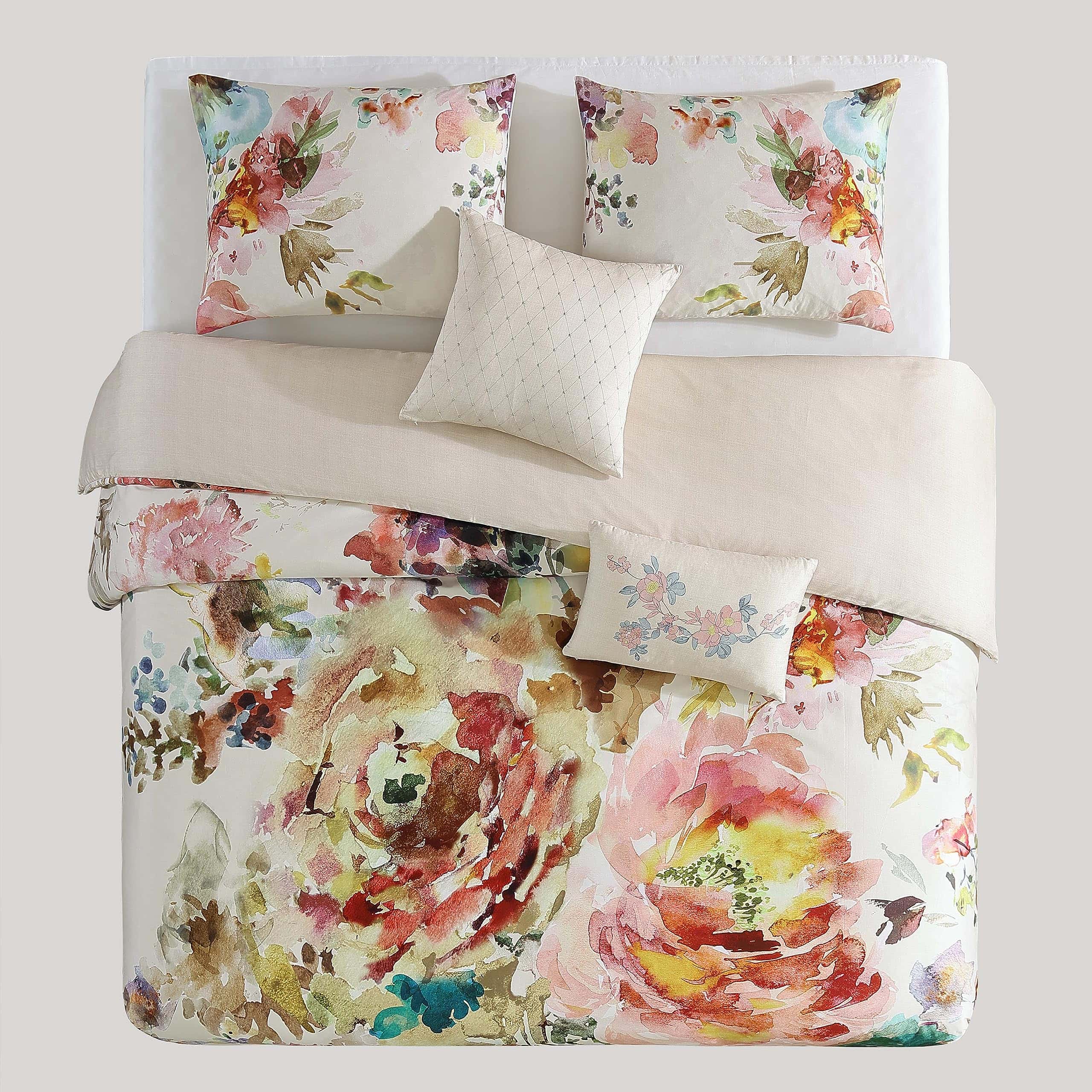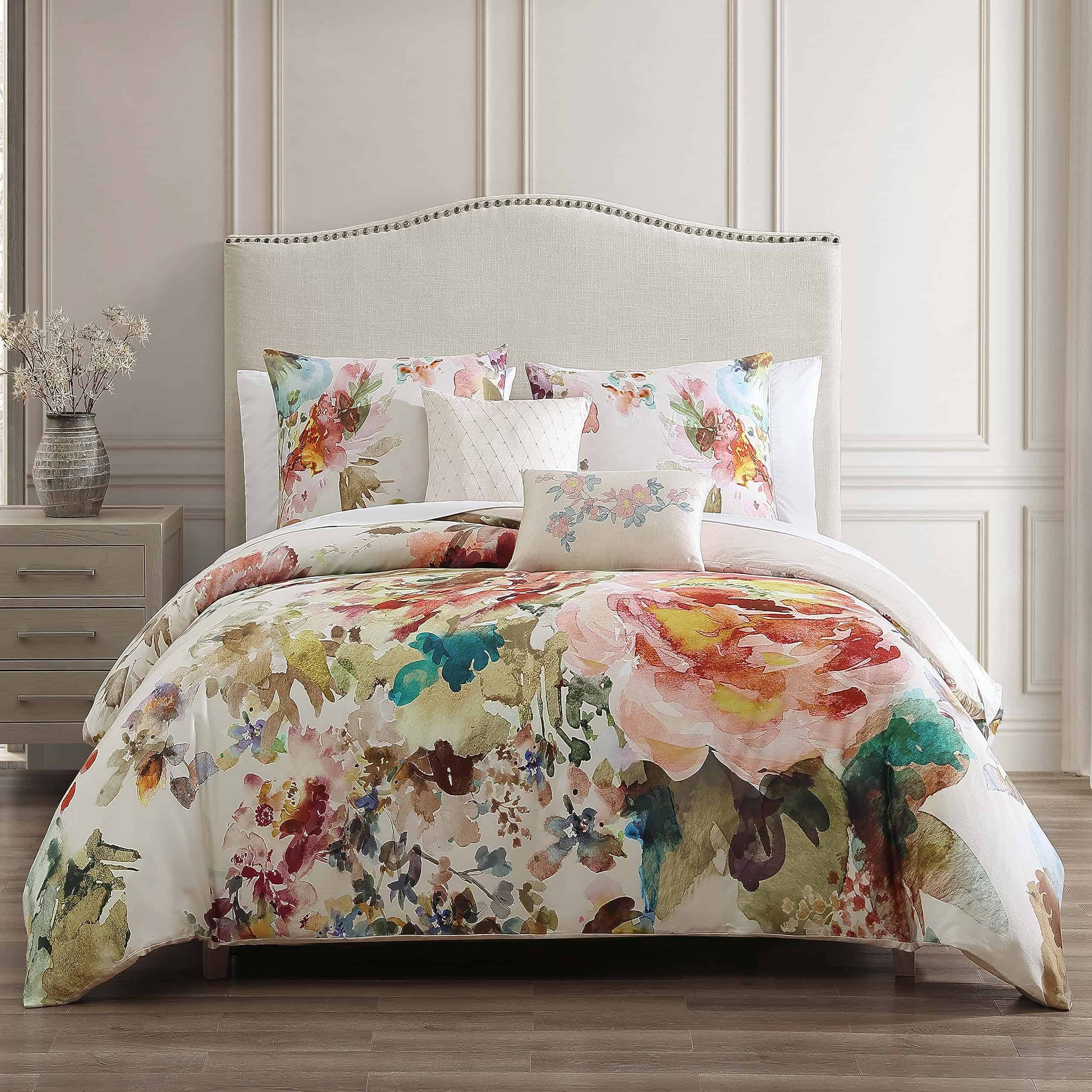 2. FRENTE DEL EDREDÓN- Hermosas flores en tonos joya parecen estar pintadas a mano sobre un base cálida de marfil.