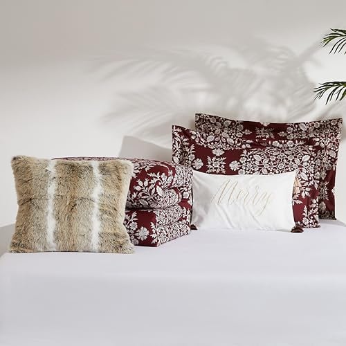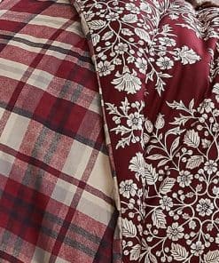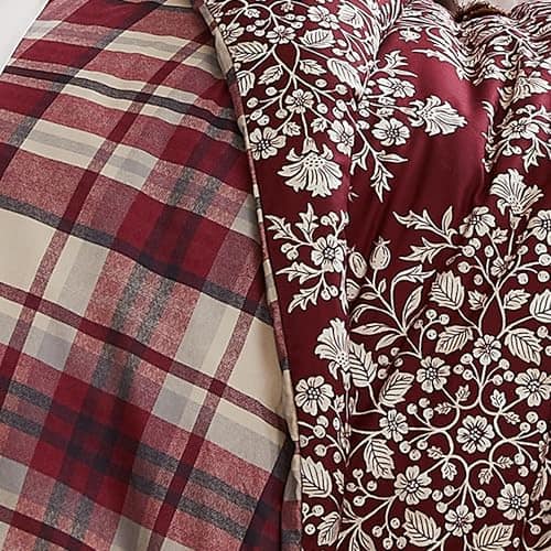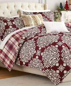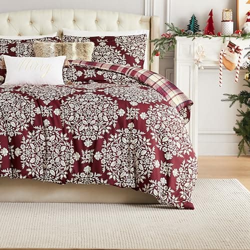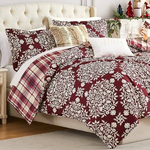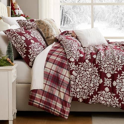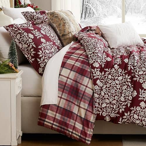2. TRANSFORMA TU HABITACIÓN EN UN RETIRO ACOGEDOR DE NAVIDAD: Set de cama rojo de tamaño queen con temática de villancico navideño con ramitas de acebo por un lado y un estampado de cuadros festivos rojos por el otro. Los cojines y fundas navideñas rematan el look navideño.