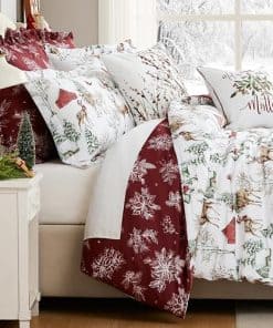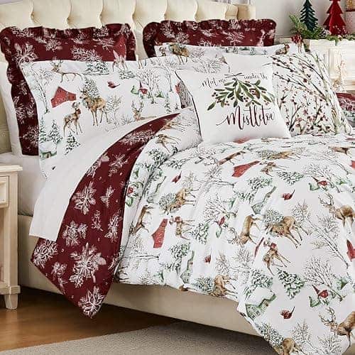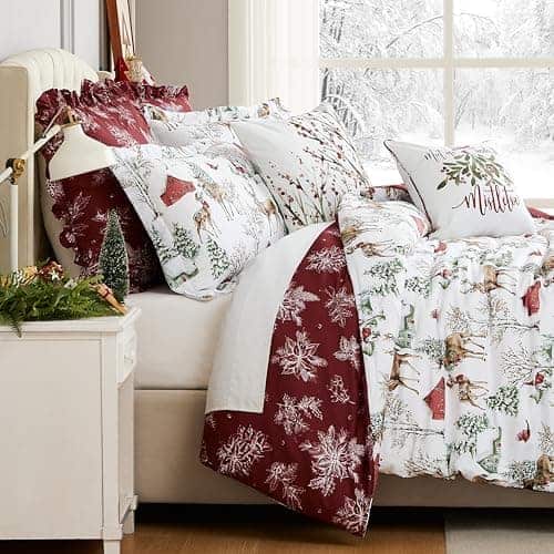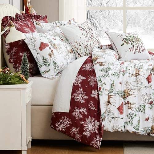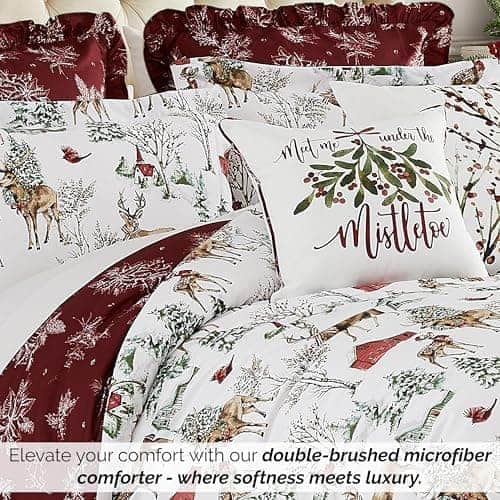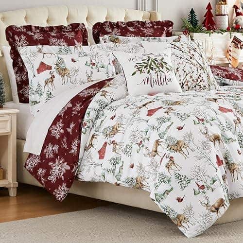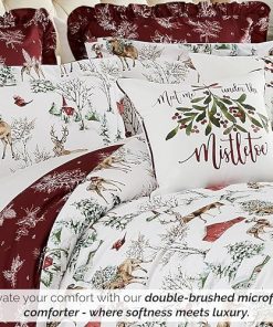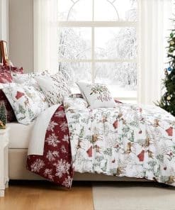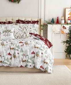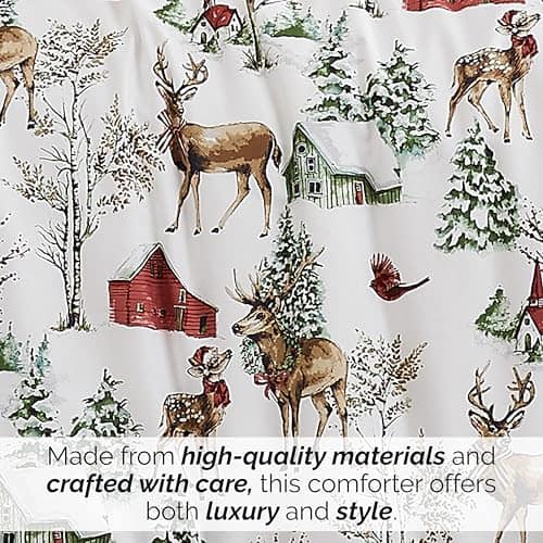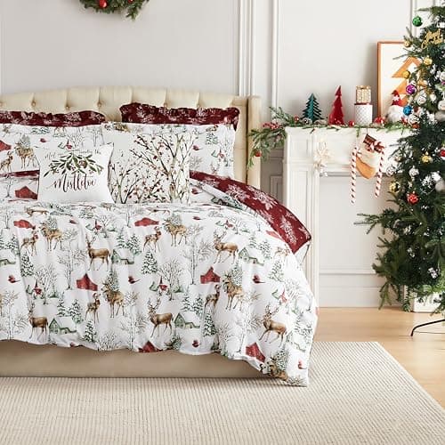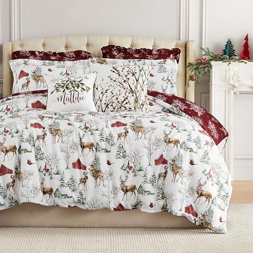 Set de edredón de Navidad tamaño individual y XL que incluye edredón acogedor, cojín decorativo y funda de almohada de Navidad que pondrá a su familia e invitados en el espíritu navideño. Transforma tu dormitorio en un acogedor refugio navideño con este juego de edredón de Navidad temático en blanco con imágenes de la granja de Navidad, muérdago, acebo, árboles de Navidad, flores de Poinsettia y Renos.