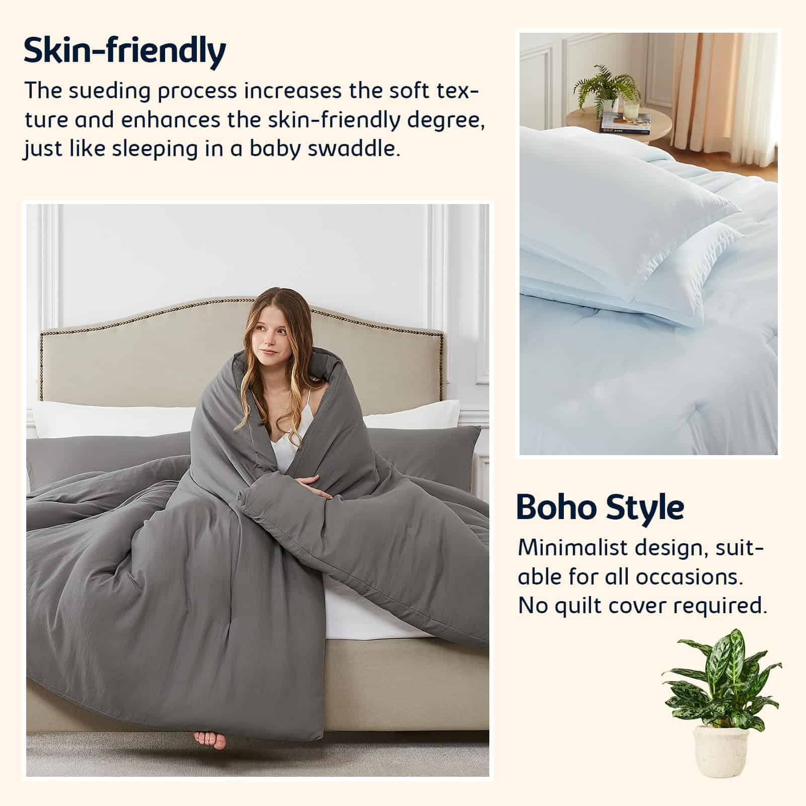 1. Extremadamente Suave y Esponjoso: Microfibra lavada al 100% y proceso productivo premium ofrecen una sensación ultra suave en la mano. El set de edredón tamaño queen extra grande está relleno de microfibra alternativa al plumón transpirable, ofrece una comodidad similar a las nubes que te permite disfrutar de tu sueño toda la noche.