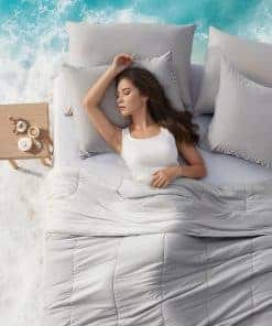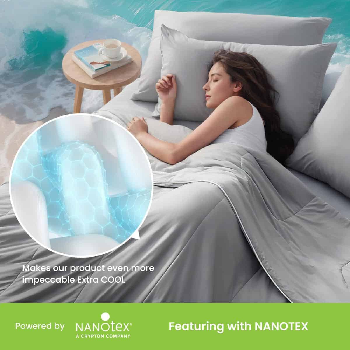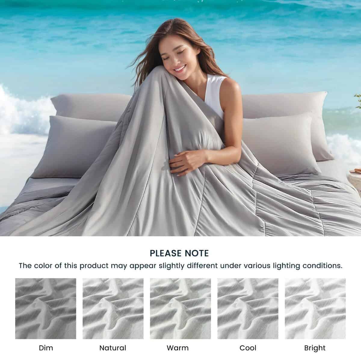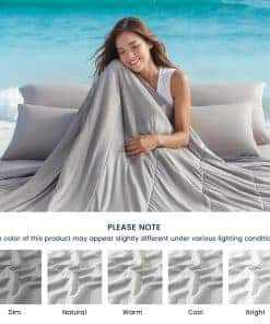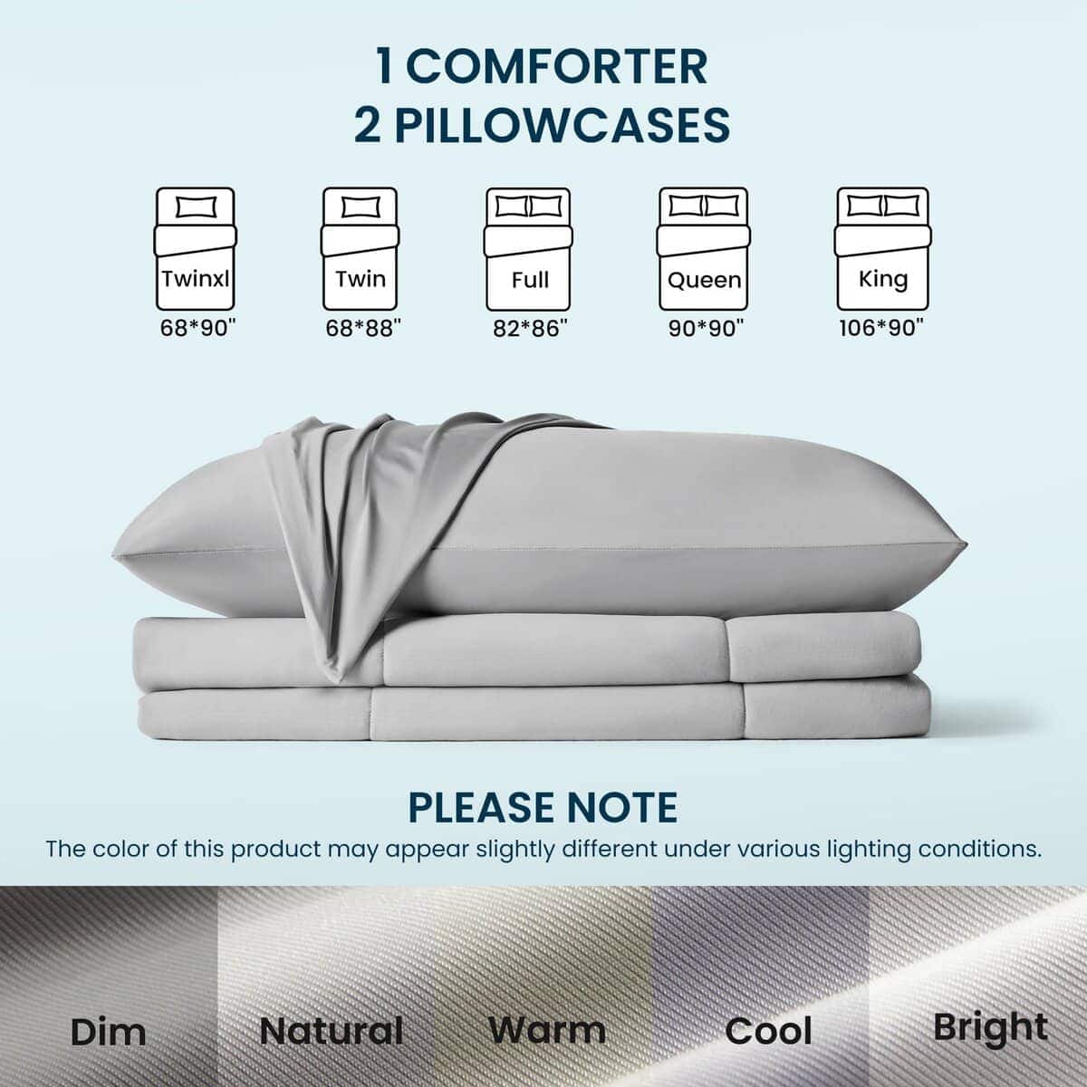 1. Edredón reversible de enfriamiento: Este edredón de enfriamiento cuenta con fibras de enfriamiento y tecnología Nanotex, que absorben rápidamente el calor corporal y bajan instantáneamente la temperatura de la piel, manteniéndote fresco y cómodo toda la noche. Es especialmente adecuado para el verano y para aquellos que duermen calientes. 2. Suave y transpirable: La ligera, transpirable y elástica tela de jersey abraza suavemente tu cuerpo, brindando una experiencia de sueño confortable y relajante. Incluso la piel sensible puede sentir su suavidad. Este producto cumple con los estándares MADE IN GREEN, asegurando que puedas usarlo sin preocupaciones. 3. Fácil de cuidar: El edredón está hecho de materiales suaves, esponjosos y transpirables que son duraderos y mantienen su calidad incluso después de múltiples lavados sin apelmazarse. Es apto para lavar a máquina para una limpieza fácil. No planchar ni usar lejía. Cuelgue para secar o use la secadora a baja temperatura para evitar dañar las fibras internas. 4. Lo que obtienes: El set de edredón de enfriamiento queen incluye un edredón de 90 x 90 pulgadas y dos fundas de almohada de 20 x 26 pulgadas. El elegante color gris complementa cualquier decoración de dormitorio. Empaquetado en una elegante caja de regalo, es adecuado para aquellos que duermen calientes, hombres y mujeres, mamás y papás, amigos y amantes. 5. Servicio al cliente: SLEEP ZONE tiene más de 40 años de experiencia en el diseño y fabricación de ropa de cama. Ofrecemos productos de alta calidad, por lo que puedes realizar tu pedido con confianza. Si tienes alguna pregunta o inquietud, contáctanos.