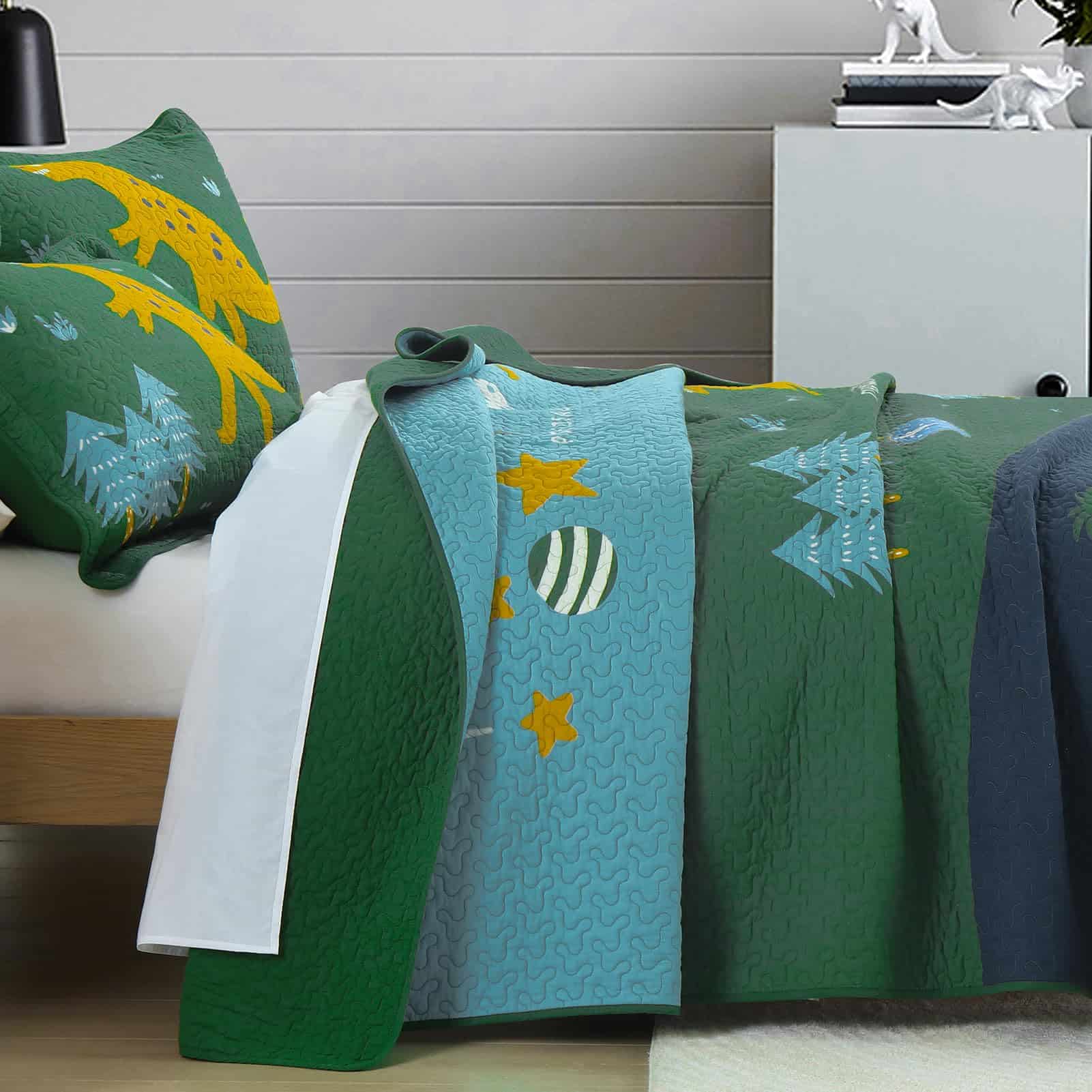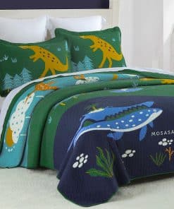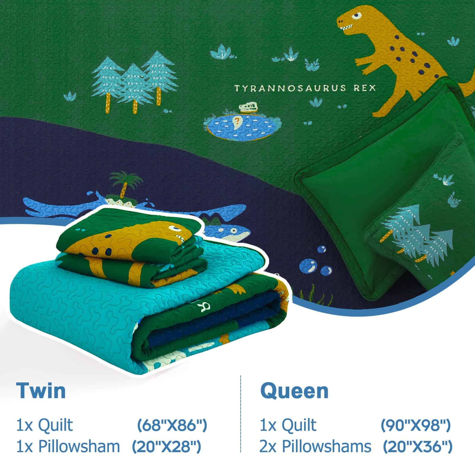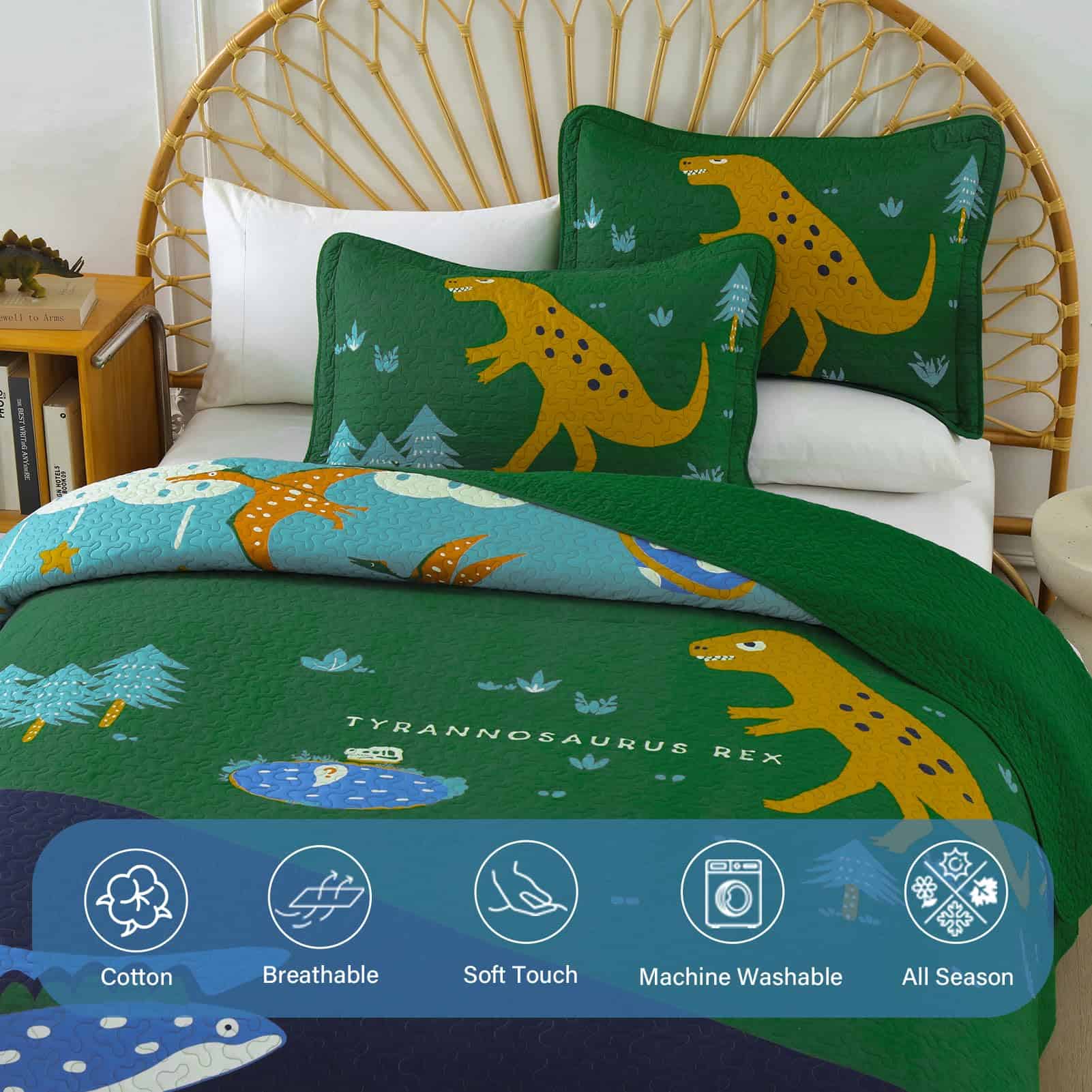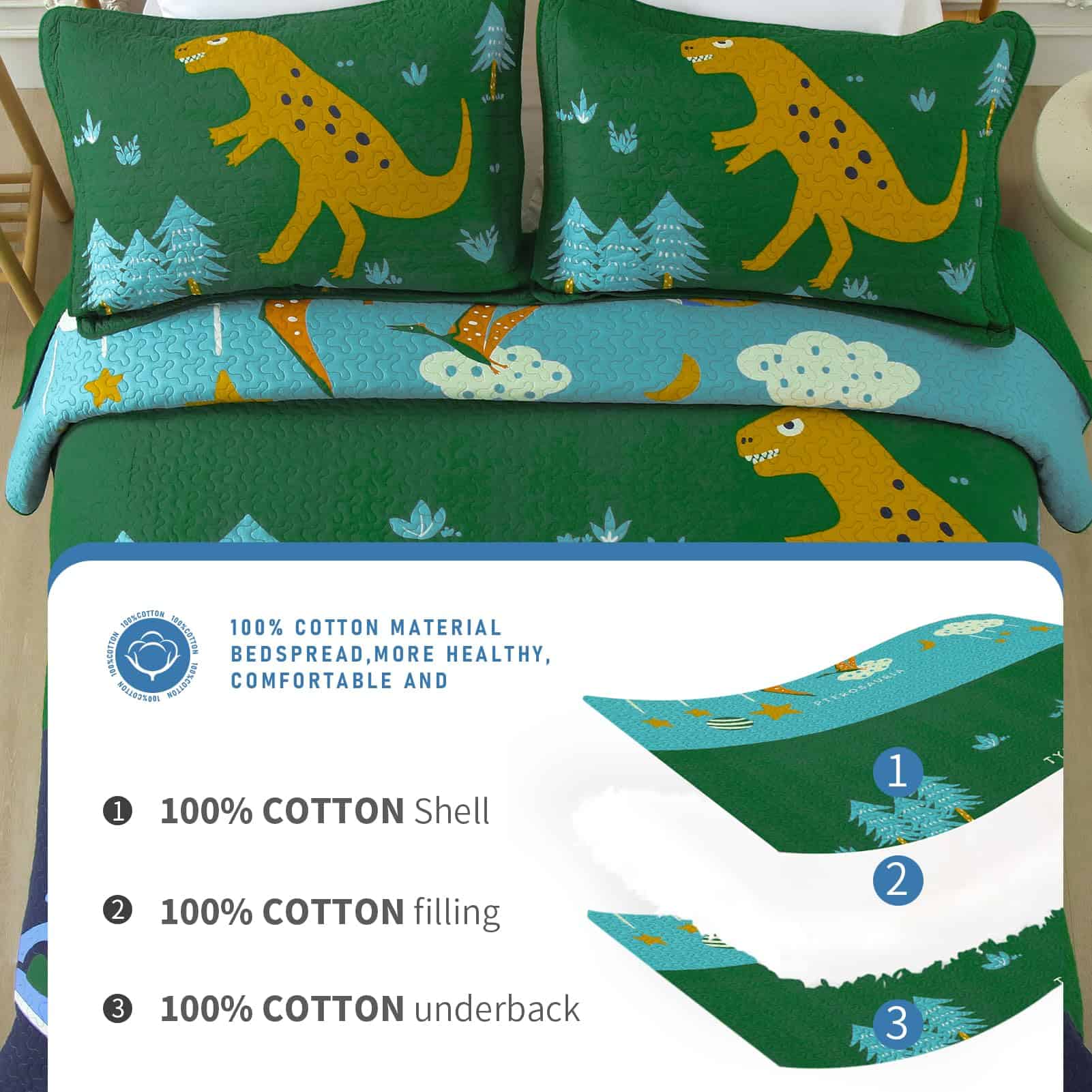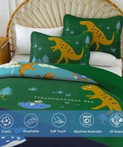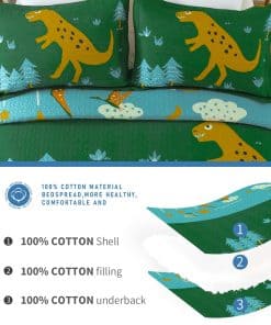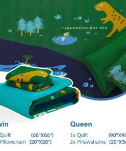 1. Edredón 100% algodón: El edredón gemelo está hecho de 100% algodón, más saludable y transpirable. Suavidad, amigable con la piel y duradero. 2. Patrón lindo para niños: Lindo edredón para niños con diseño de dinosaurio y ballena en colores verde y azul marino, artesanía de doble costura, edredón tamaño gemelo que combina bien con la sala de estar de tus hijos y la decoración del hogar. 3. Juego de edredón de 2 piezas: 1 edredón gemelo (86 x 68 pulgadas) 1 funda de almohada (20 x 28 pulgadas), combina perfectamente con tu cama tamaño gemelo y es una bonita decoración para el hogar. 4. Edredón para todas las estaciones: El edredón tamaño gemelo, ligero pero cálido, puede utilizarse como manta en primavera y verano, y como juego de cubrecama en otoño e invierno. 5. Instrucciones de cuidado: Lavar a máquina por separado en agua fría, secar a baja temperatura, no usar lejía. El juego de edredón gemelo de algodón seguirá siendo cálido, cómodo y con la misma forma suave después de cada lavado.