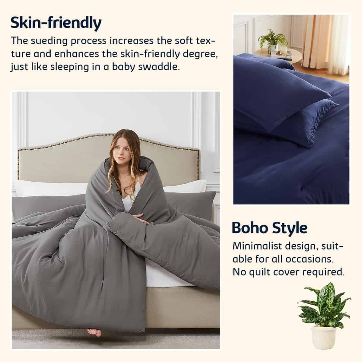 1. Extremadamente Suave y Esponjoso: Microfibra lavada al 100% y un proceso productivo premium ofrecen una sensación ultra suave. El juego de edredón gemelo está relleno de microfibra alternativa al plumón transpirable, ofreciendo una comodidad tipo nube que te permite disfrutar de tu sueño toda la noche.