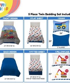 1. DISEÑO DULCE Y JUGUETÓN – El set de cama gemelo incluye (1) funda de edredón gemelo de 68 x 88 pulgadas, (1) sábana ajustable de 39 x 75 pulgadas, (1) sábana plana de 66 x 96 pulgadas, (1) funda de almohada estándar de 20 x 30 pulgadas y (1) almohada de 20 x 26 pulgadas. ¡Nuestro material suave de microfibra permitirá que su hijo se duerma y que empiecen los sueños alegres! 2. CUIDADO SIMPLE Y FÁCIL – ¡Nuestro tejido transpirable es súper suave y genial durante todo el año! Para limpiar, lavar a máquina en frío. Secar a baja potencia. 3. DECORACIÓN ATREVIDA Y BRILLANTE – Haz que la hora de dormir sea la mejor parte del día con nuestro juego de cama caprichoso, que presenta un diseño de sitio de construcción absolutamente adorable, en colores vibrantes. 4. COMPRA NUESTRAS OTRAS COLECCIONES – Proporcione a su hijo los sueños más dulces con nuestras otras colecciones de ropa de cama – Ropa de cama y accesorios coordinados disponibles (se venden por separado). 5. SOBRE LA MARCA – Descubre un mundo de ropa de cama, cuidadosamente diseñado para niños pequeños, preescolares y para los jóvenes de corazón. En Sunny Side Up, creemos que cada sueño debe ser una aventura encantadora, por lo que hemos creado el destino perfecto para todas sus necesidades de ropa de cama. Nuestros juegos de ropa de cama son una celebración de la luminosidad y la felicidad, elaborados con amor para llevar calidez y confort a cada dormitorio. ¡Abraza el lado más soleado del sueño y deja que los sueños comiencen en la comodidad de la ropa de cama de Sunny Side Up!