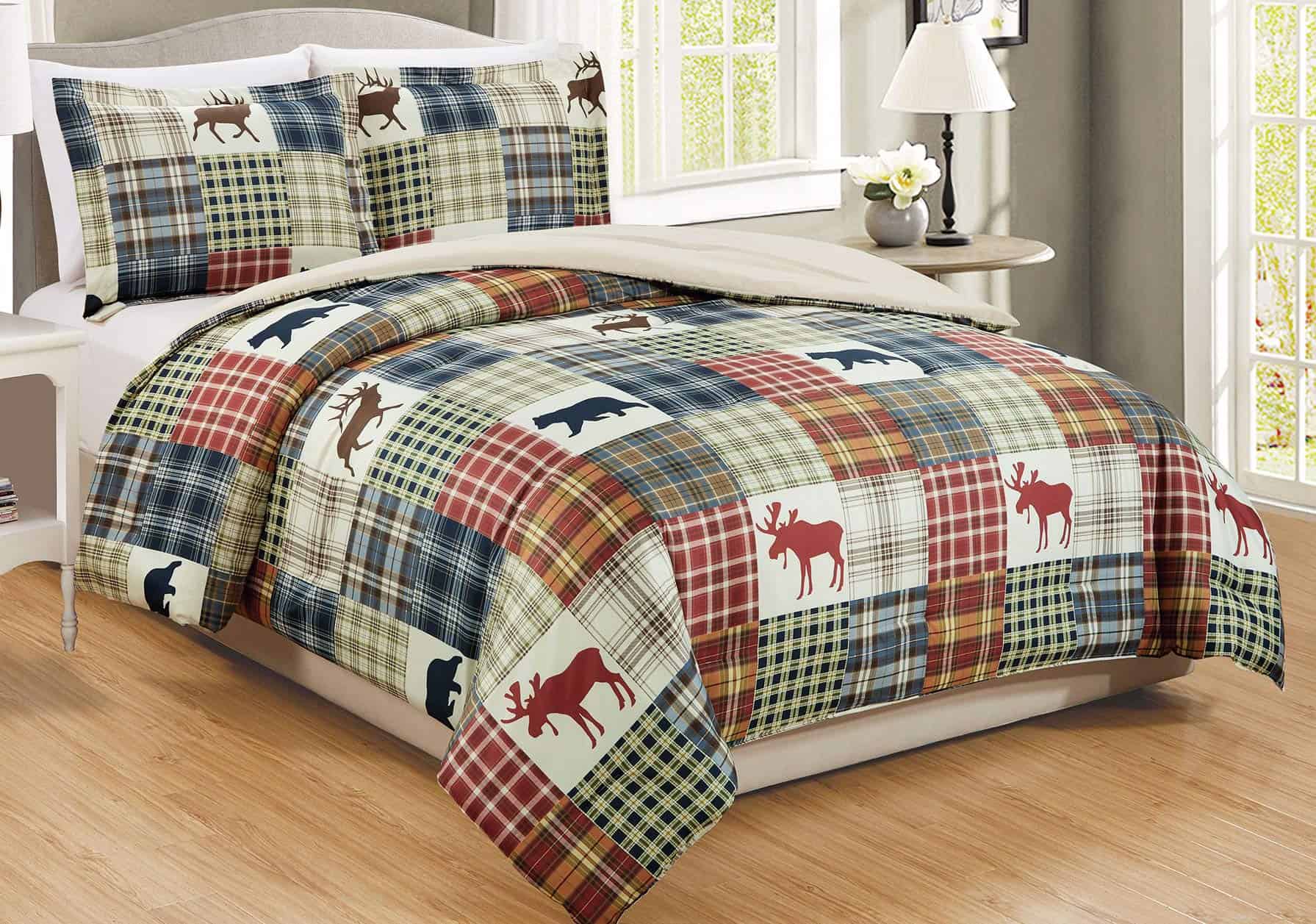 Agregue un toque de clase a su habitación con este set de edredón de diseño de cabaña/lodge de cuadros King / Cal King de 3 piezas.