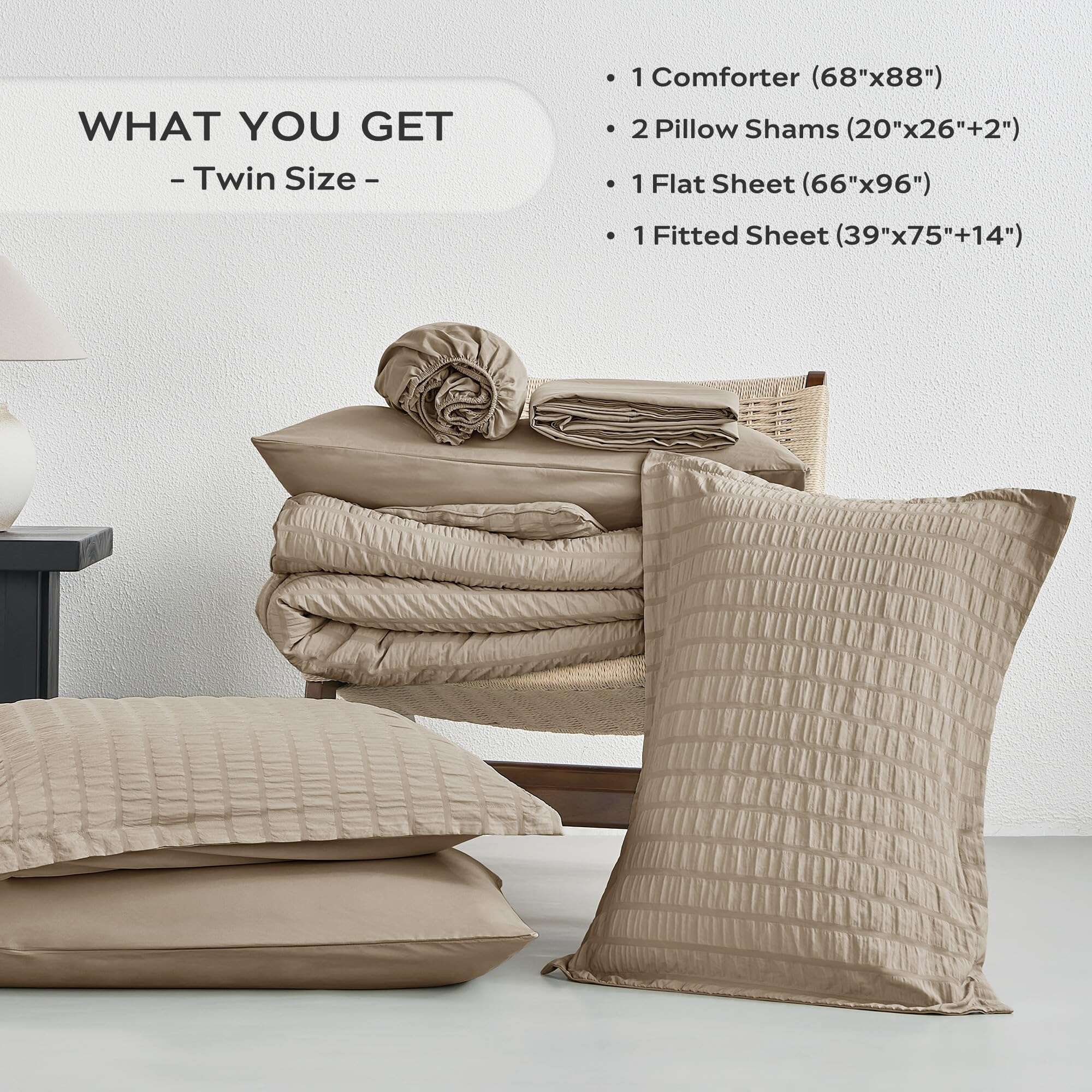 El set completo de tamaño twin viene con 1 edredón (68″x88″), 1 sábana encimera (66″x96″), 1 sábana ajustable (39″x75″+14″), y 2 fundas de almohada (20″x26″+2″). Es un juego de ropa de cama todo en uno que cubre todas tus necesidades para una experiencia de sueño completa.