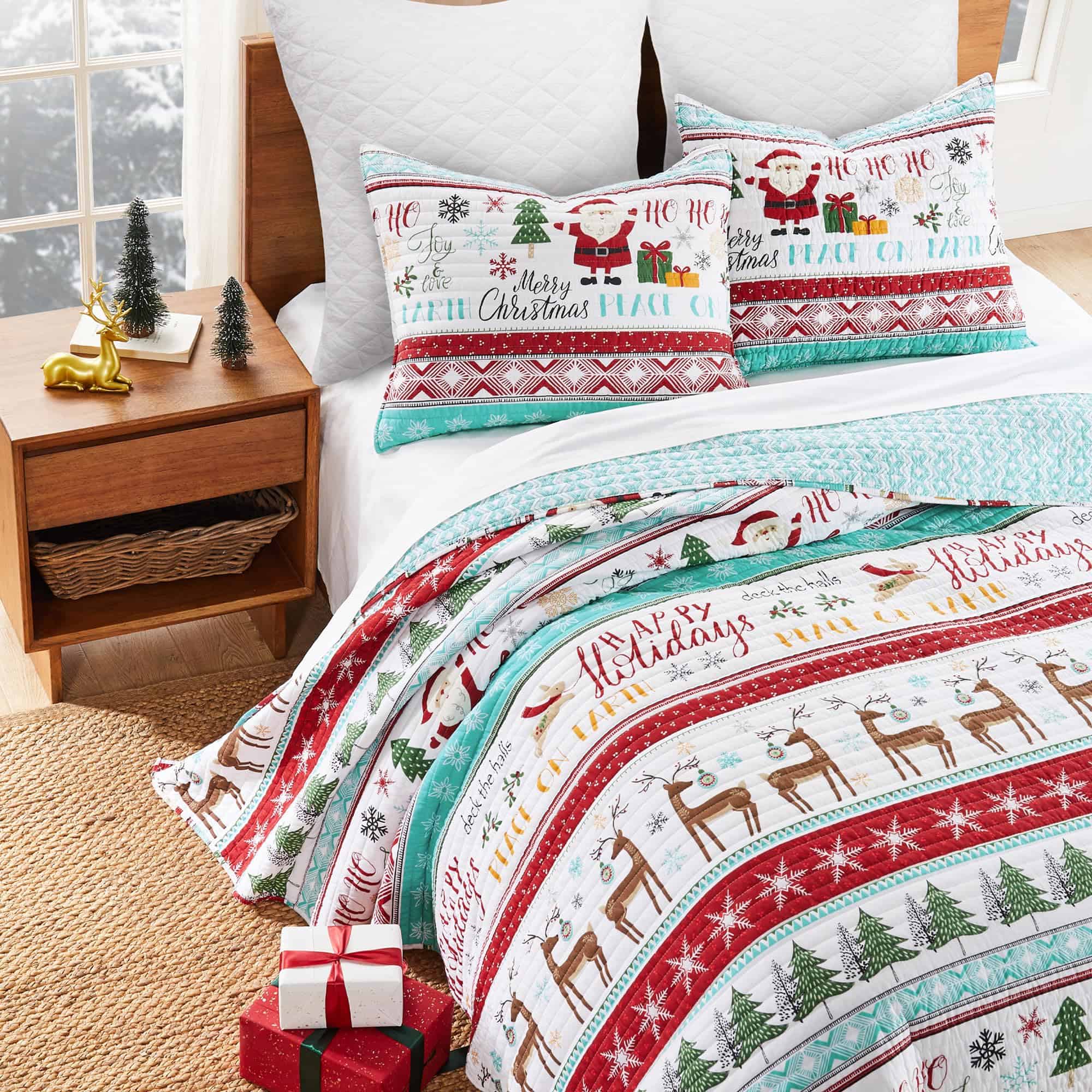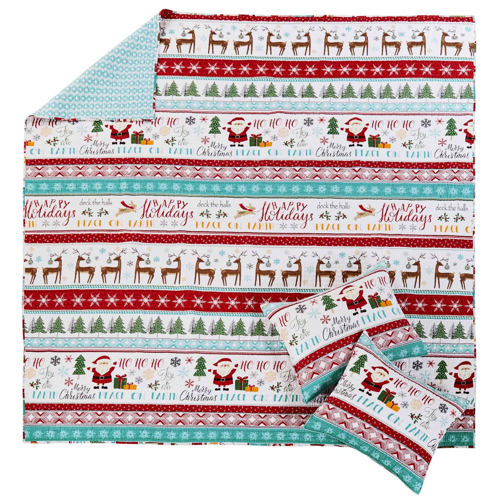 1. DISEÑO: Inspirado en la alegría y la felicidad de la temporada navideña, Ho Ho Holidays presenta filas de patrones navideños, ciervos, Papá Noel, copos de nieve y árboles de Navidad, con reverso a un patrón geométrico turquesa y blanco con un borde encuadernado.