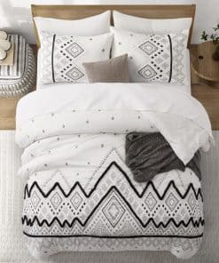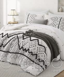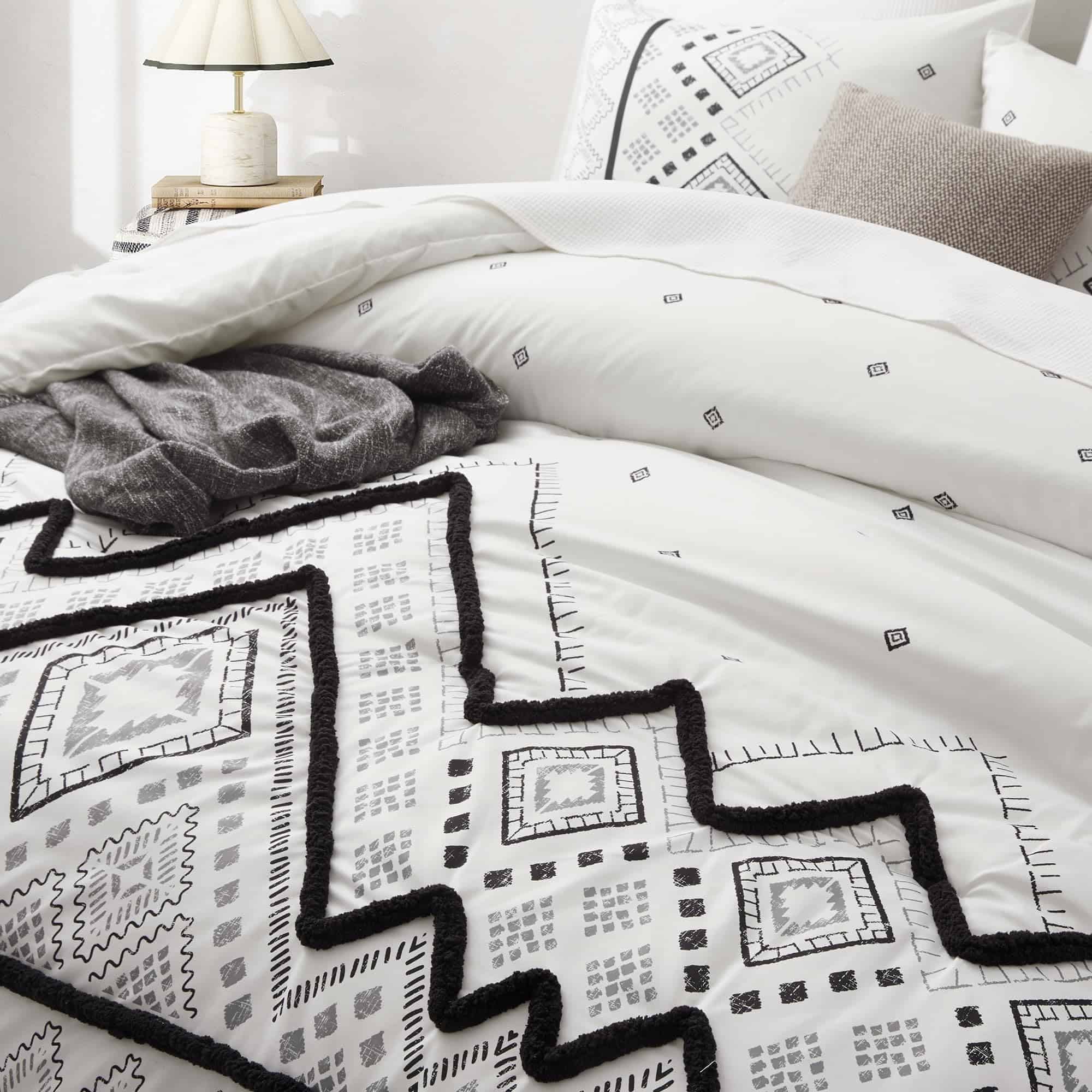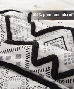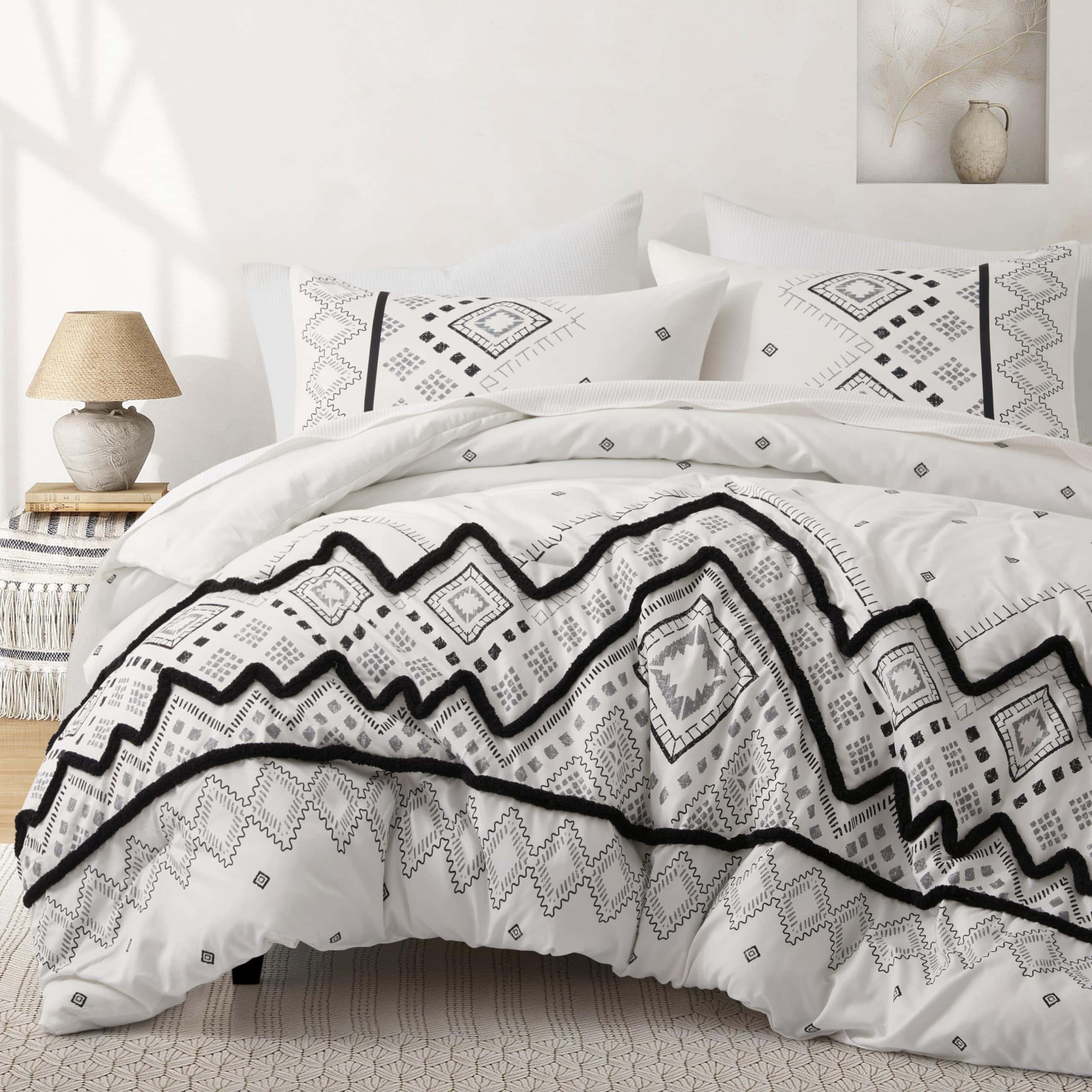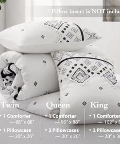 1. Juego de edredón queen de 3 PCS que incluye 1 edredón negro tamaño queen (102″ x 88″) y 2 fundas de almohada con sobres (20″ x 36″, NO incluye almohadas), empaquetado al vacío en una caja decente. 2. Nuestro juego de edredón Oli Anderson con una superficie de microfibra premium al 100%, relleno con fibra de poliéster ultra suave de alta calidad en el interior, combina comodidad y transpirabilidad, te permite estar relajado y despejado todo el día y la noche, con una textura sedosa como caer en una nube. 3. Este juego de ropa de cama con nuevas mejoras en la artesanía siempre mantendrá un buen tacto esponjoso y ligero cuando se coloque sobre la cama, resistente a la suciedad y sin arrugas con un ligero golpeteo. ¡Disfruta jugando con tus amigos y mascota en la cama con menos preocupaciones por favor! 4. Inspirado en estilos bohemios tradicionales, este juego de edredón para cama king imprime un sofisticado patrón geométrico con mechones en forma de chevron estereoscópicos y lindos, agrega características exóticas y modernas a tu dormitorio, que también muestran tu gusto único, una buena elección de decoración para regalos de vacaciones para familiares y amigos. 5. Coloca los juegos de ropa de cama en la lavadora con agua fría, secar al sol o secar a baja temperatura está bien, pero por favor no uses lejía. Consejo para calentar: Es normal que el edredón se apelmace y se desplace ligeramente, la paciencia y el golpeteo suave del edredón seco al sol harán que vuelva a esponjarse.