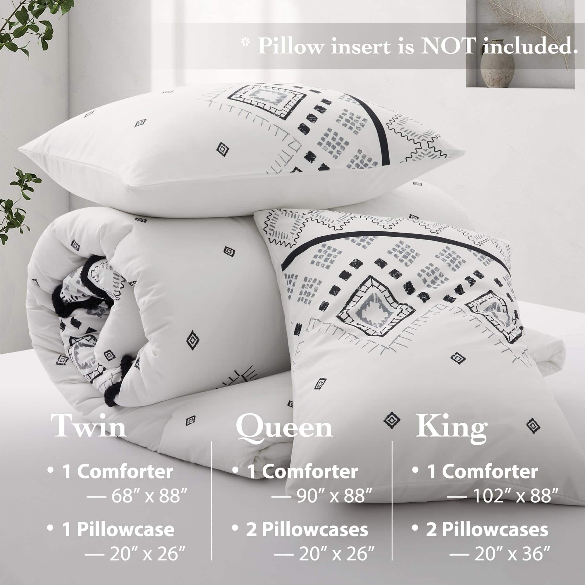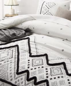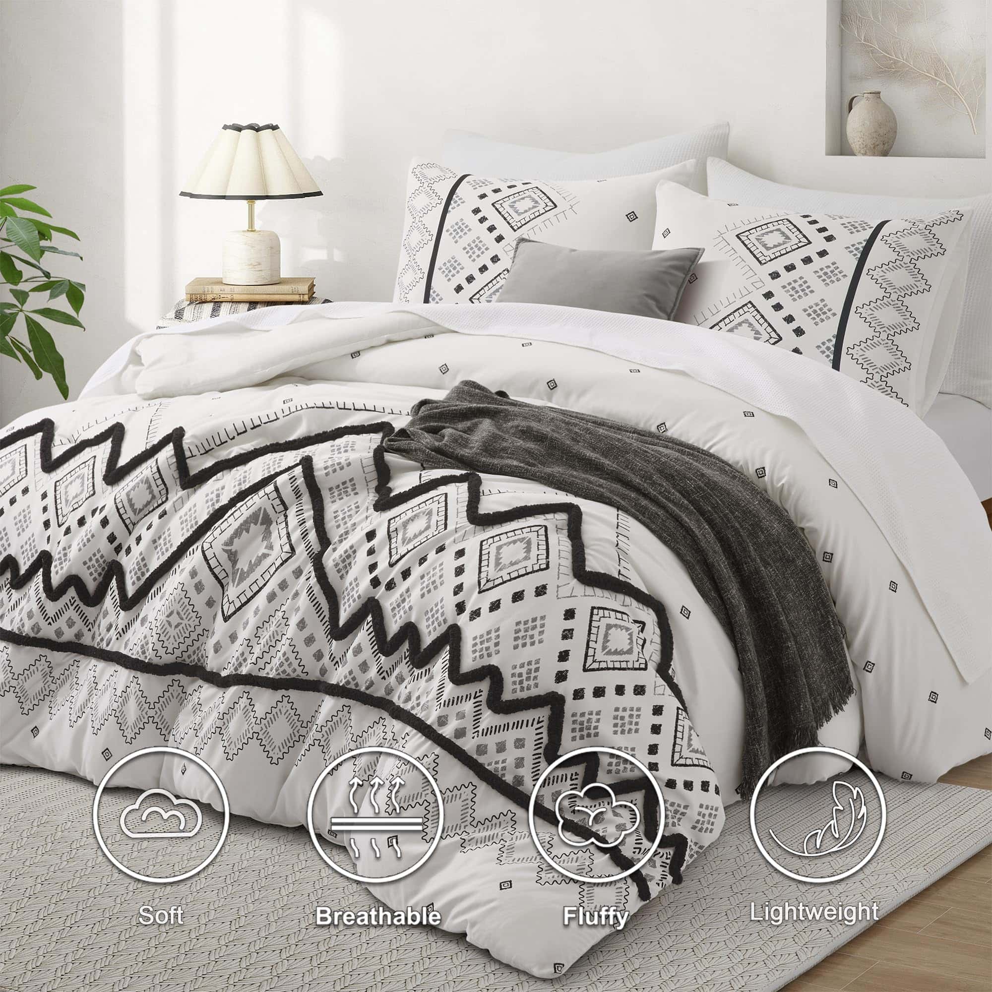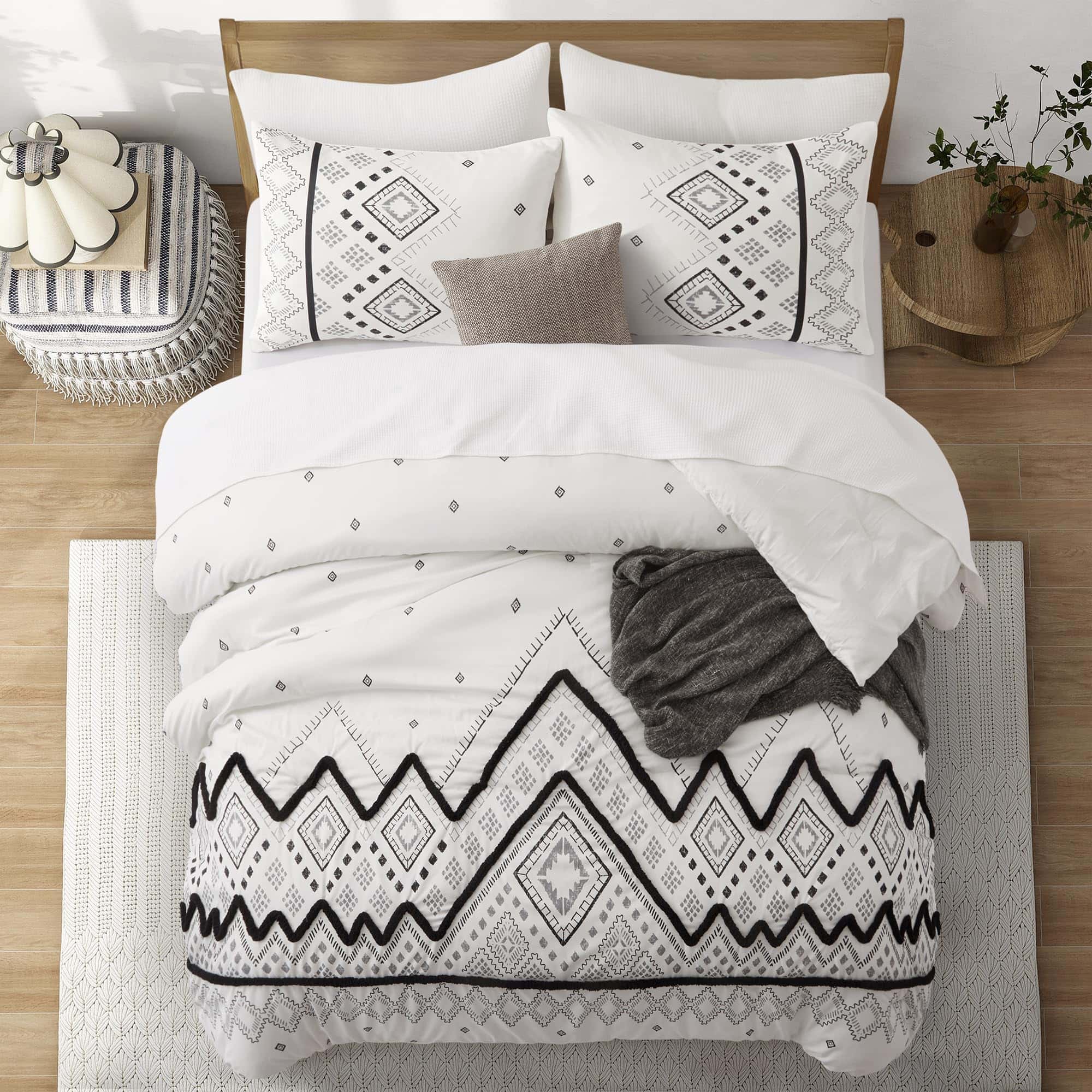1. Juego de edredón queen de 3 PCS que incluye 1 edredón negro tamaño queen (102″ x 88″) y 2 fundas de almohada con sobres (20″ x 36″, NO incluye almohadas), empaquetado al vacío en una caja decente. 2. Nuestro juego de edredón Oli Anderson con una superficie de microfibra premium al 100%, relleno con fibra de poliéster ultra suave de alta calidad en el interior, combina comodidad y transpirabilidad, te permite estar relajado y despejado todo el día y la noche, con una textura sedosa como caer en una nube. 3. Este juego de ropa de cama con nuevas mejoras en la artesanía siempre mantendrá un buen tacto esponjoso y ligero cuando se coloque sobre la cama, resistente a la suciedad y sin arrugas con un ligero golpeteo. ¡Disfruta jugando con tus amigos y mascota en la cama con menos preocupaciones por favor! 4. Inspirado en estilos bohemios tradicionales, este juego de edredón para cama king imprime un sofisticado patrón geométrico con mechones en forma de chevron estereoscópicos y lindos, agrega características exóticas y modernas a tu dormitorio, que también muestran tu gusto único, una buena elección de decoración para regalos de vacaciones para familiares y amigos. 5. Coloca los juegos de ropa de cama en la lavadora con agua fría, secar al sol o secar a baja temperatura está bien, pero por favor no uses lejía. Consejo para calentar: Es normal que el edredón se apelmace y se desplace ligeramente, la paciencia y el golpeteo suave del edredón seco al sol harán que vuelva a esponjarse.