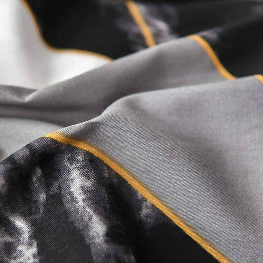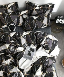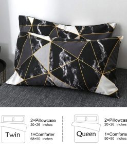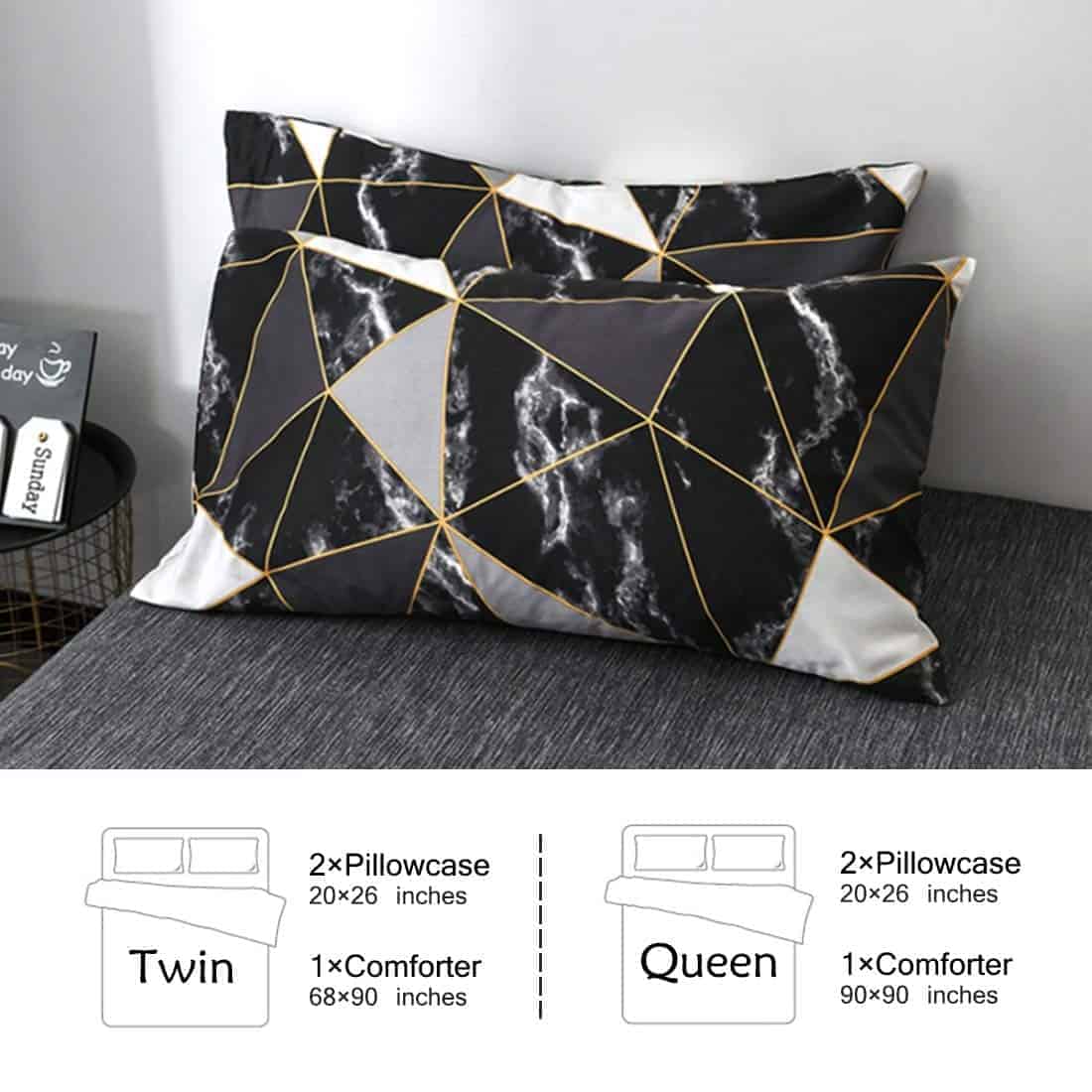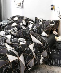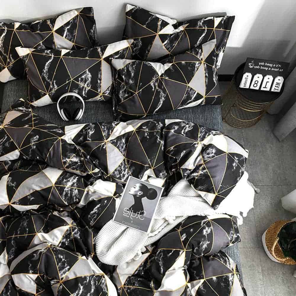 Suave y moderno juego de edredón Cottonight en elegante diseño de mármol negro y patrón geométrico de triángulos. Crea un ambiente sofisticado y casual en tu dormitorio con este juego de edredón. El acogedor edredón es la manera perfecta de agregar un ambiente relajado a tu habitación. Fácil cuidado: Lavar a máquina en ciclo suave o delicado, utilizando agua fría o tibia. Luego secar el edredón a fuego lento o dejarlo secar al aire. Por favor, no usar lejía. Nunca utilice ningún blanqueador o solución de tratamiento de color. Más sobre nuestro servicio: Somos un equipo responsable. Si tienes algún problema, no dudes en contactarnos directamente para que podamos ayudarte rápidamente. Y ofrecemos servicio de devolución / reemplazo de 30 días y 3 meses de garantía de calidad. Te deseamos una feliz compra. Gracias.
